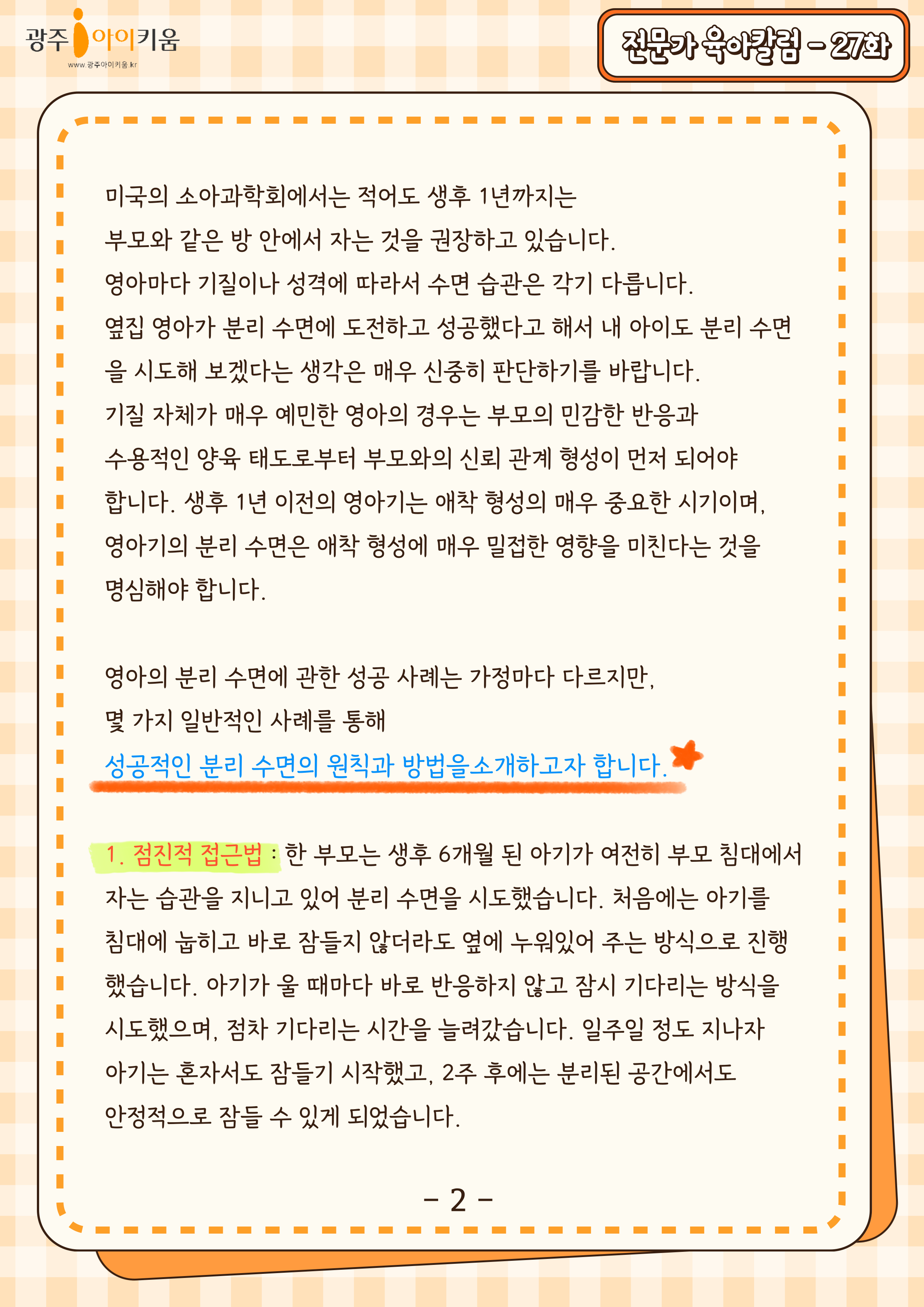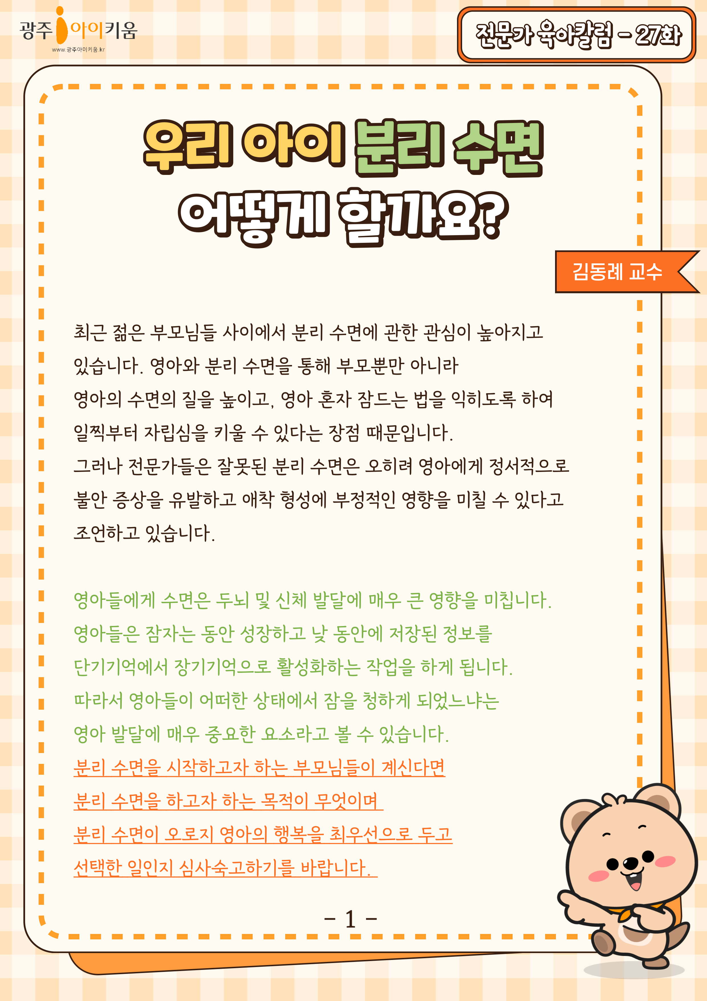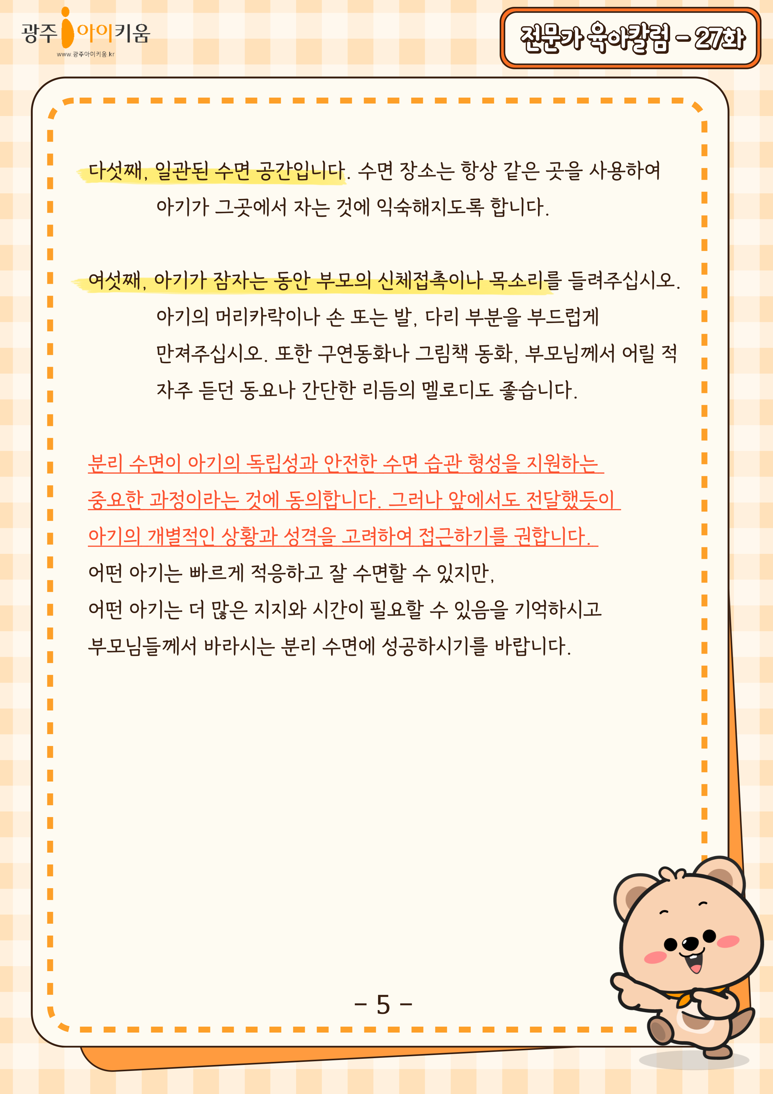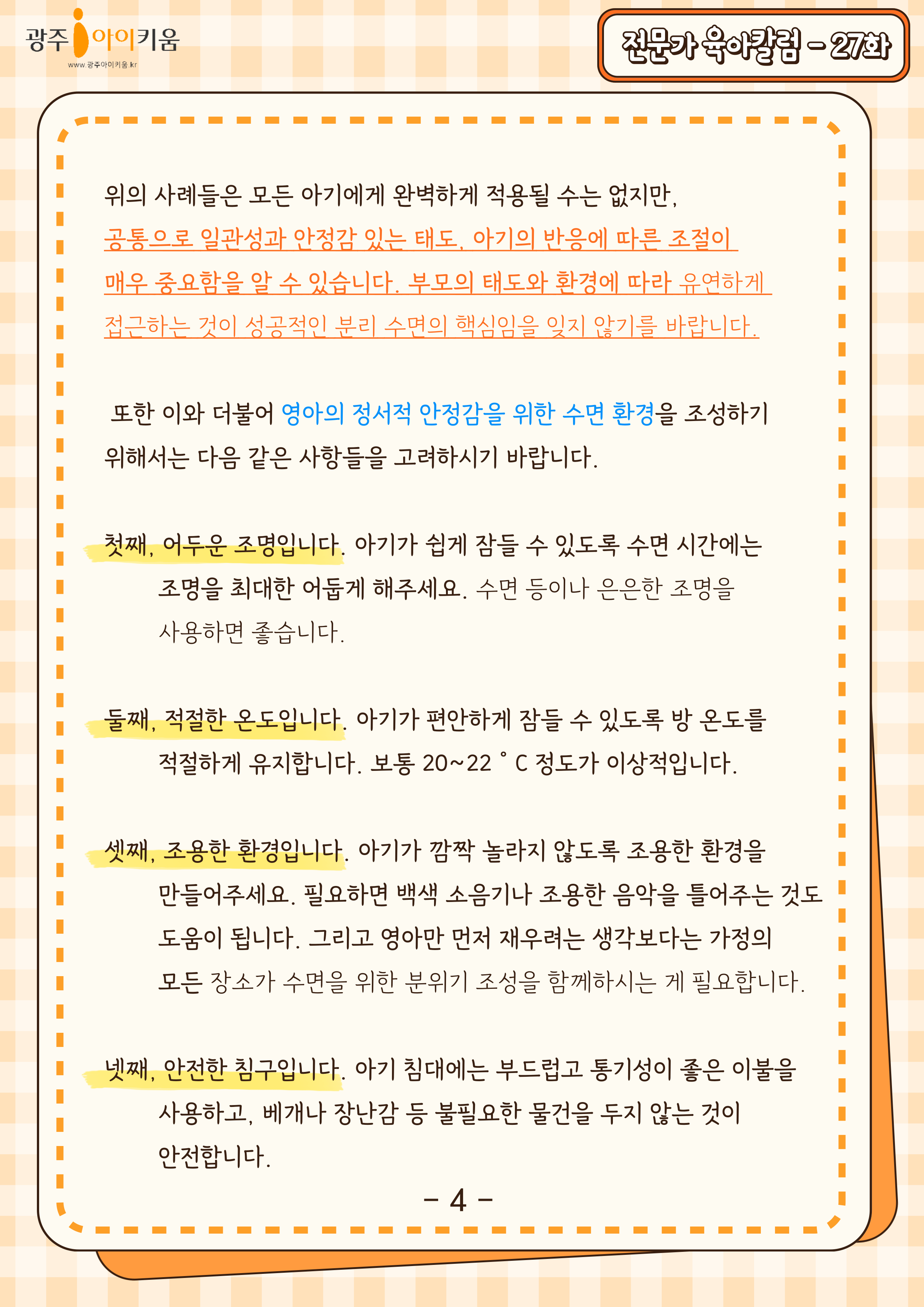 home 맘편한 내★일, 광주아이키움2.0 결혼·임신·출생 영유아 초·중·고 다양한 가족 일생활균형 커뮤니티 아동돌봄지원 소통방 나눔방 광주 아이키움 상담방 돌봄정보방 성폭력 피해 상담 및 사건지원 공지사항 이벤트소식 참여게시판 카드뉴스 동영상 아이키움 칼럼 성평등 육아웹툰 로고&캐릭터 27화-우리 아이 분리 수면 어떻게 할까요? 등록일 : 2024-10-02 16:27 카테고리 : 카테고리 없음 작성자 : 운영자 조회수 : 542 목록