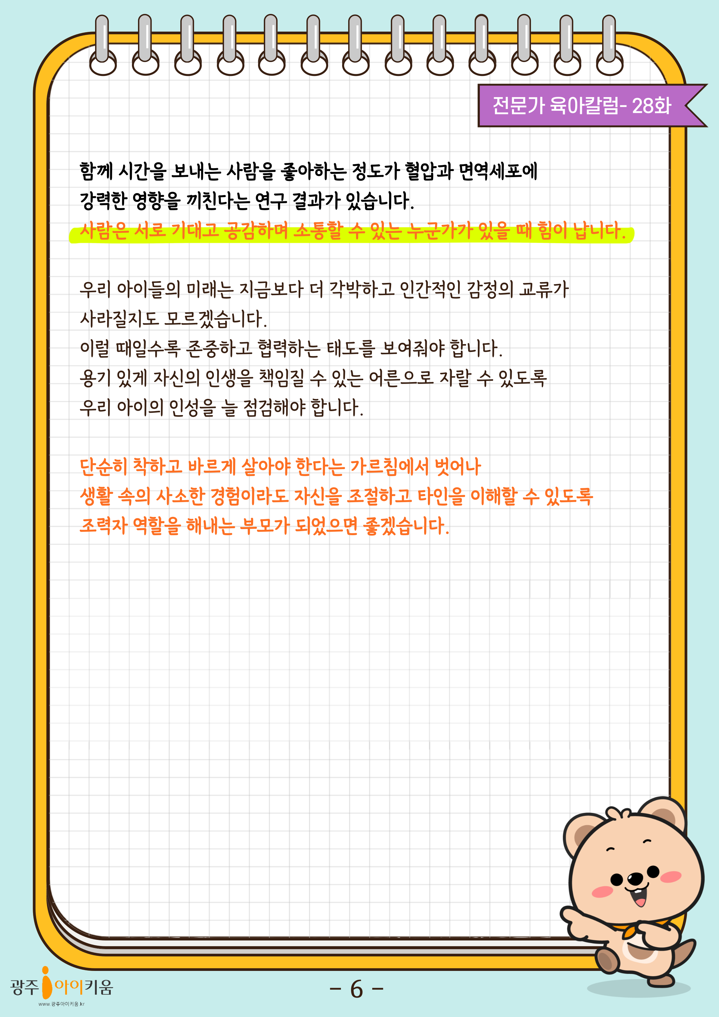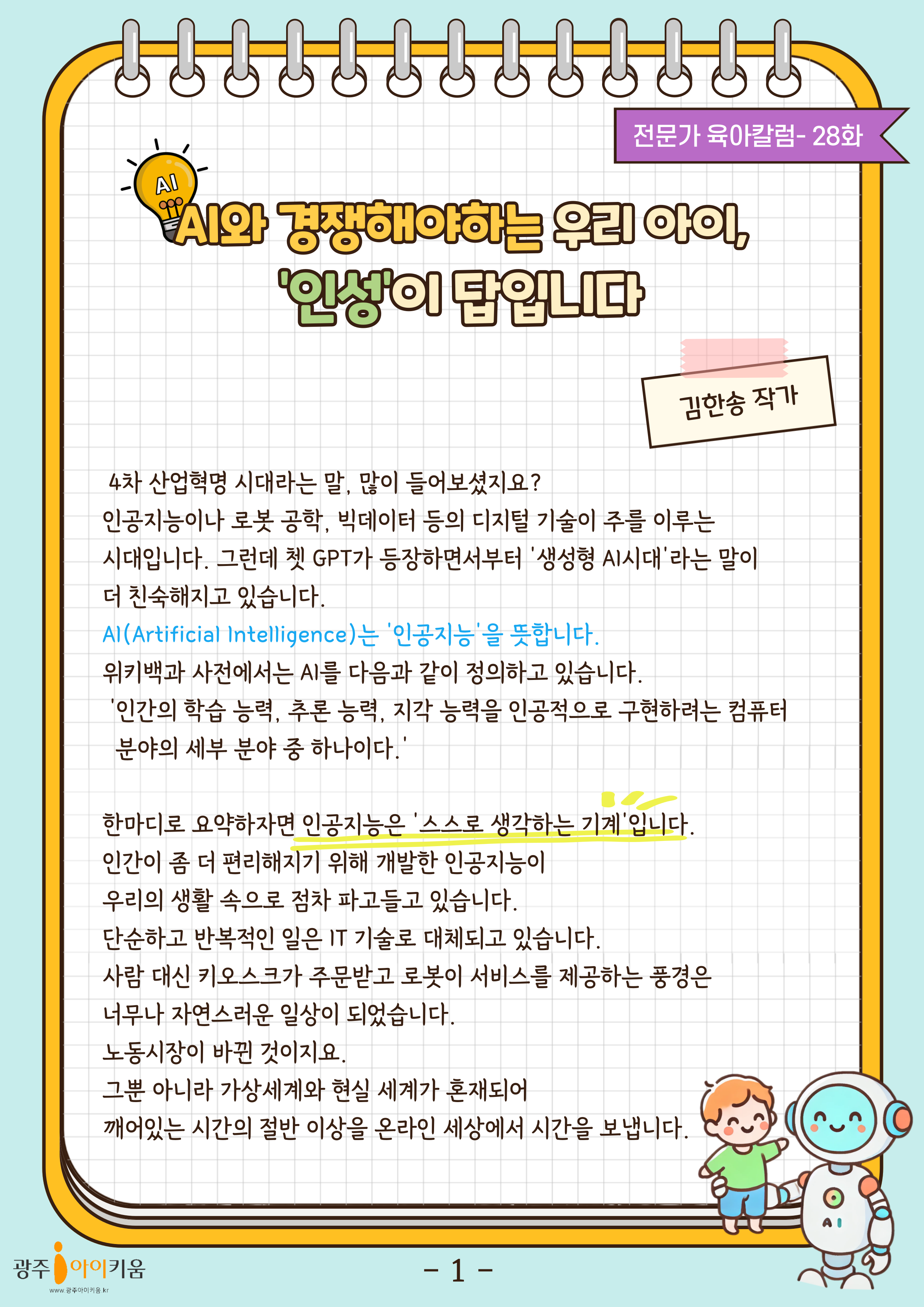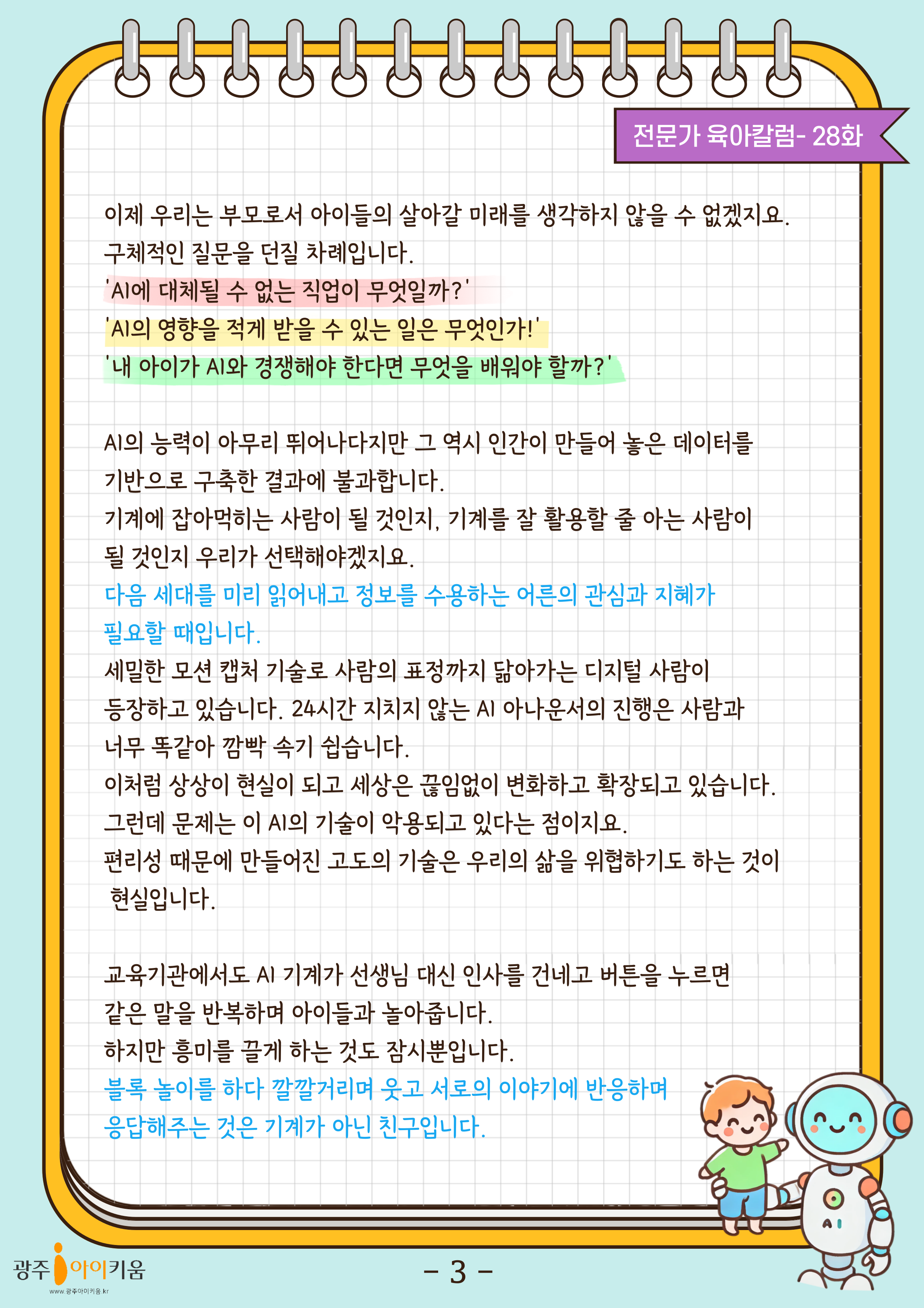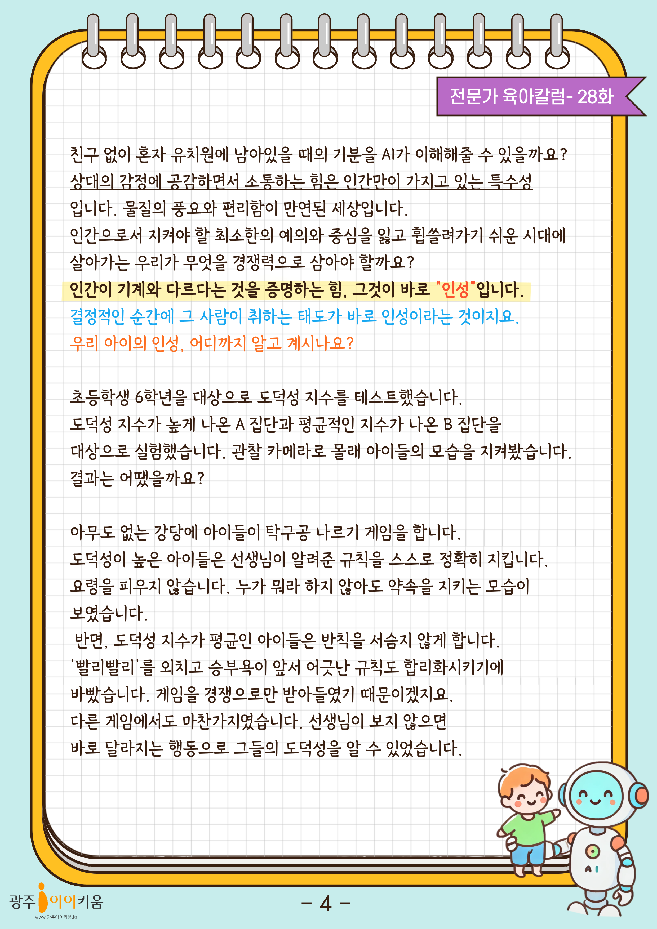 home 맘편한 내★일, 광주아이키움2.0 결혼·임신·출생 영유아 초·중·고 다양한 가족 일생활균형 커뮤니티 아동돌봄지원 소통방 나눔방 광주 아이키움 상담방 돌봄정보방 성폭력 피해 상담 및 사건지원 공지사항 이벤트소식 참여게시판 카드뉴스 동영상 아이키움 칼럼 성평등 육아웹툰 로고&캐릭터 28화-AI와 경쟁해야하는 우리 아이, '인성'이 답입니다 등록일 : 2024-10-11 09:29 카테고리 : 카테고리 없음 작성자 : 운영자 조회수 : 560 목록