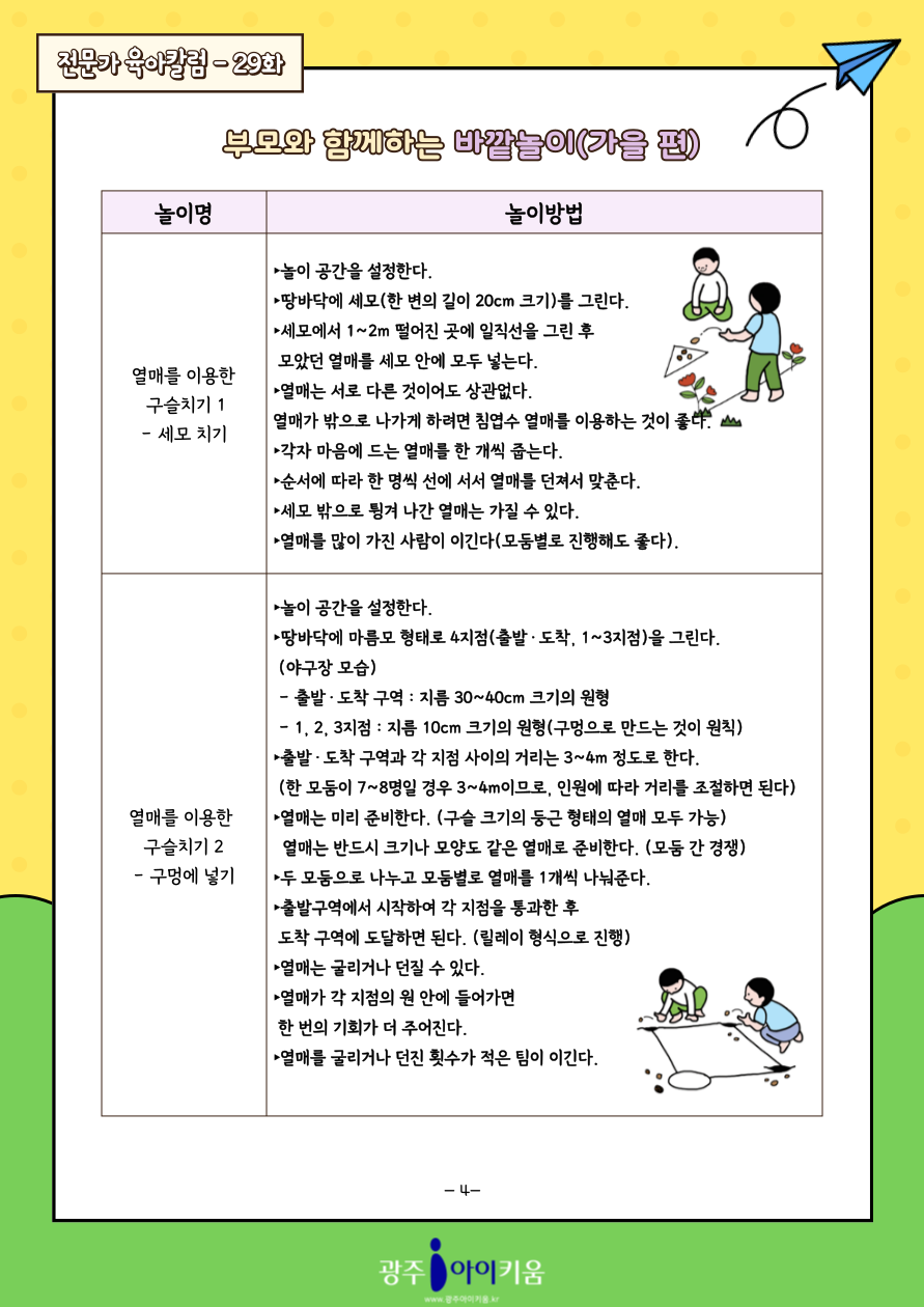 home 맘편한 내★일, 광주아이키움2.0 결혼·임신·출생 영유아 초·중·고 다양한 가족 일생활균형 커뮤니티 아동돌봄지원 소통방 나눔방 광주 아이키움 상담방 돌봄정보방 성폭력 피해 상담 및 사건지원 공지사항 이벤트소식 참여게시판 카드뉴스 동영상 아이키움 칼럼 성평등 육아웹툰 로고&캐릭터 29화-부모와 함께하는 바깥놀이 (가을편) 등록일 : 2024-10-25 10:14 카테고리 : 카테고리 없음 작성자 : 운영자 조회수 : 578 목록