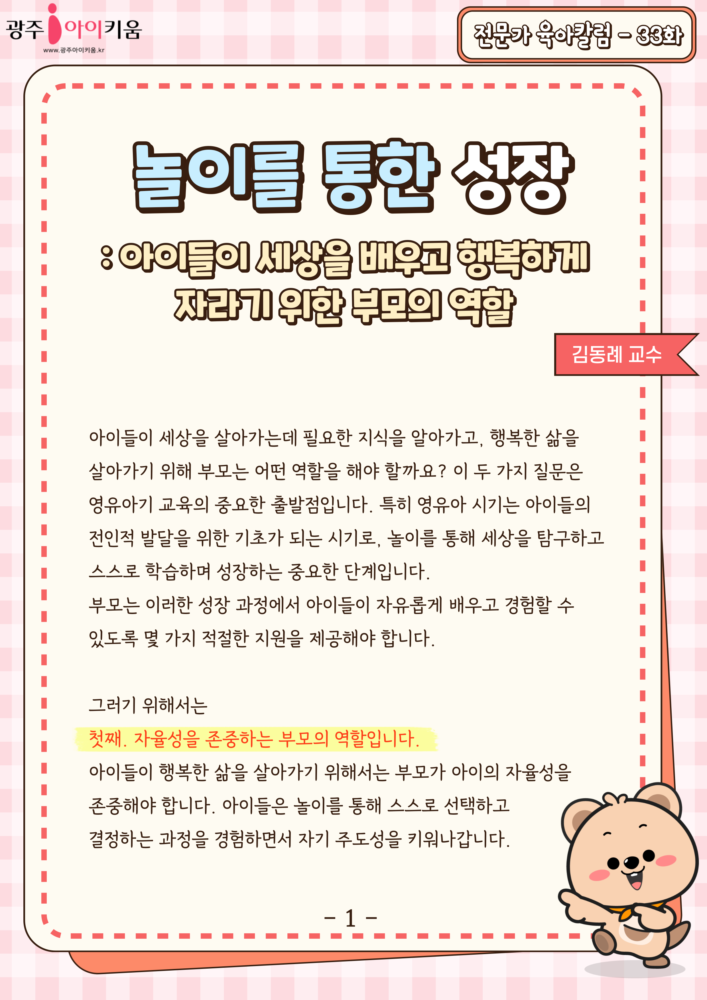 home 맘편한 내★일, 광주아이키움2.0 결혼·임신·출생 영유아 초·중·고 다양한 가족 일생활균형 커뮤니티 아동돌봄지원 소통방 나눔방 광주 아이키움 상담방 돌봄정보방 성폭력 피해 상담 및 사건지원 공지사항 이벤트소식 참여게시판 카드뉴스 동영상 아이키움 칼럼 성평등 육아웹툰 로고&캐릭터 33화- 놀이를 통한 성장 등록일 : 2024-11-27 12:49 카테고리 : 카테고리 없음 작성자 : 운영자 조회수 : 409 목록