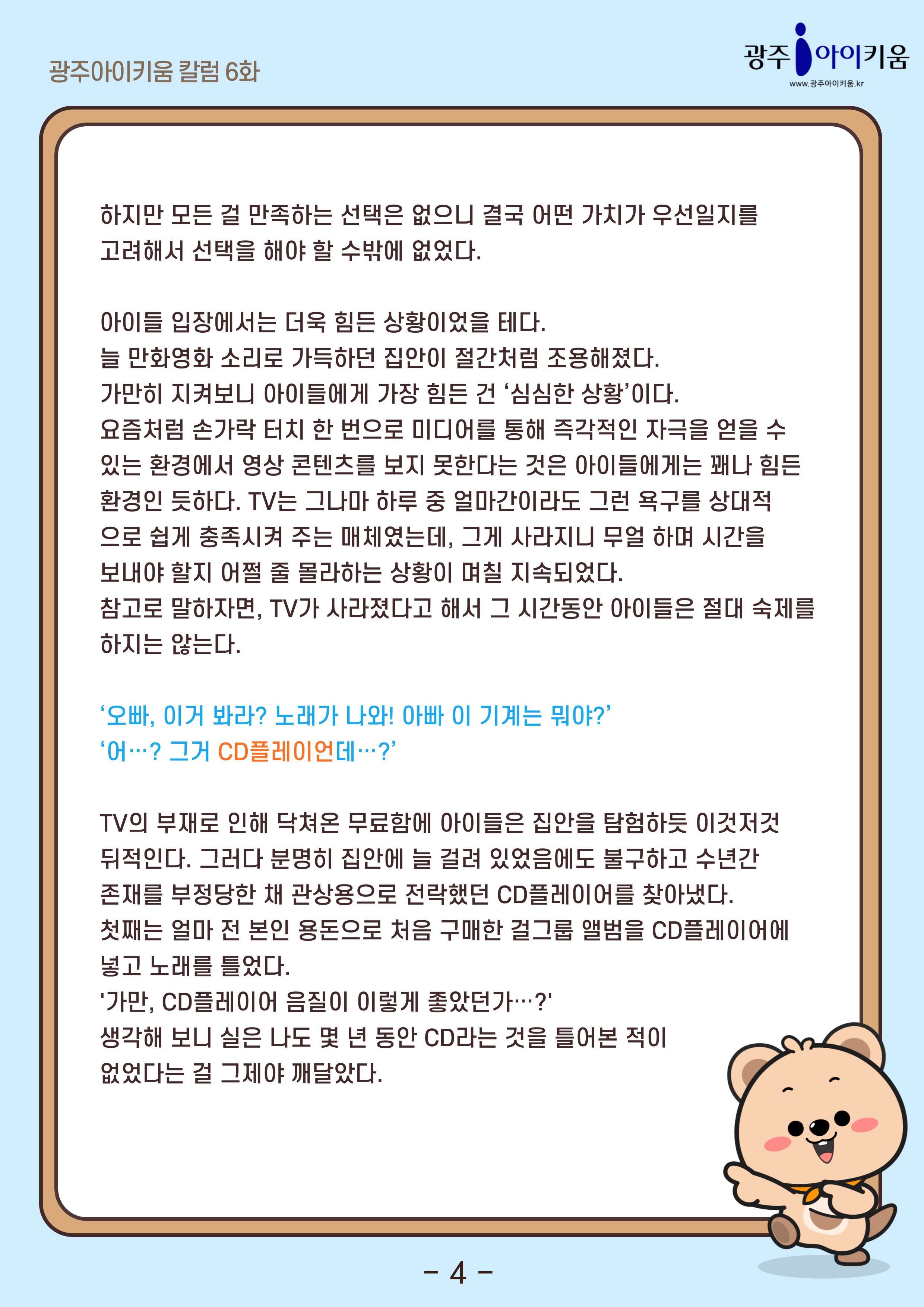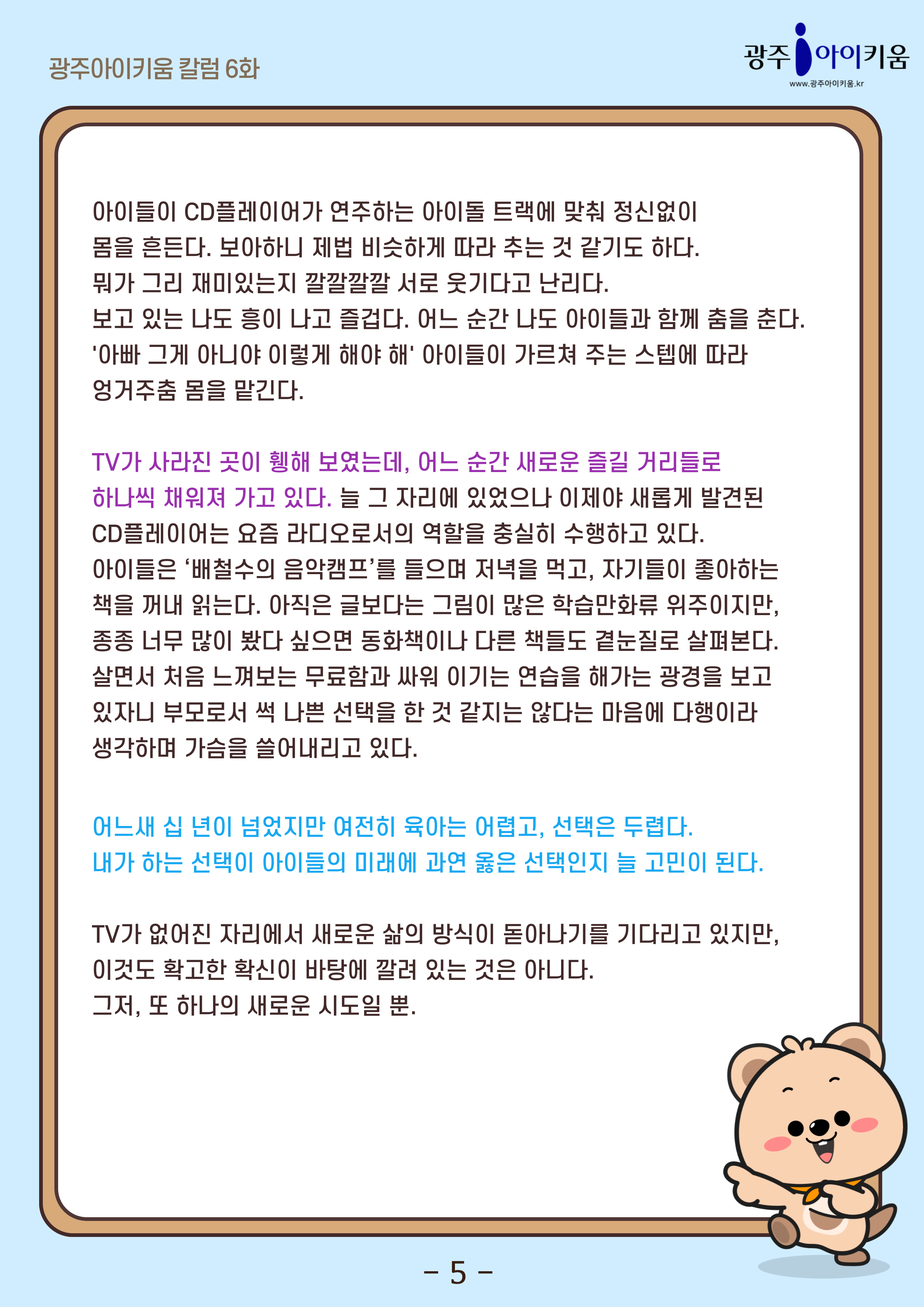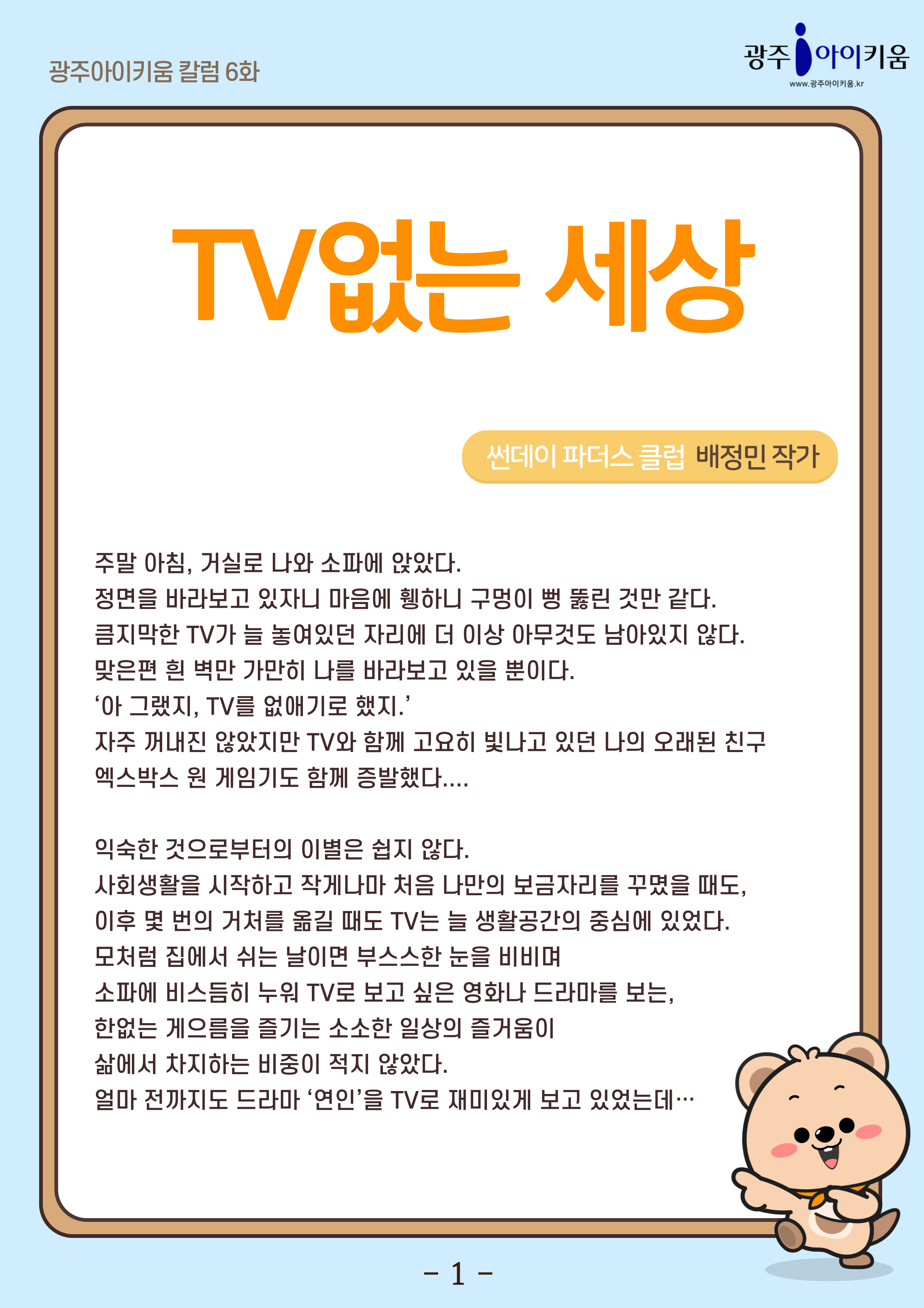 home 맘편한 내★일, 광주아이키움2.0 결혼·임신·출생 영유아 초·중·고 다양한 가족 일생활균형 커뮤니티 아동돌봄지원 소통방 나눔방 광주 아이키움 상담방 돌봄정보방 성폭력 피해 상담 및 사건지원 공지사항 이벤트소식 참여게시판 카드뉴스 동영상 아이키움 칼럼 성평등 육아웹툰 로고&캐릭터 [육아칼럼] 6화 - TV없는 세상 등록일 : 2025-03-14 09:40 카테고리 : 카테고리 없음 작성자 : 운영자 조회수 : 273 첨부파일 000.png 다운로드 목록