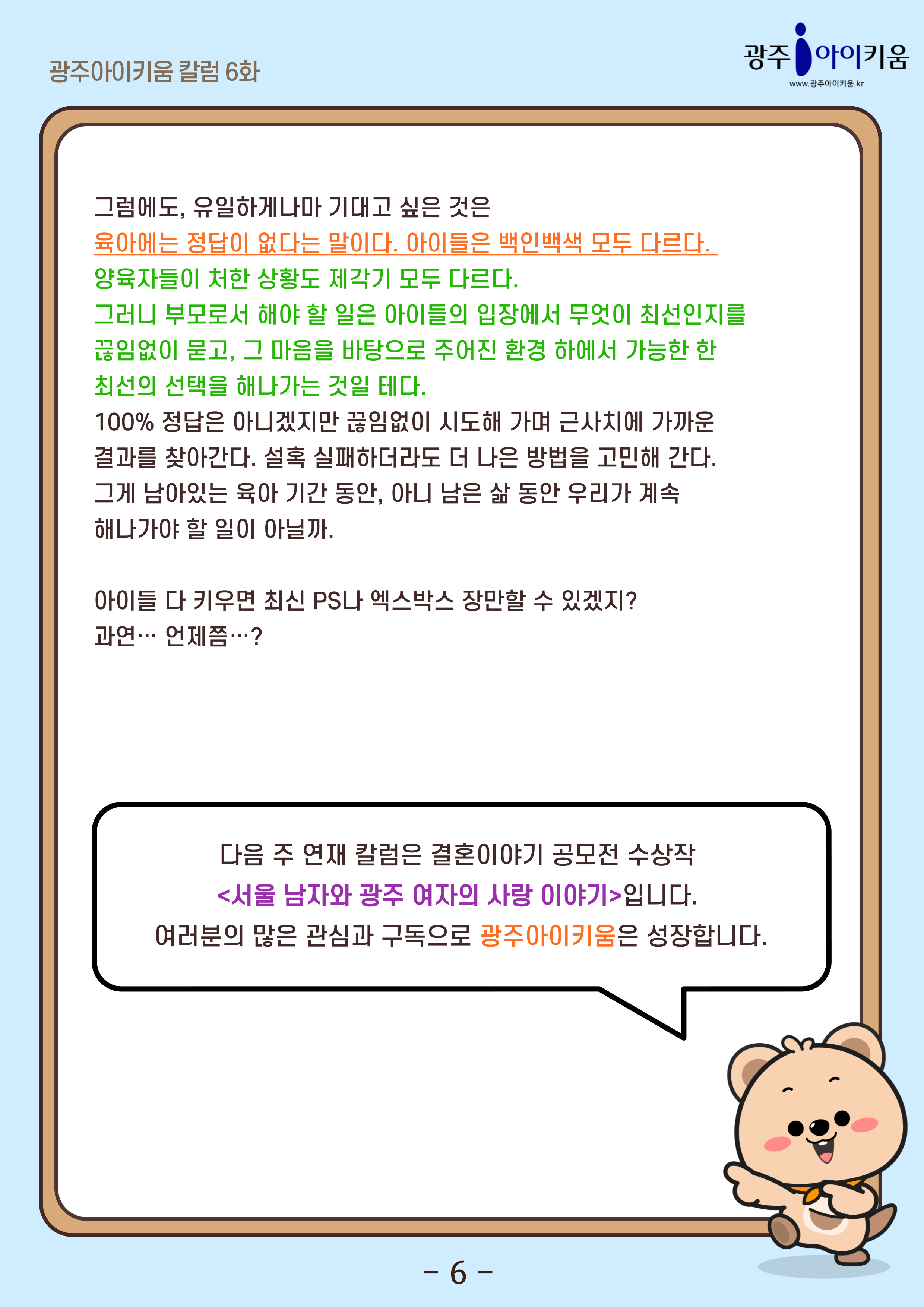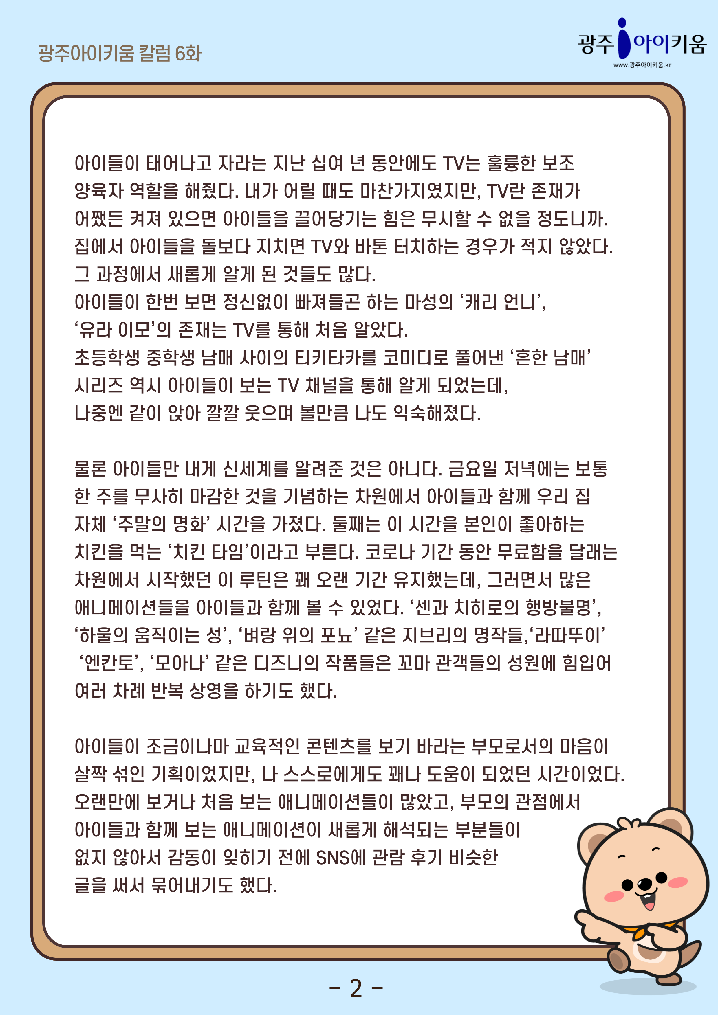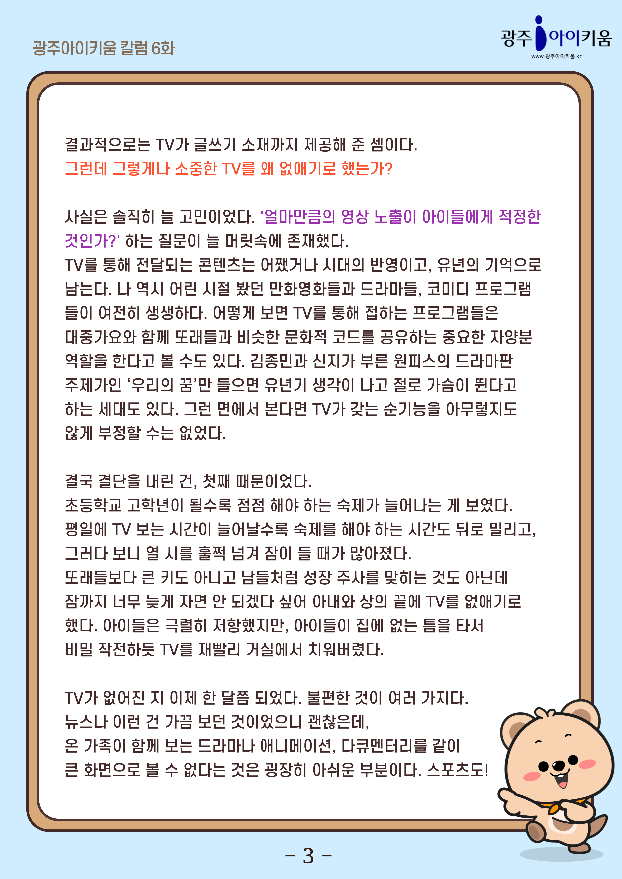 home 맘편한 내★일, 광주아이키움2.0 결혼·임신·출생 영유아 초·중·고 다양한 가족 일생활균형 커뮤니티 아동돌봄지원 소통방 나눔방 광주 아이키움 상담방 돌봄정보방 성폭력 피해 상담 및 사건지원 공지사항 이벤트소식 참여게시판 카드뉴스 동영상 아이키움 칼럼 성평등 육아웹툰 로고&캐릭터 [육아칼럼] 6화 - TV없는 세상 등록일 : 2025-03-14 09:40 카테고리 : 카테고리 없음 작성자 : 운영자 조회수 : 273 첨부파일 000.png 다운로드 목록