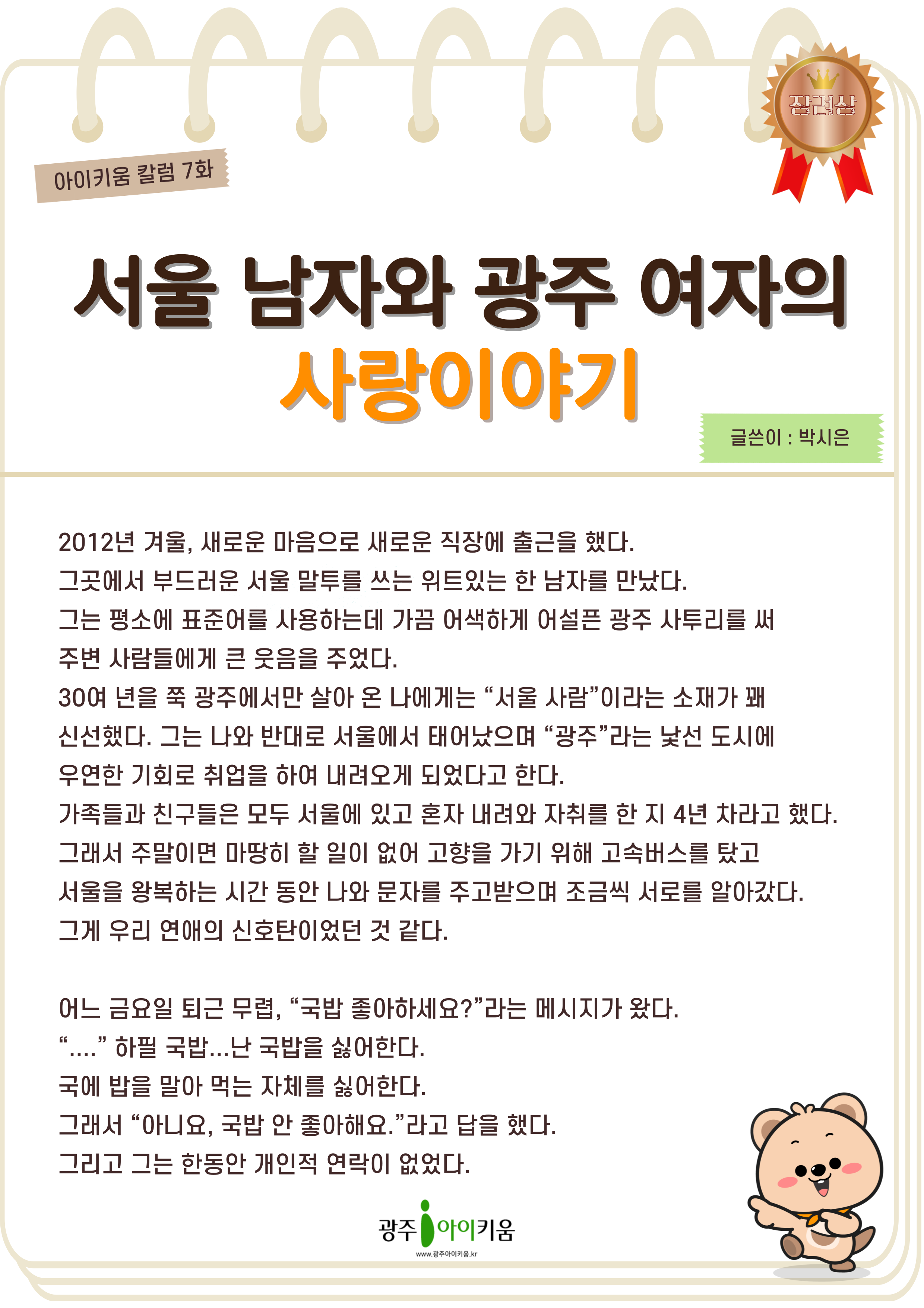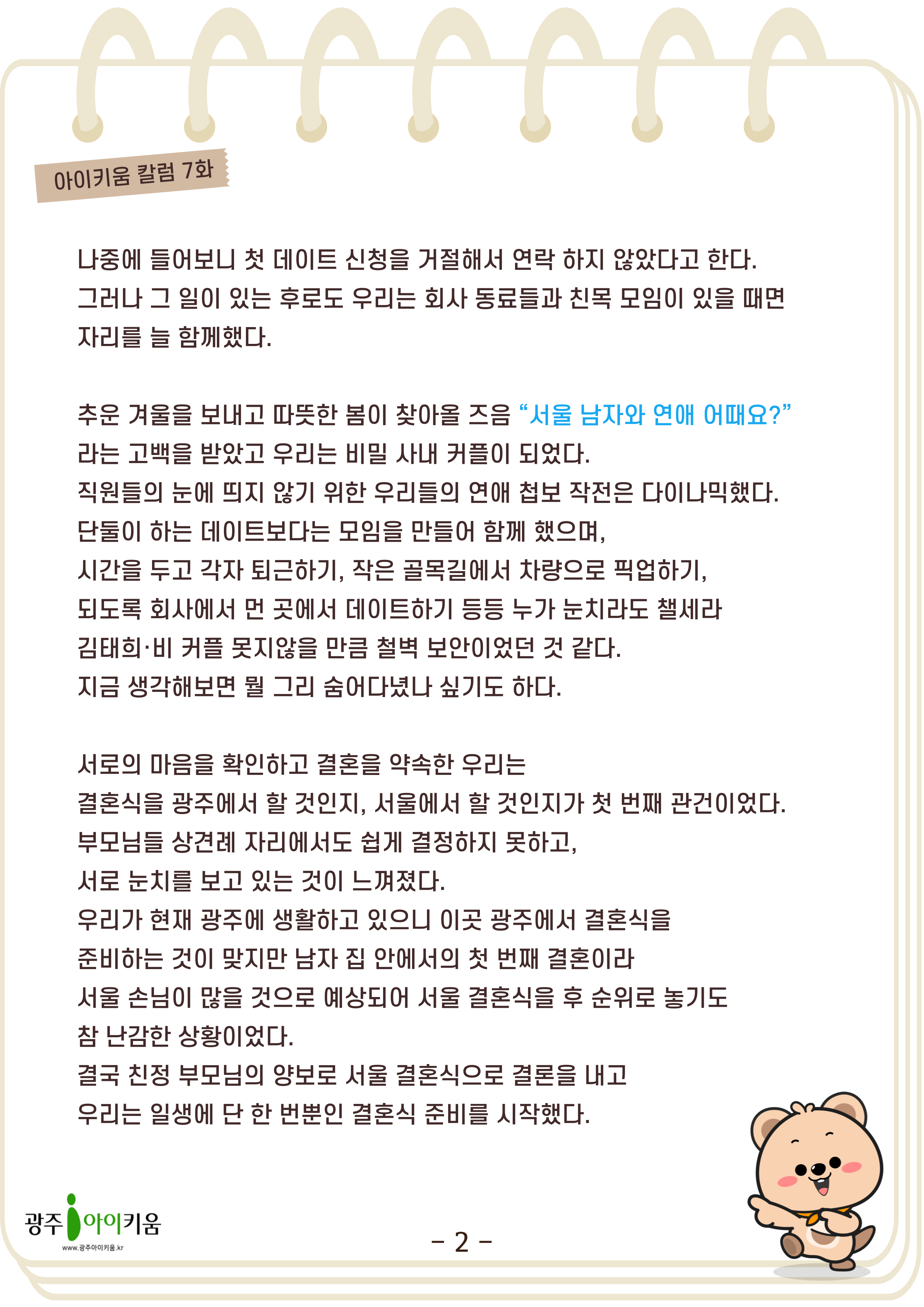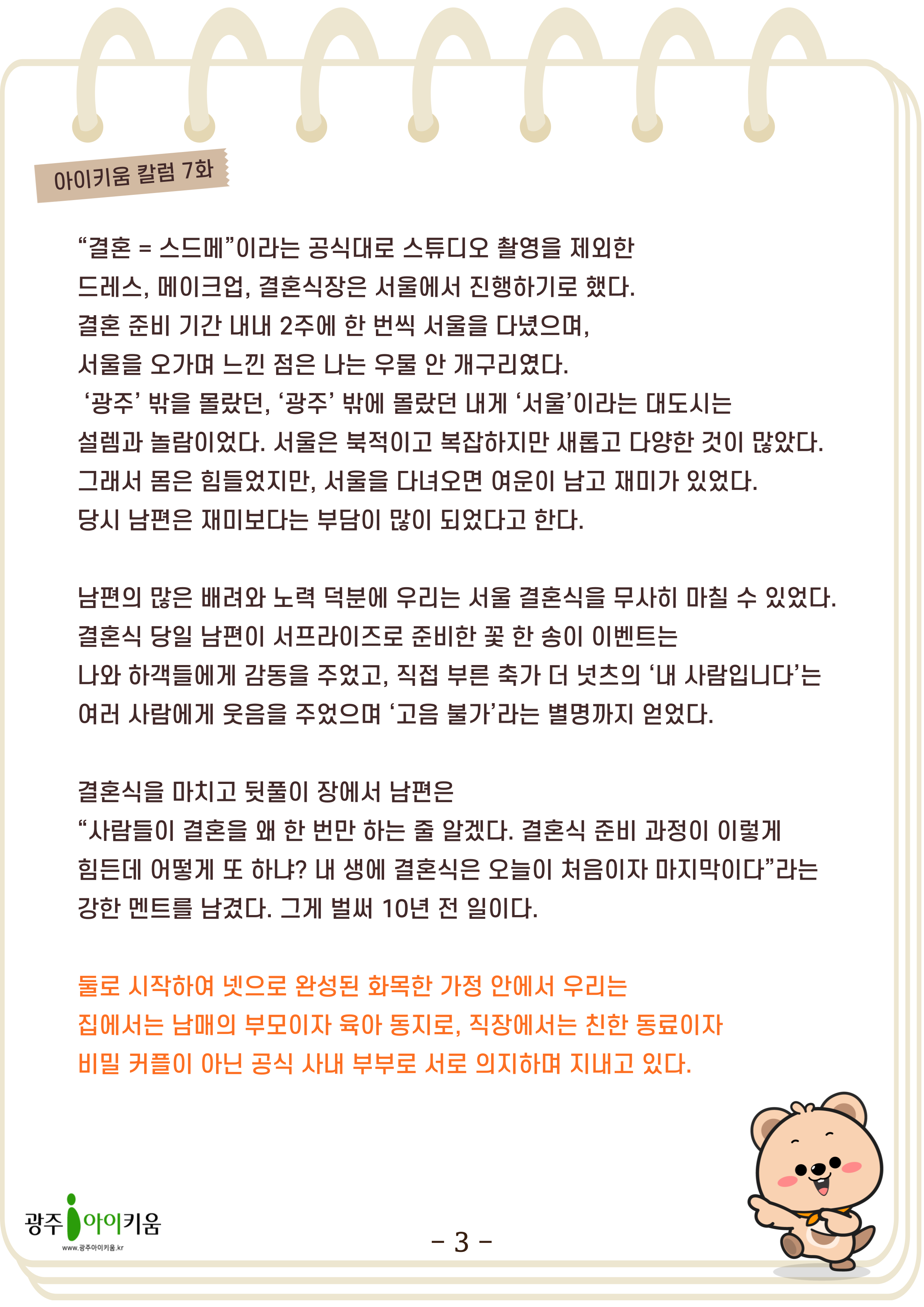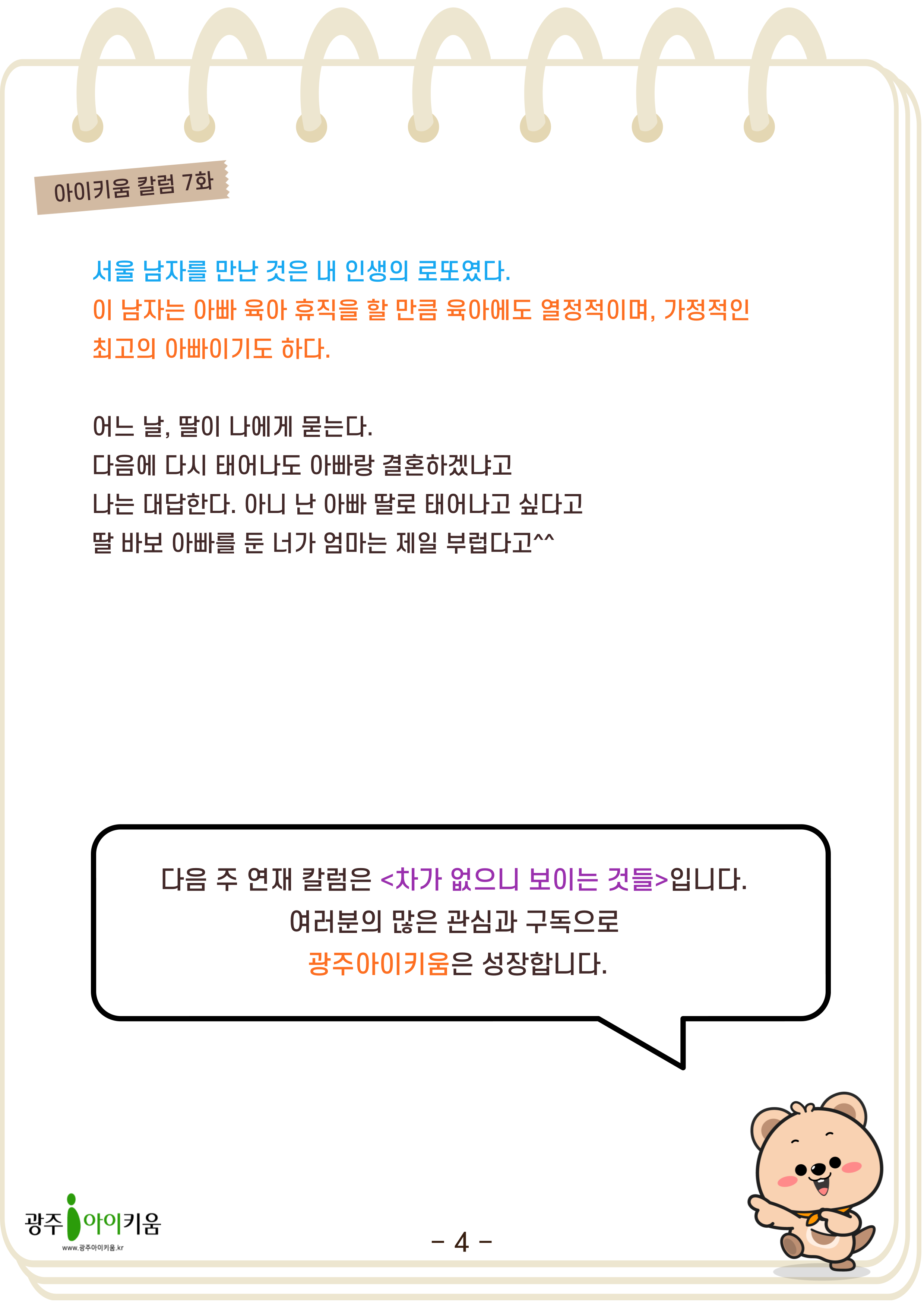 home 맘편한 내★일, 광주아이키움2.0 결혼·임신·출생 영유아 초·중·고 다양한 가족 일생활균형 커뮤니티 아동돌봄지원 소통방 나눔방 광주 아이키움 상담방 돌봄정보방 성폭력 피해 상담 및 사건지원 공지사항 이벤트소식 참여게시판 카드뉴스 동영상 아이키움 칼럼 성평등 육아웹툰 로고&캐릭터 [육아칼럼] 7화 - 서울 남자와 광주 여자의 사랑이야기 등록일 : 2025-03-20 09:44 카테고리 : 카테고리 없음 작성자 : 운영자 조회수 : 292 첨부파일 000.png 다운로드 목록