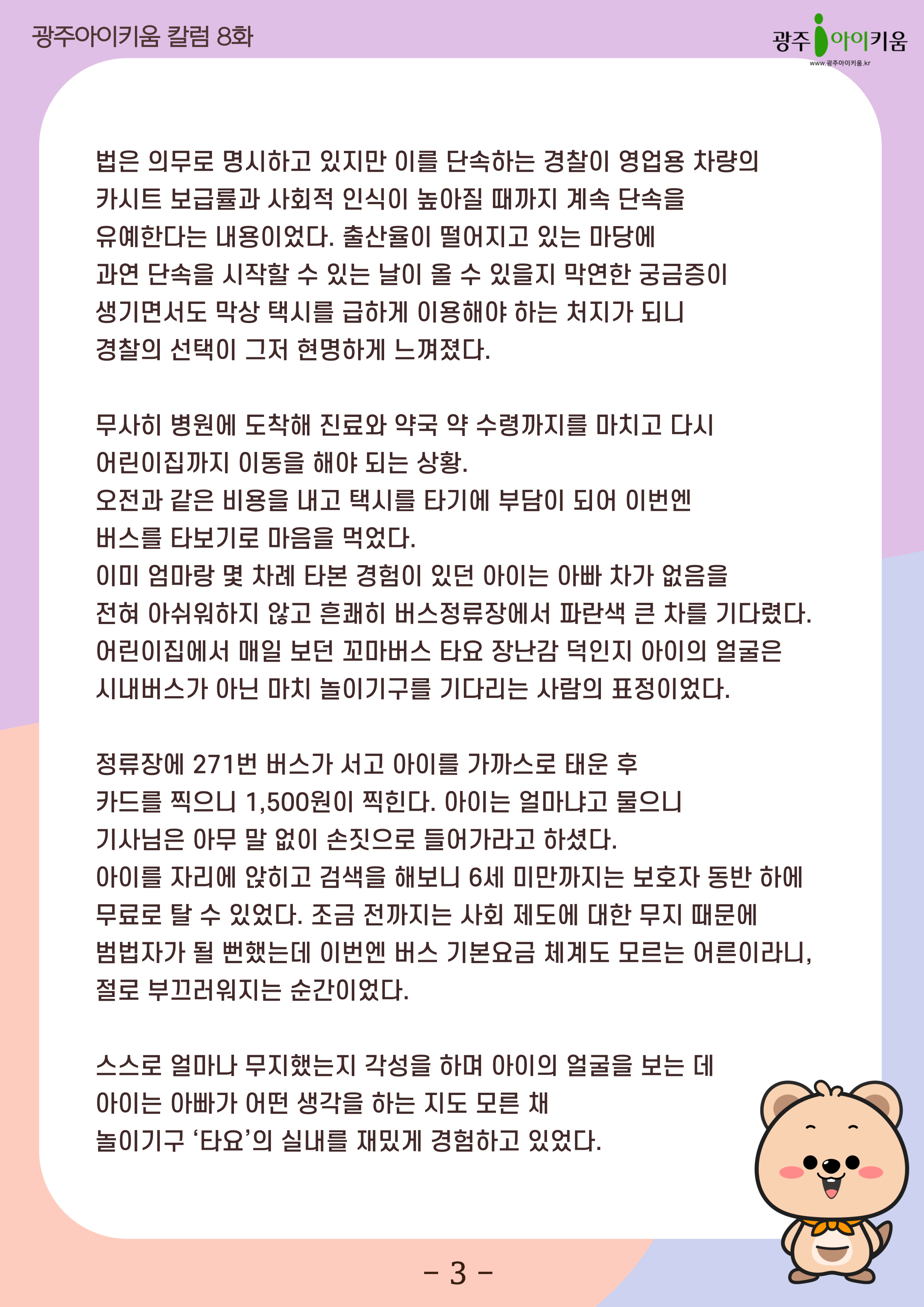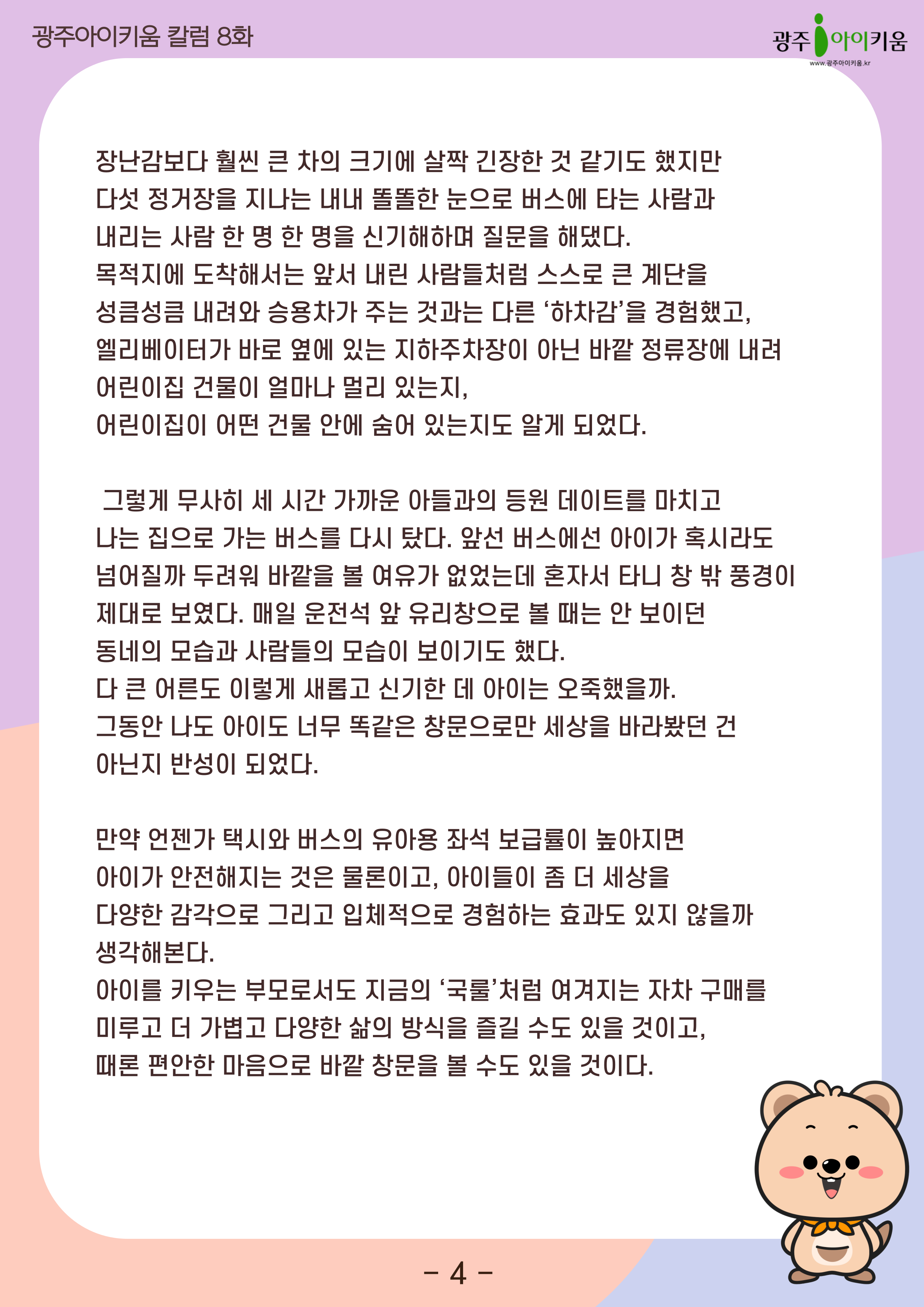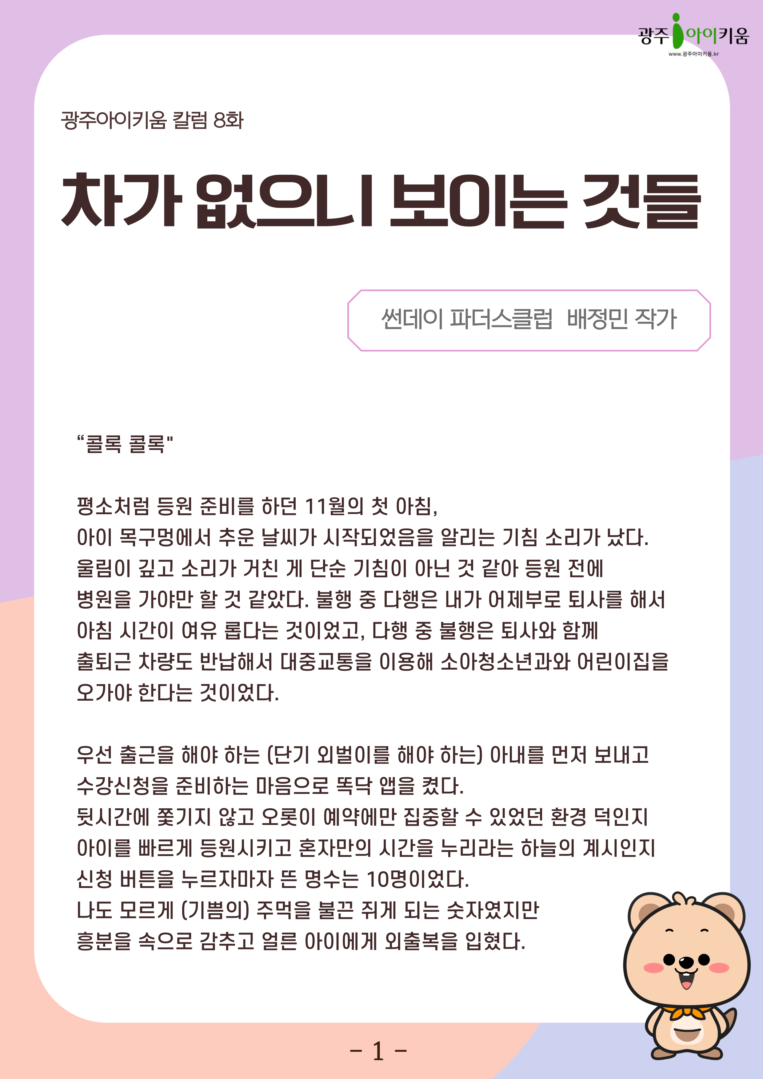 home 맘편한 내★일, 광주아이키움2.0 결혼·임신·출생 영유아 초·중·고 다양한 가족 일생활균형 커뮤니티 아동돌봄지원 소통방 나눔방 광주 아이키움 상담방 돌봄정보방 성폭력 피해 상담 및 사건지원 공지사항 이벤트소식 참여게시판 카드뉴스 동영상 아이키움 칼럼 성평등 육아웹툰 로고&캐릭터 [육아칼럼] 8화 - 차가 없으니 보이는 것들 등록일 : 2025-03-28 09:31 카테고리 : 카테고리 없음 작성자 : 운영자 조회수 : 262 첨부파일 000.png 다운로드 목록