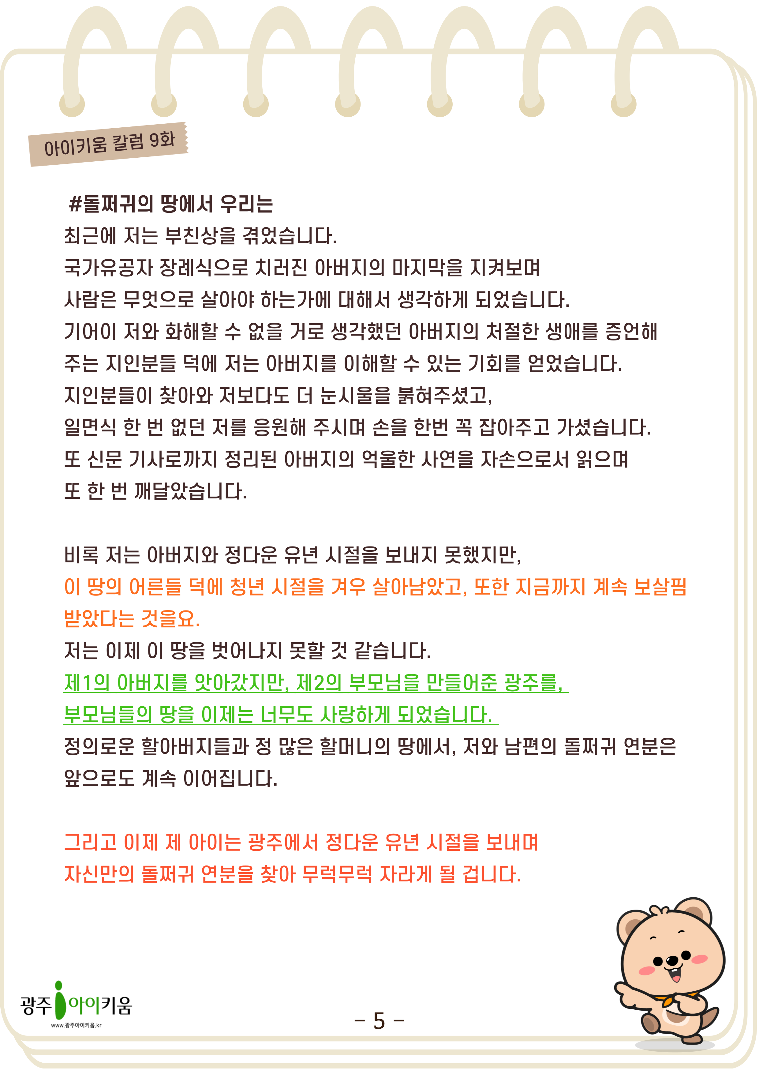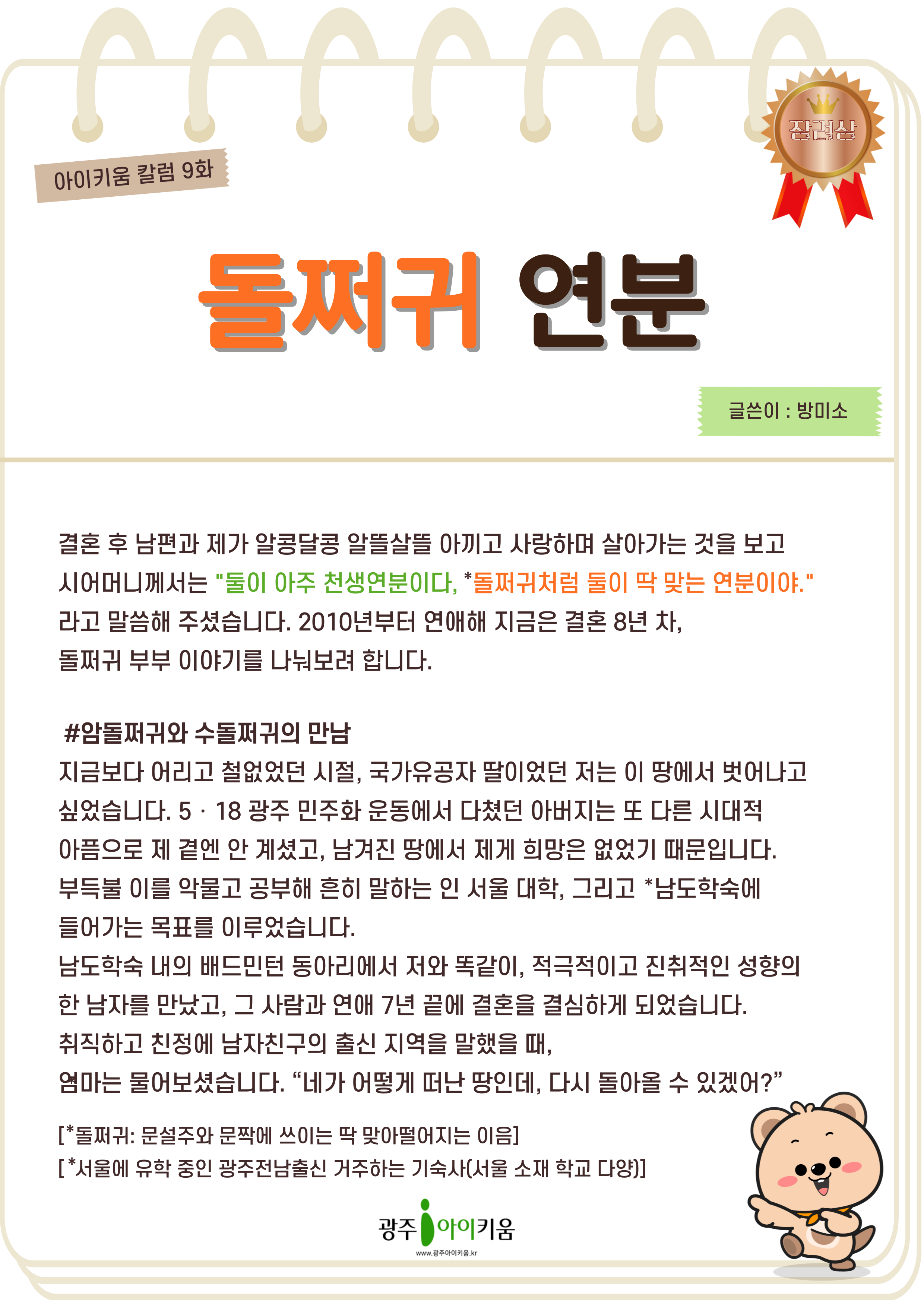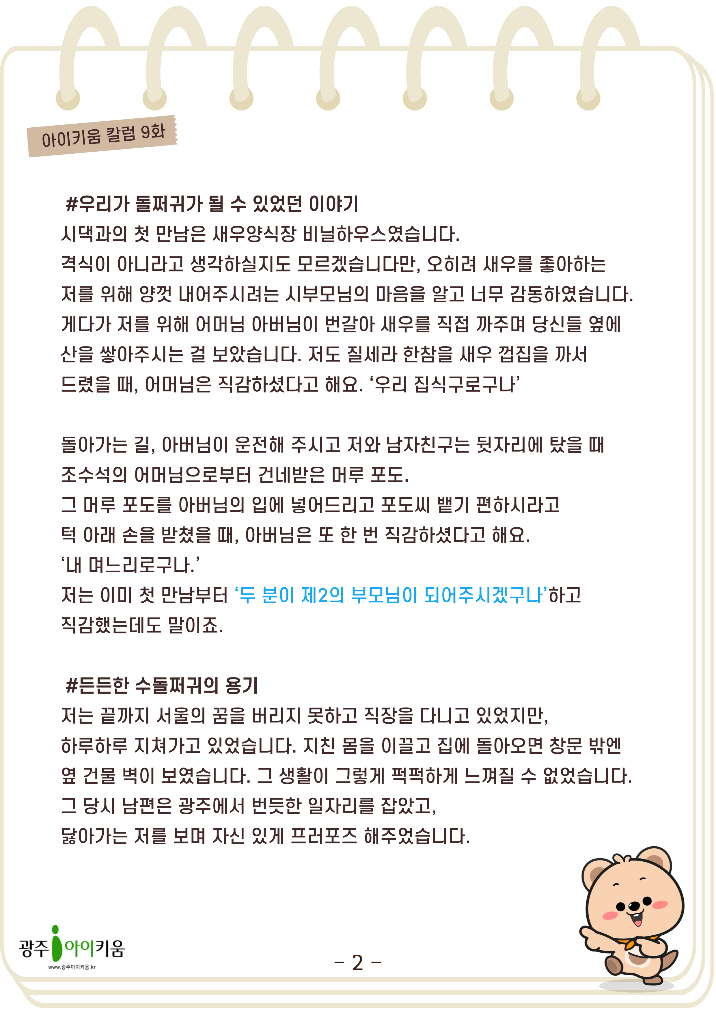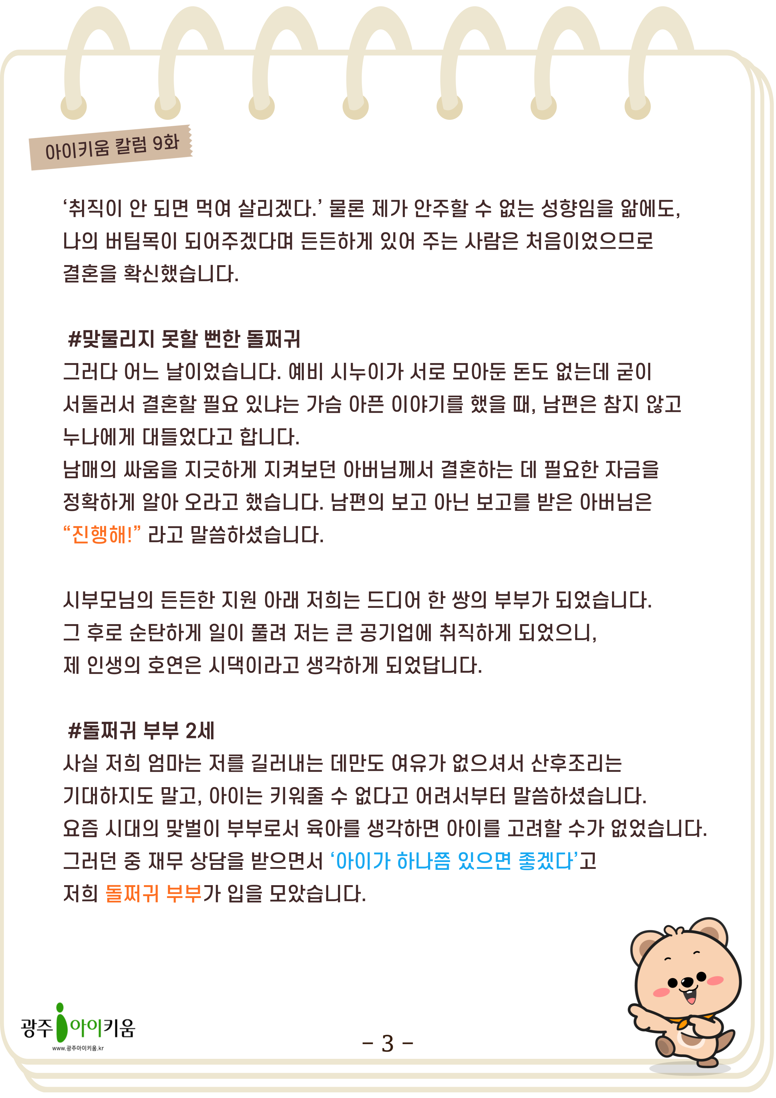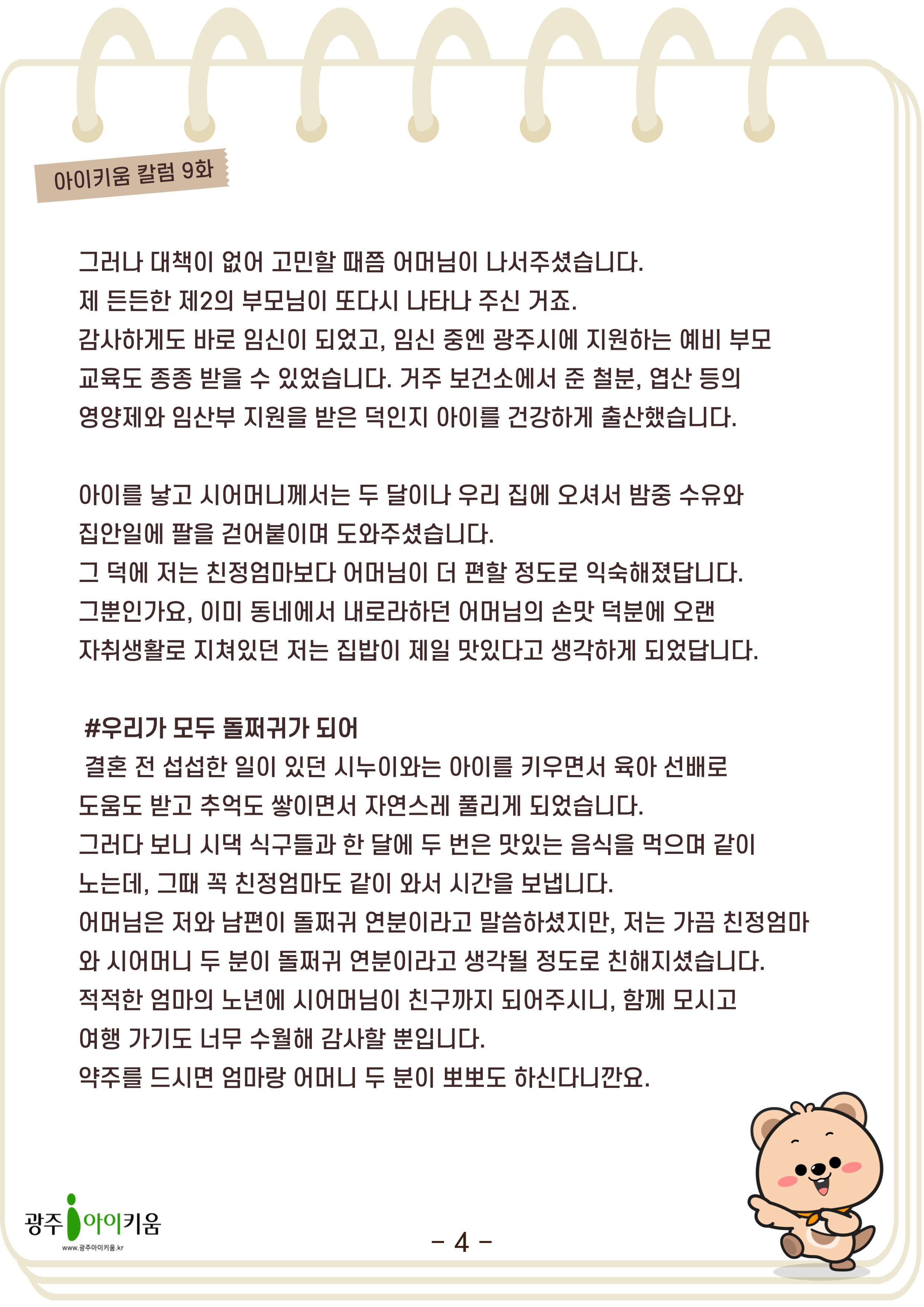 home 맘편한 내★일, 광주아이키움2.0 결혼·임신·출생 영유아 초·중·고 다양한 가족 일생활균형 커뮤니티 아동돌봄지원 소통방 나눔방 광주 아이키움 상담방 돌봄정보방 성폭력 피해 상담 및 사건지원 공지사항 이벤트소식 참여게시판 카드뉴스 동영상 아이키움 칼럼 성평등 육아웹툰 로고&캐릭터 [육아칼럼] 9화 - 돌쩌귀 연분 등록일 : 2025-04-03 14:29 카테고리 : 카테고리 없음 작성자 : 운영자 조회수 : 228 첨부파일 칼럼9화 (1).png 다운로드 목록