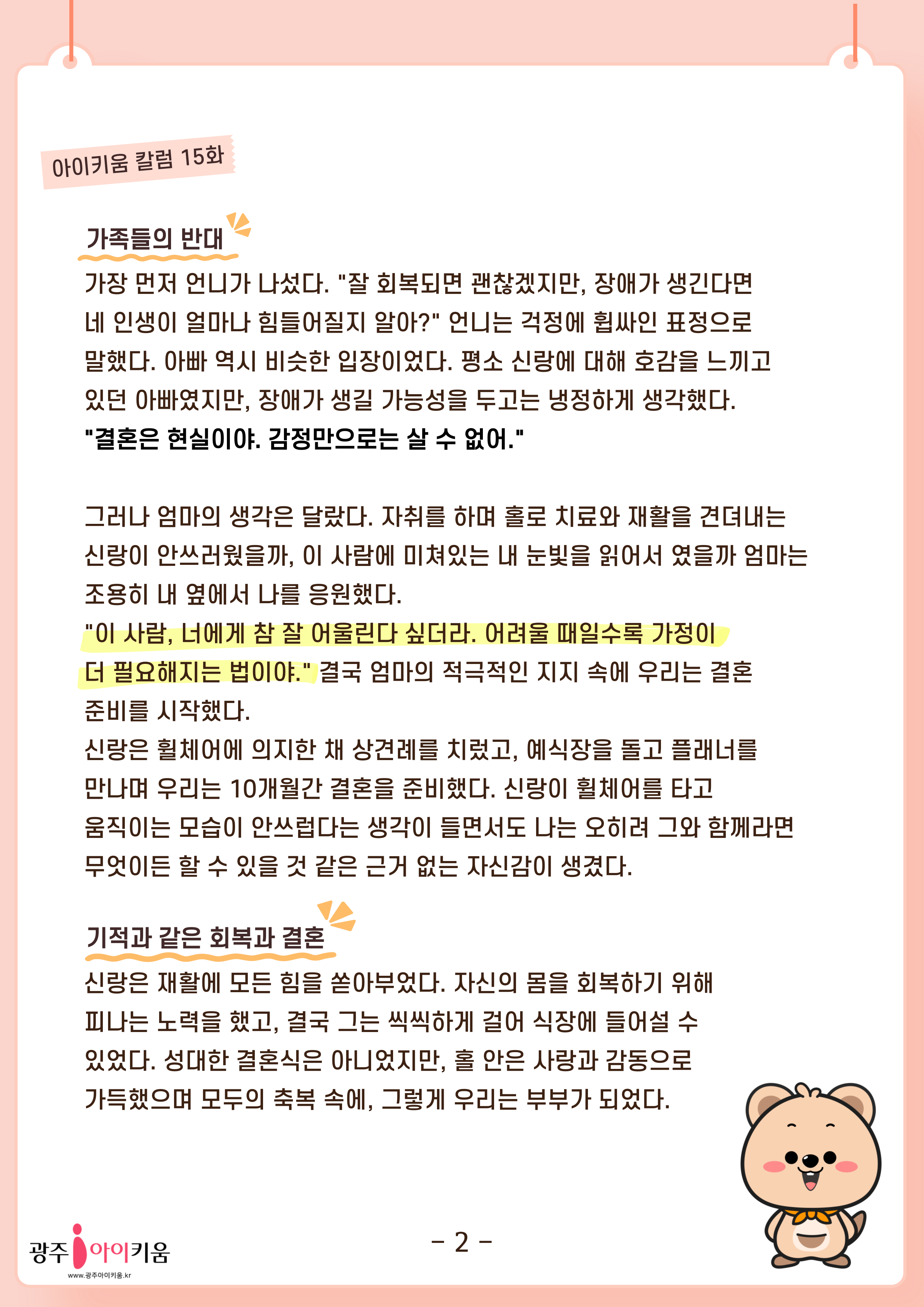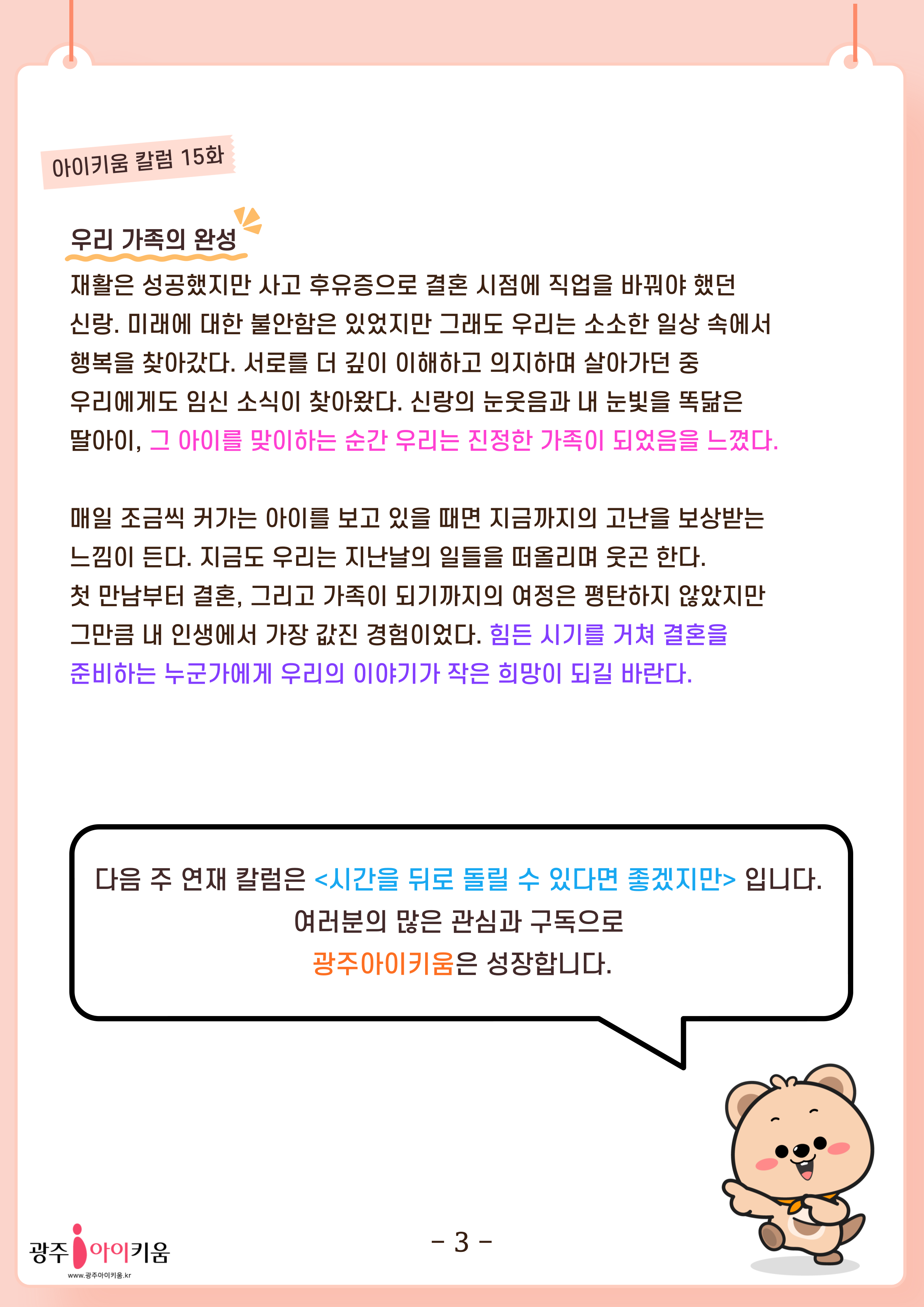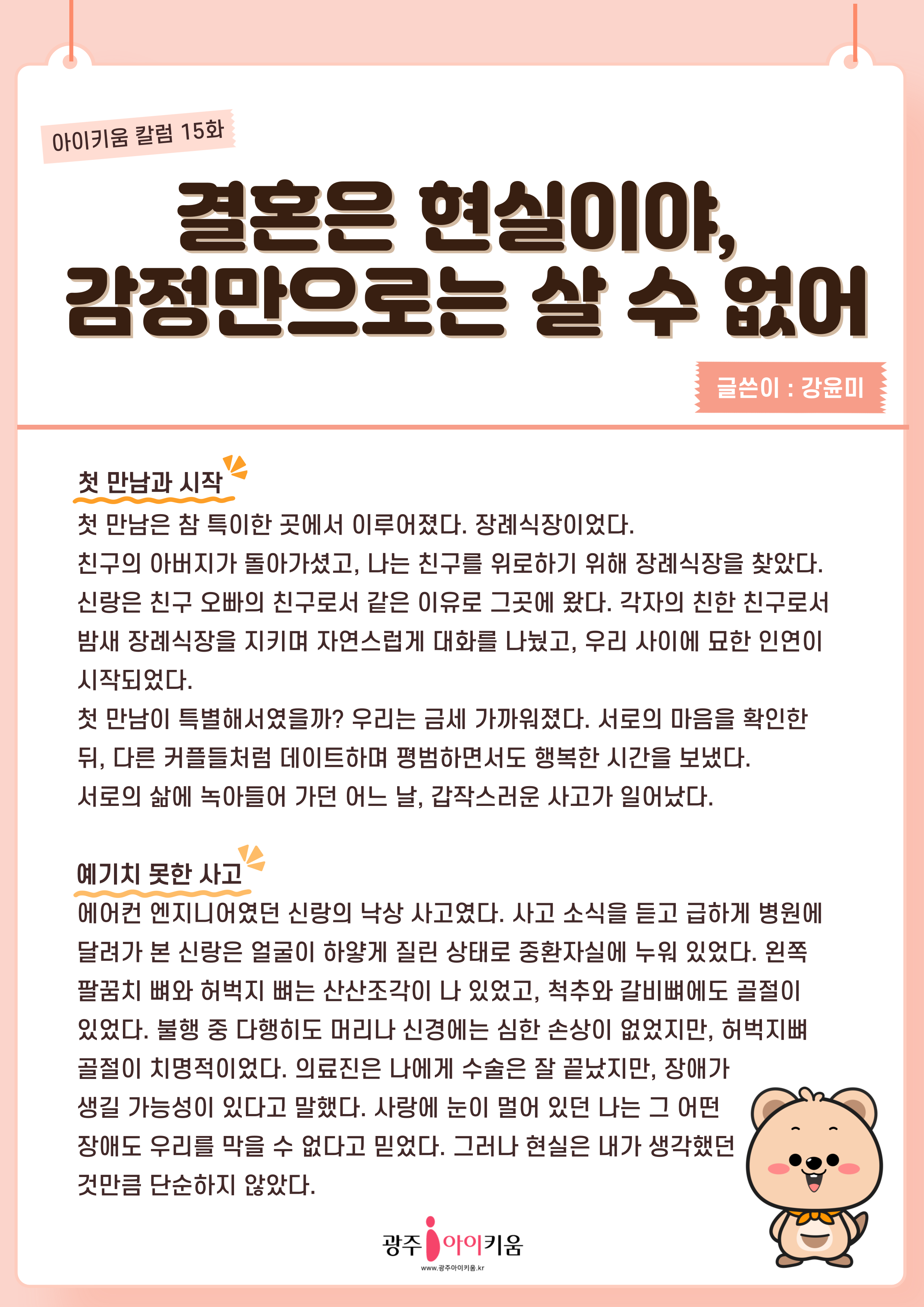 home 맘편한 내★일, 광주아이키움2.0 결혼·임신·출생 영유아 초·중·고 다양한 가족 일생활균형 커뮤니티 아동돌봄지원 소통방 나눔방 광주 아이키움 상담방 돌봄정보방 성폭력 피해 상담 및 사건지원 공지사항 이벤트소식 참여게시판 카드뉴스 동영상 아이키움 칼럼 성평등 육아웹툰 로고&캐릭터 [육아칼럼] 15화 - 예기치 못한 사고, 그리고 아빠의 한 마디 "결혼은 현실이야, 감정만으로는 살 수 없어" 등록일 : 2025-05-16 10:43 카테고리 : 카테고리 없음 작성자 : 운영자 조회수 : 142 첨부파일 2025-칼럼-_공모전_15화.png 다운로드 목록