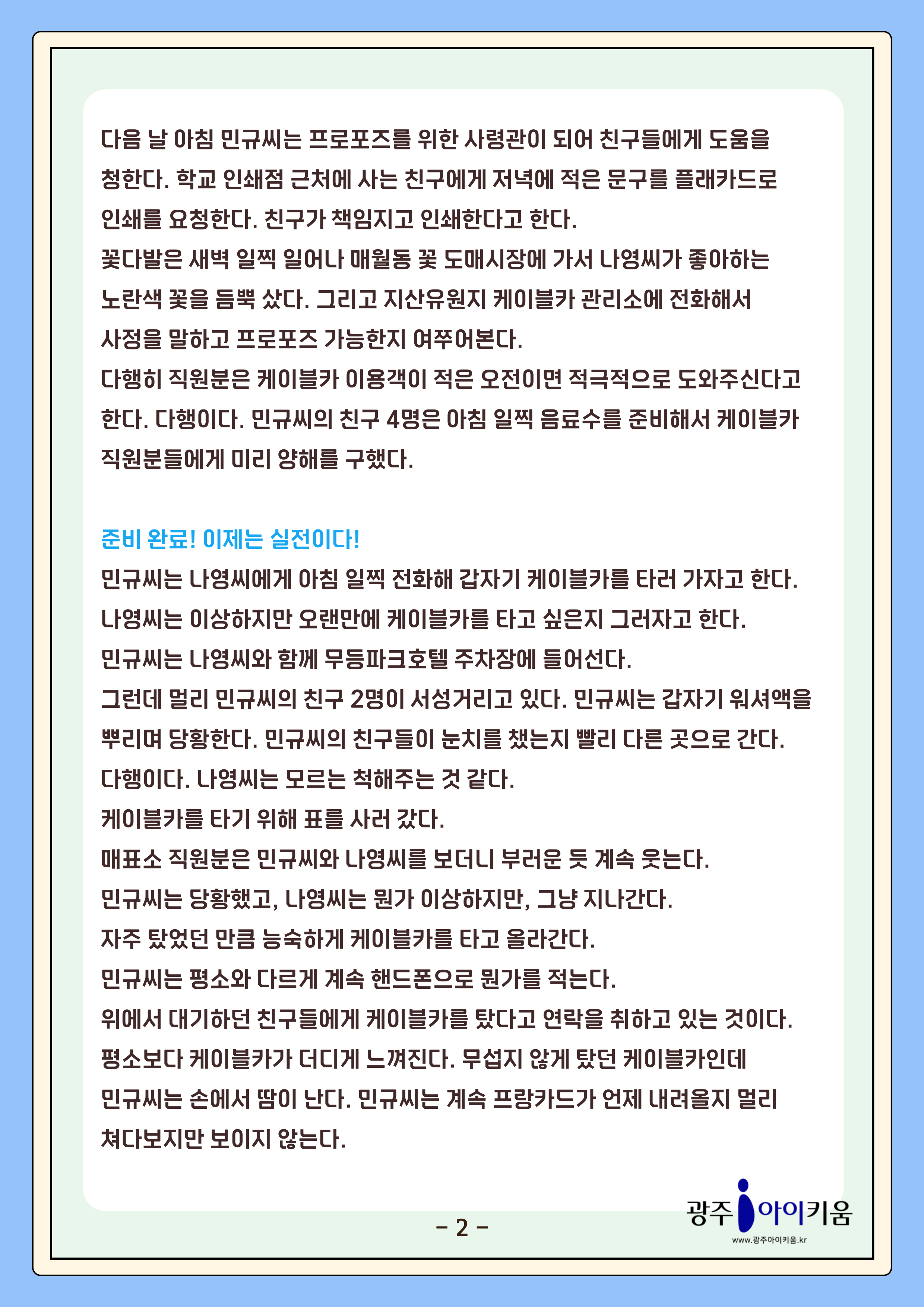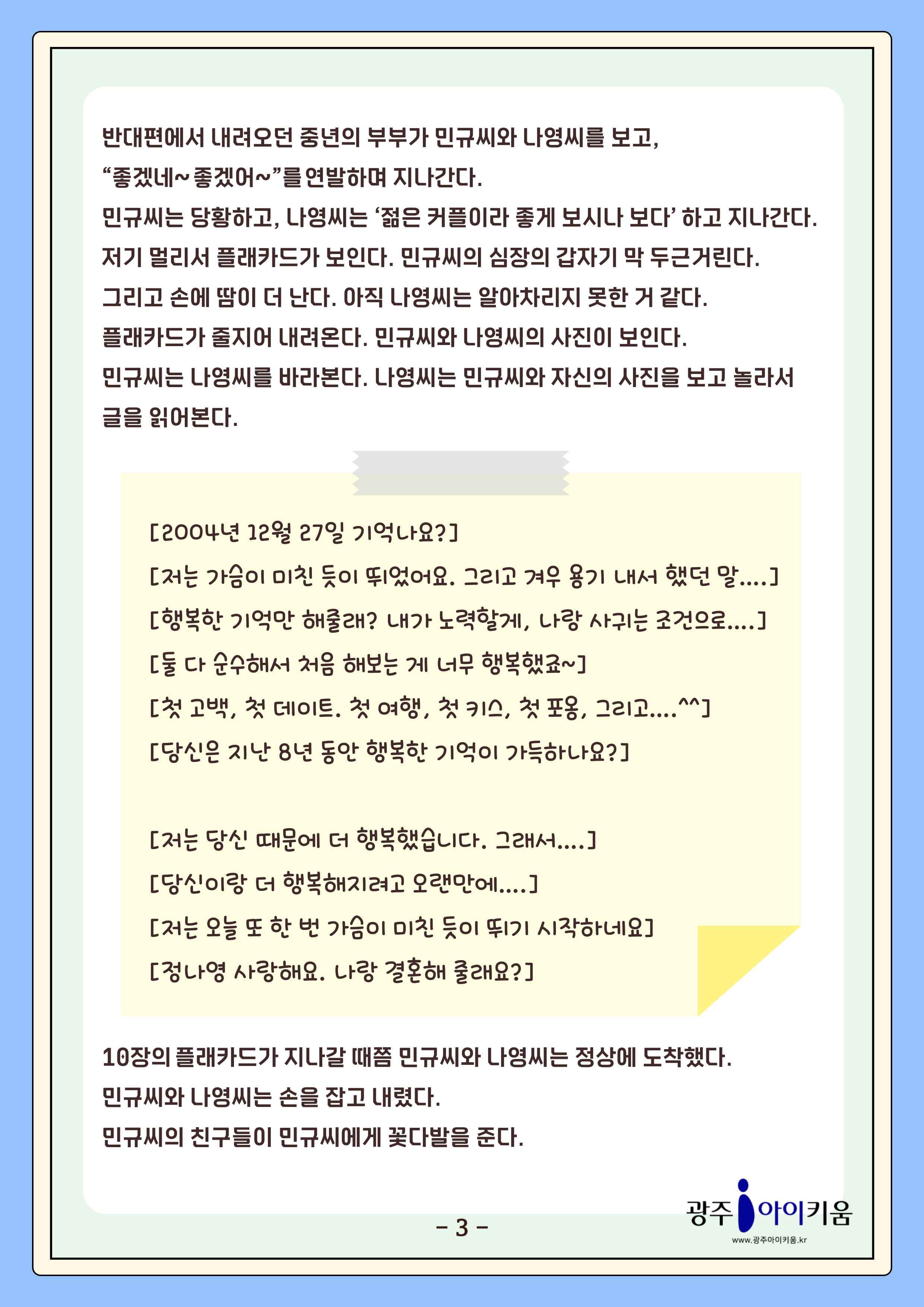 home 맘편한 내★일, 광주아이키움2.0 결혼·임신·출생 영유아 초·중·고 다양한 가족 일생활균형 커뮤니티 아동돌봄지원 소통방 나눔방 광주 아이키움 상담방 돌봄정보방 성폭력 피해 상담 및 사건지원 공지사항 이벤트소식 참여게시판 카드뉴스 동영상 아이키움 칼럼 성평등 육아웹툰 로고&캐릭터 [육아칼럼] 23화 - 인간극장 '우당탕탕 프로포즈편' 등록일 : 2025-07-11 10:44 카테고리 : 카테고리 없음 작성자 : 운영자 조회수 : 131 첨부파일 2025-칼럼_표지-001.png 다운로드 목록