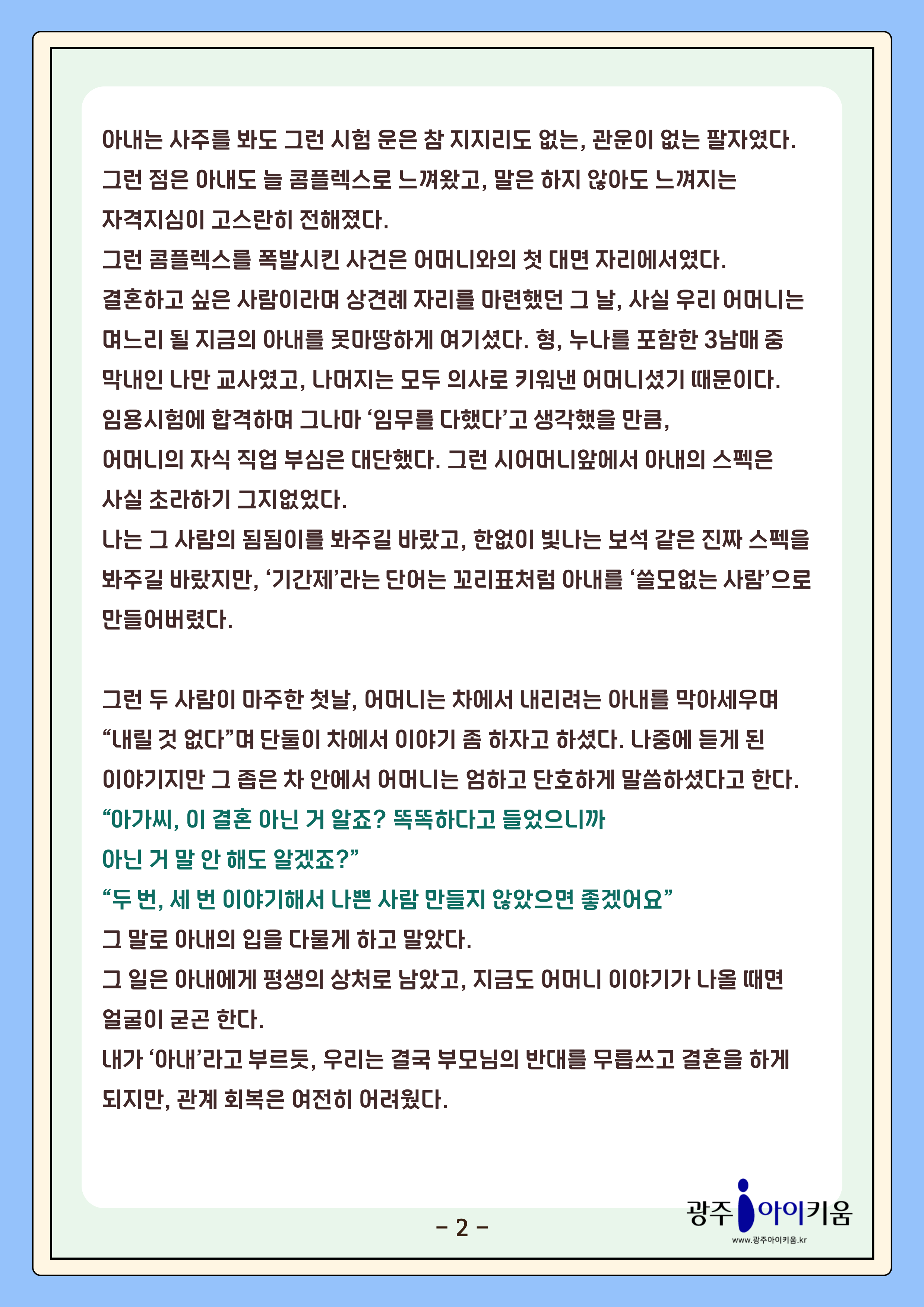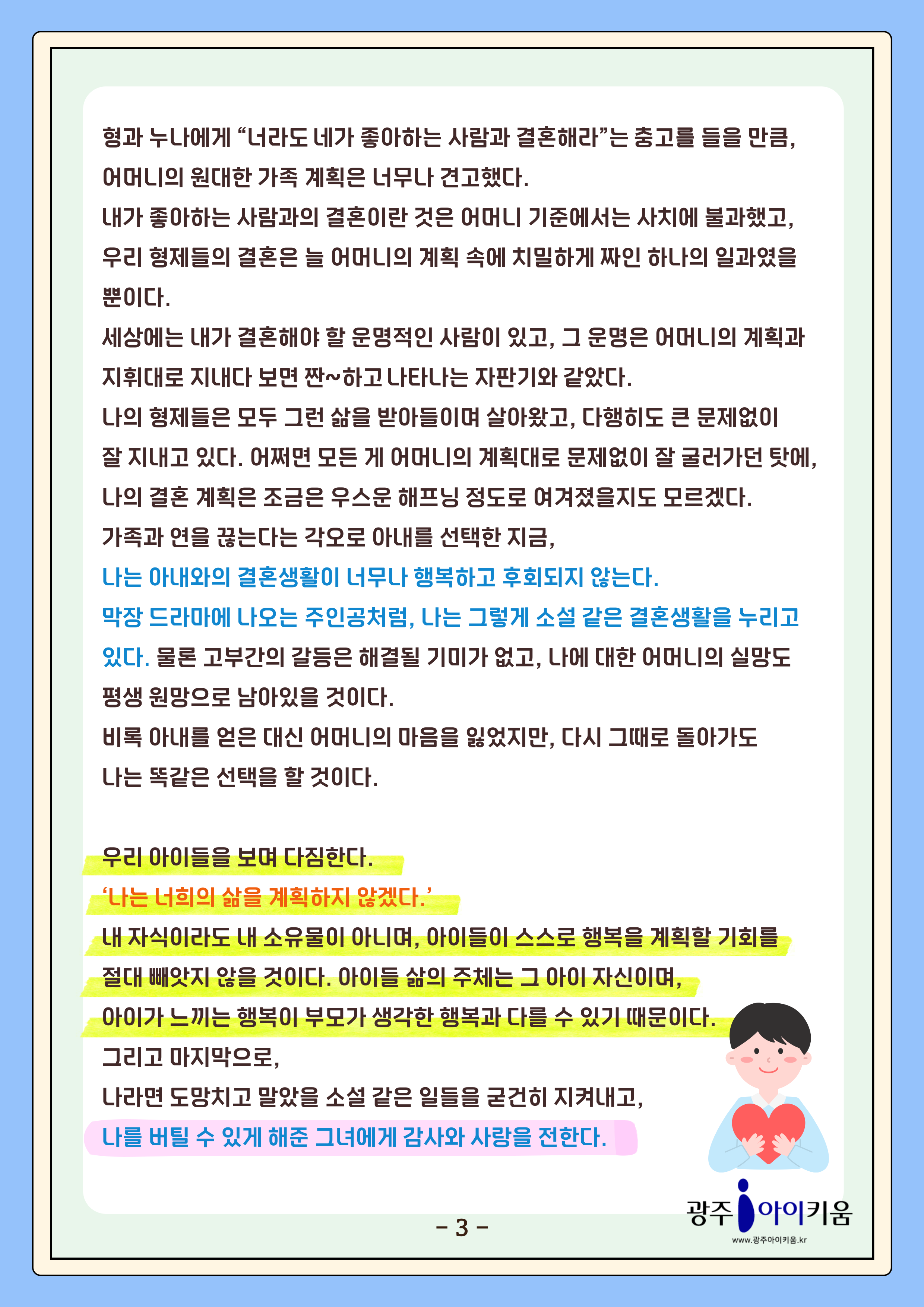 home 맘편한 내★일, 광주아이키움2.0 결혼·임신·출생 영유아 초·중·고 다양한 가족 일생활균형 커뮤니티 아동돌봄지원 소통방 나눔방 광주 아이키움 상담방 돌봄정보방 성폭력 피해 상담 및 사건지원 공지사항 이벤트소식 참여게시판 카드뉴스 동영상 아이키움 칼럼 성평등 육아웹툰 로고&캐릭터 [육아칼럼] 25화 - 소설 같은 우리의 결혼이야기 등록일 : 2025-07-24 15:07 카테고리 : 카테고리 없음 작성자 : 운영자 조회수 : 117 첨부파일 000.png 다운로드 목록