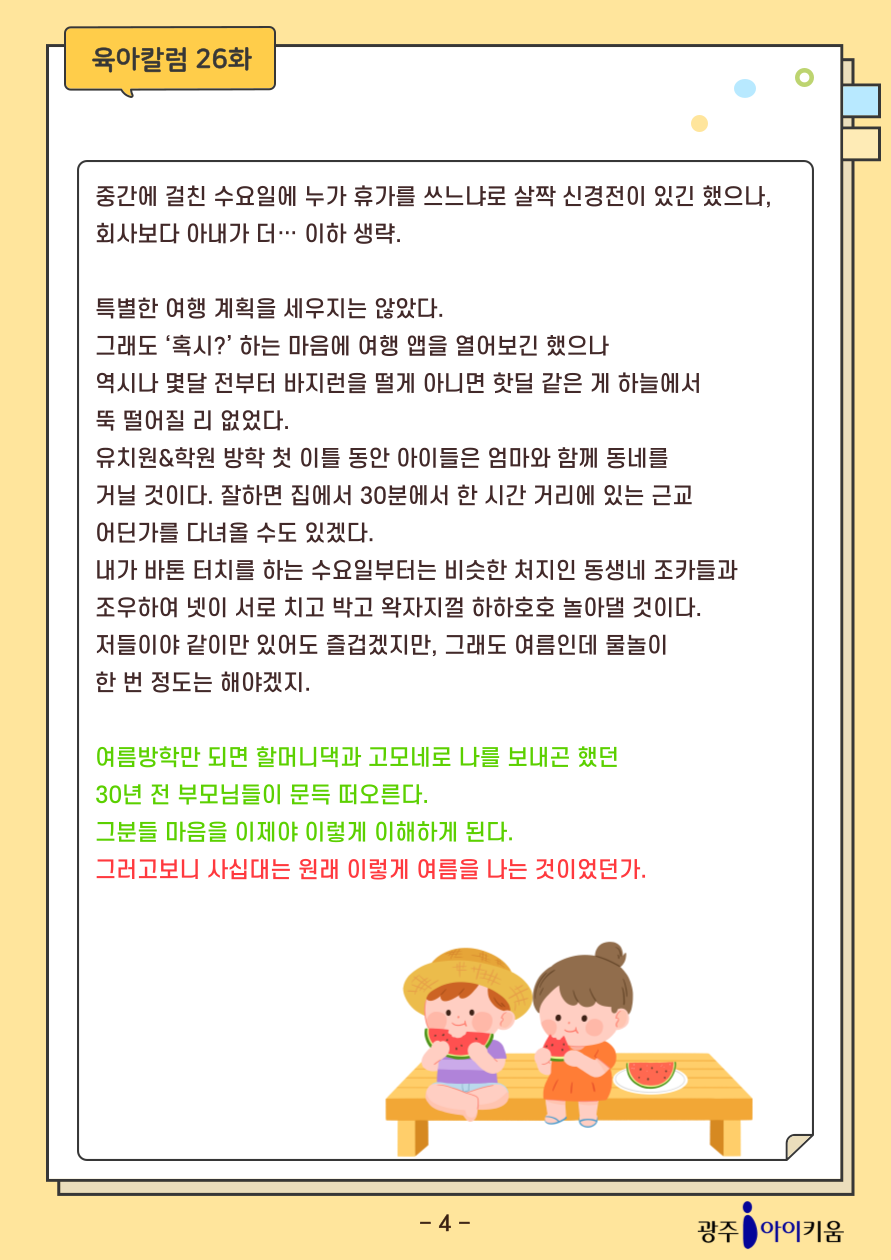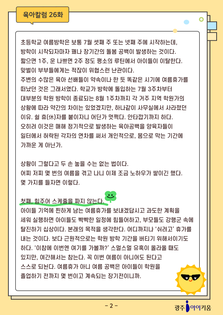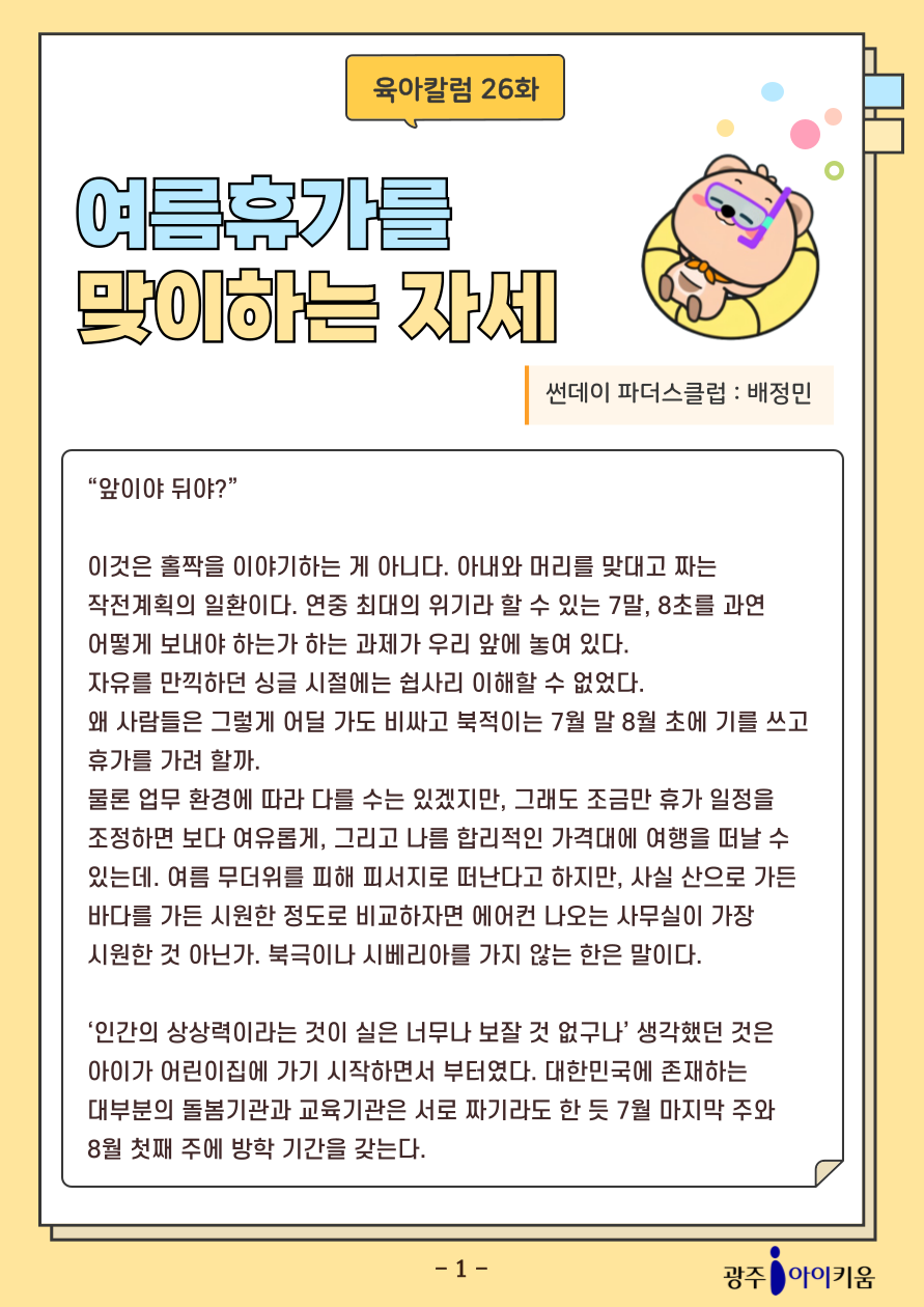home 맘편한 내★일, 광주아이키움2.0 결혼·임신·출생 영유아 초·중·고 다양한 가족 일생활균형 커뮤니티 아동돌봄지원 소통방 나눔방 광주 아이키움 상담방 돌봄정보방 성폭력 피해 상담 및 사건지원 공지사항 이벤트소식 참여게시판 카드뉴스 동영상 아이키움 칼럼 성평등 육아웹툰 로고&캐릭터 [육아칼럼] 26화 - 여름휴가를 맞이하는 자세 등록일 : 2025-08-01 13:43 카테고리 : 카테고리 없음 작성자 : 운영자 조회수 : 130 첨부파일 2025-칼럼_표지-001.png 다운로드 목록