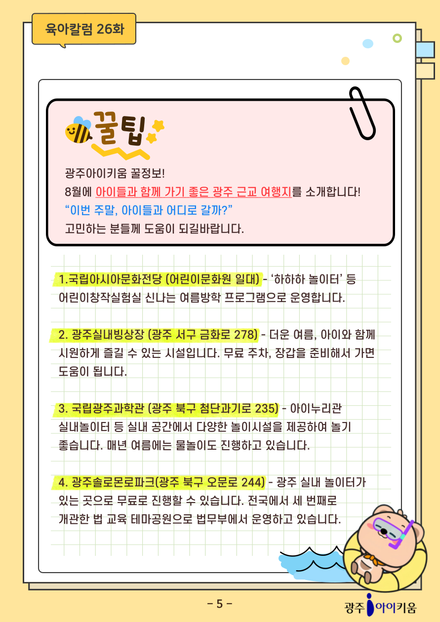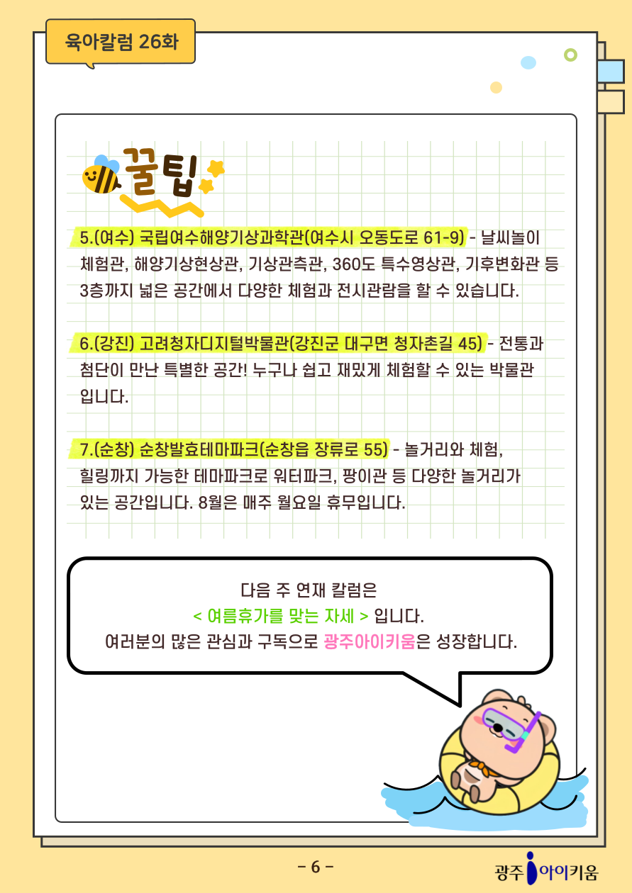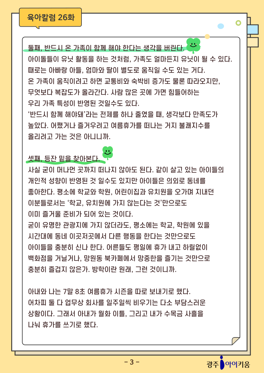 home 맘편한 내★일, 광주아이키움2.0 결혼·임신·출생 영유아 초·중·고 다양한 가족 일생활균형 커뮤니티 아동돌봄지원 소통방 나눔방 광주 아이키움 상담방 돌봄정보방 성폭력 피해 상담 및 사건지원 공지사항 이벤트소식 참여게시판 카드뉴스 동영상 아이키움 칼럼 성평등 육아웹툰 로고&캐릭터 [육아칼럼] 26화 - 여름휴가를 맞이하는 자세 등록일 : 2025-08-01 13:43 카테고리 : 카테고리 없음 작성자 : 운영자 조회수 : 130 첨부파일 2025-칼럼_표지-001.png 다운로드 목록