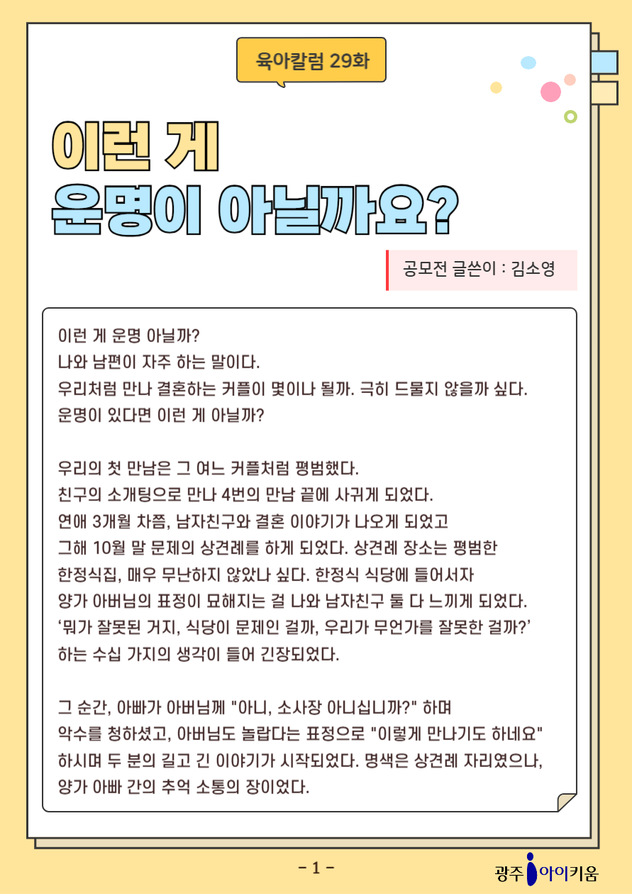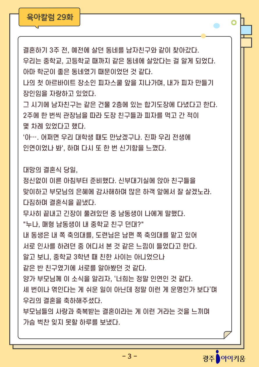 home 맘편한 내★일, 광주아이키움2.0 결혼·임신·출생 영유아 초·중·고 다양한 가족 일생활균형 커뮤니티 아동돌봄지원 소통방 나눔방 광주 아이키움 상담방 돌봄정보방 성폭력 피해 상담 및 사건지원 공지사항 이벤트소식 참여게시판 카드뉴스 동영상 아이키움 칼럼 성평등 육아웹툰 로고&캐릭터 [육아칼럼] 29화 - 이런 게 운명이 아닐까요? 등록일 : 2025-08-22 13:17 카테고리 : 카테고리 없음 작성자 : 운영자 조회수 : 133 첨부파일 2025_칼럼표지-002.png 다운로드 목록
