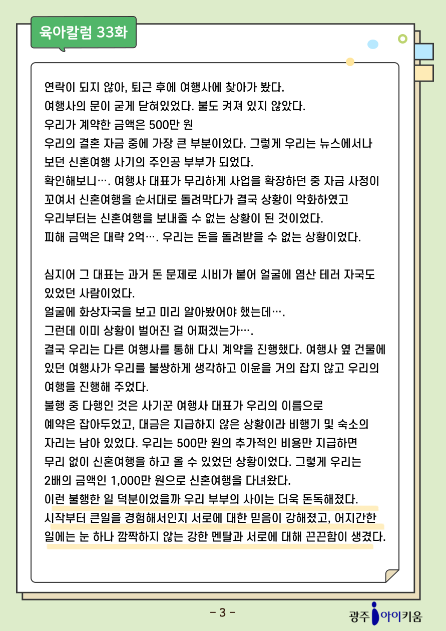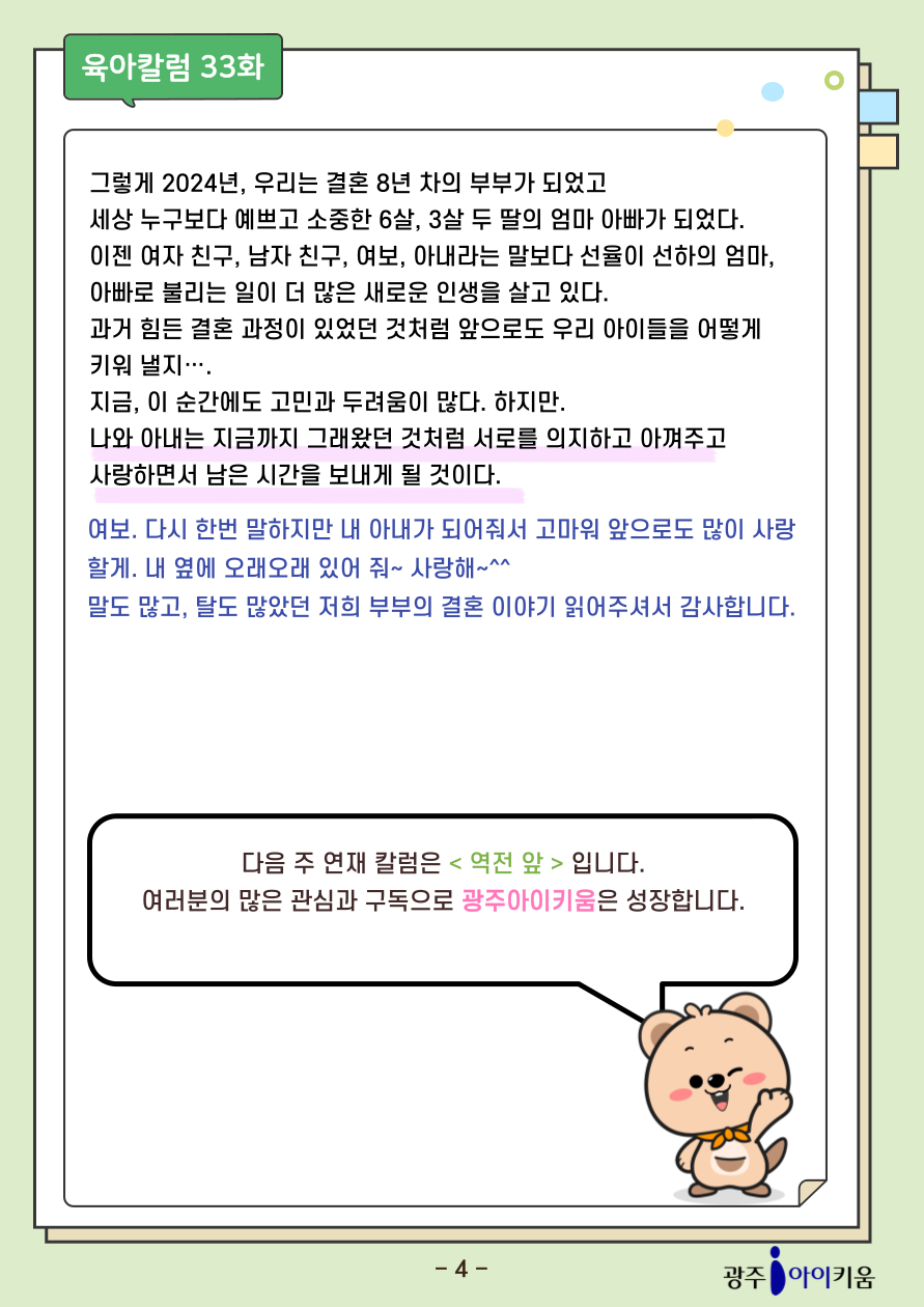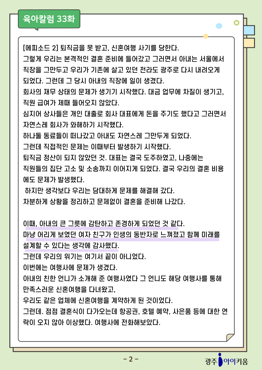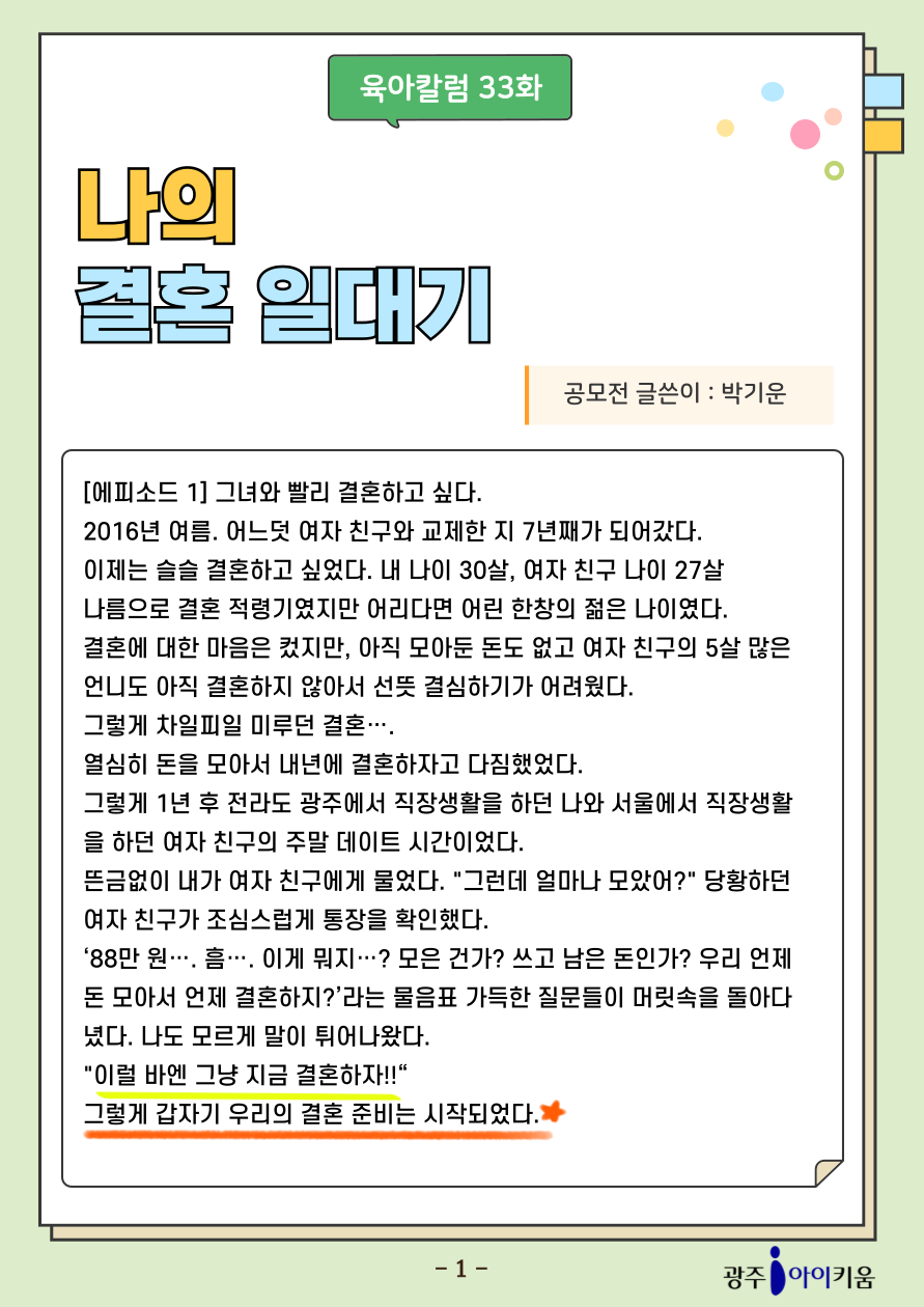 home 맘편한 내★일, 광주아이키움2.0 결혼·임신·출생 영유아 초·중·고 다양한 가족 일생활균형 커뮤니티 아동돌봄지원 소통방 나눔방 광주 아이키움 상담방 돌봄정보방 성폭력 피해 상담 및 사건지원 공지사항 이벤트소식 참여게시판 카드뉴스 동영상 아이키움 칼럼 성평등 육아웹툰 로고&캐릭터 [육아칼럼] - 33화 나의 결혼 일대기 등록일 : 2025-09-17 14:54 카테고리 : 카테고리 없음 작성자 : 운영자 조회수 : 198 첨부파일 2025_칼럼표지_복사본-001 (1).png 다운로드 목록