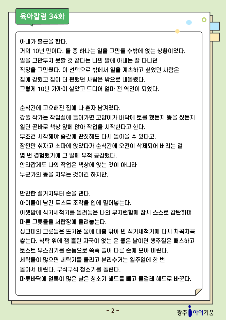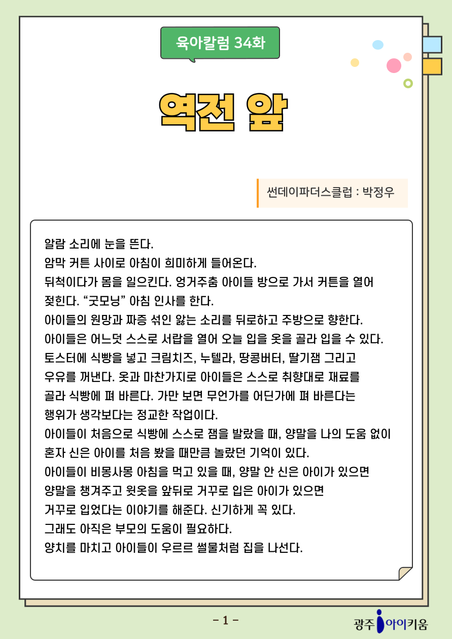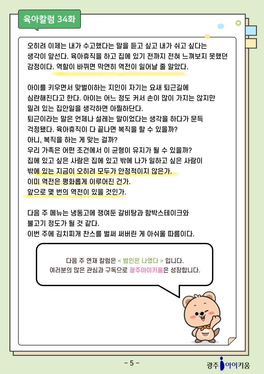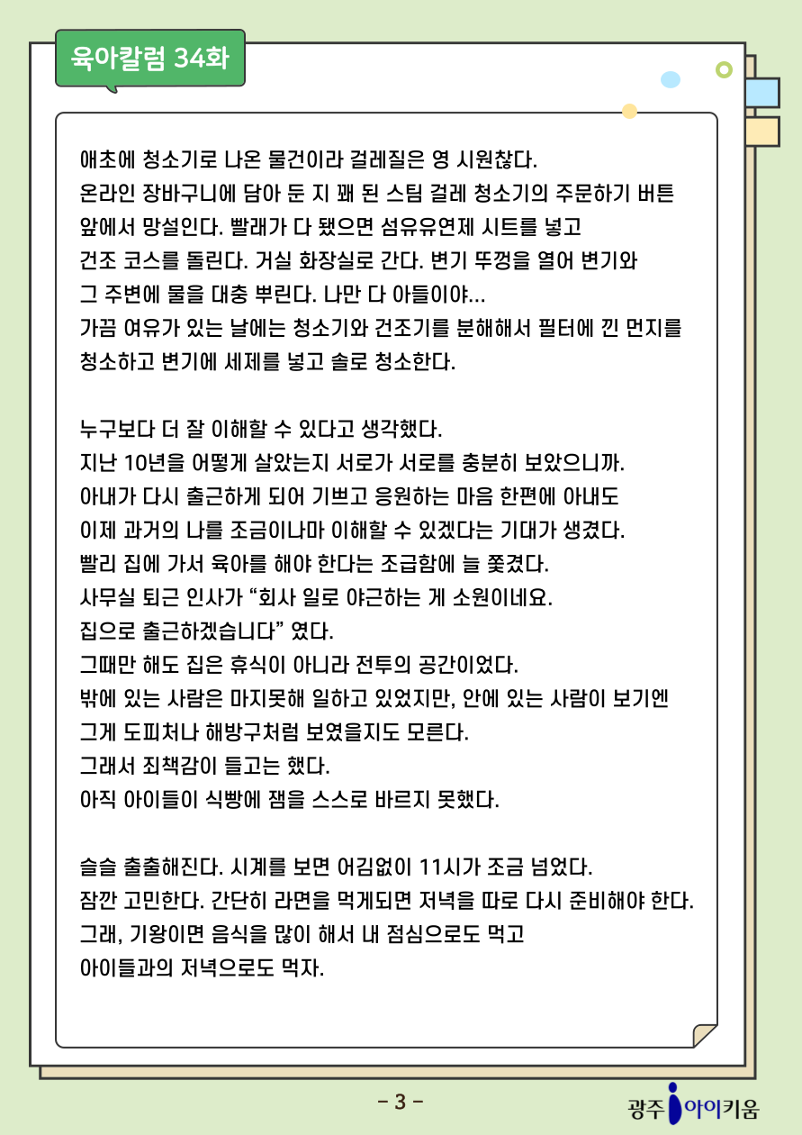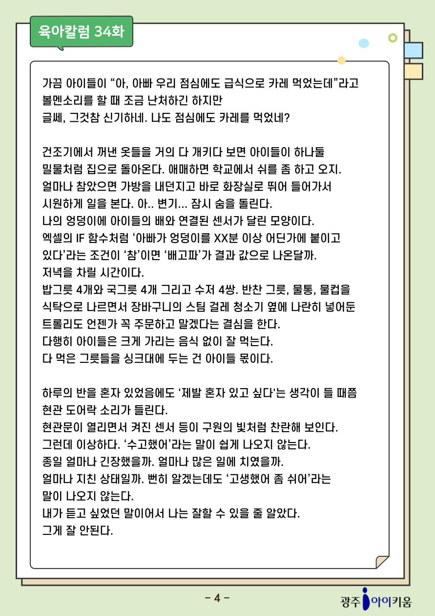 home 맘편한 내★일, 광주아이키움2.0 결혼·임신·출생 영유아 초·중·고 다양한 가족 일생활균형 커뮤니티 아동돌봄지원 소통방 나눔방 광주 아이키움 상담방 돌봄정보방 성폭력 피해 상담 및 사건지원 공지사항 이벤트소식 참여게시판 카드뉴스 동영상 아이키움 칼럼 성평등 육아웹툰 로고&캐릭터 [육아칼럼] - 34화 역전 앞 등록일 : 2025-09-25 13:54 카테고리 : 카테고리 없음 작성자 : 운영자 조회수 : 183 첨부파일 0.png 다운로드 목록