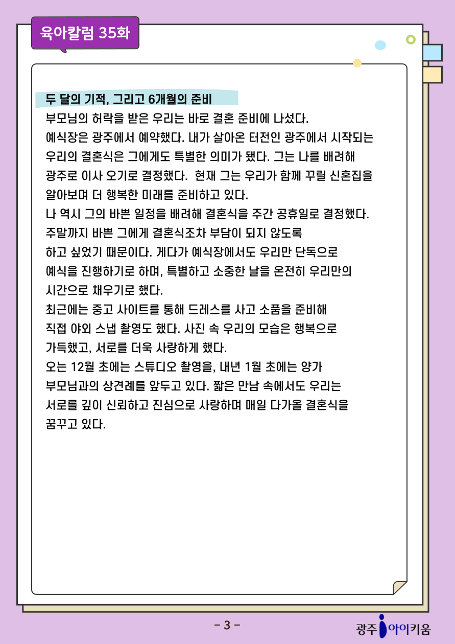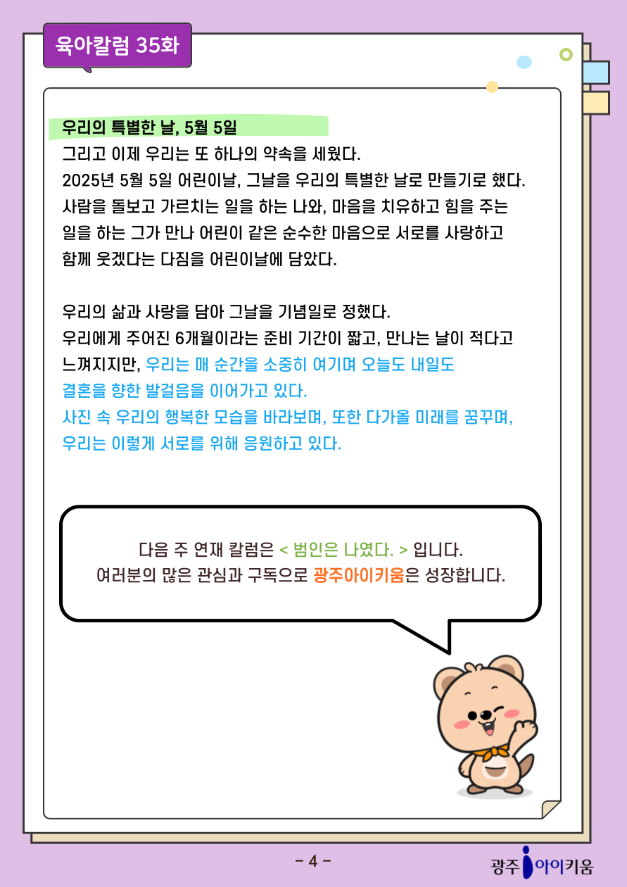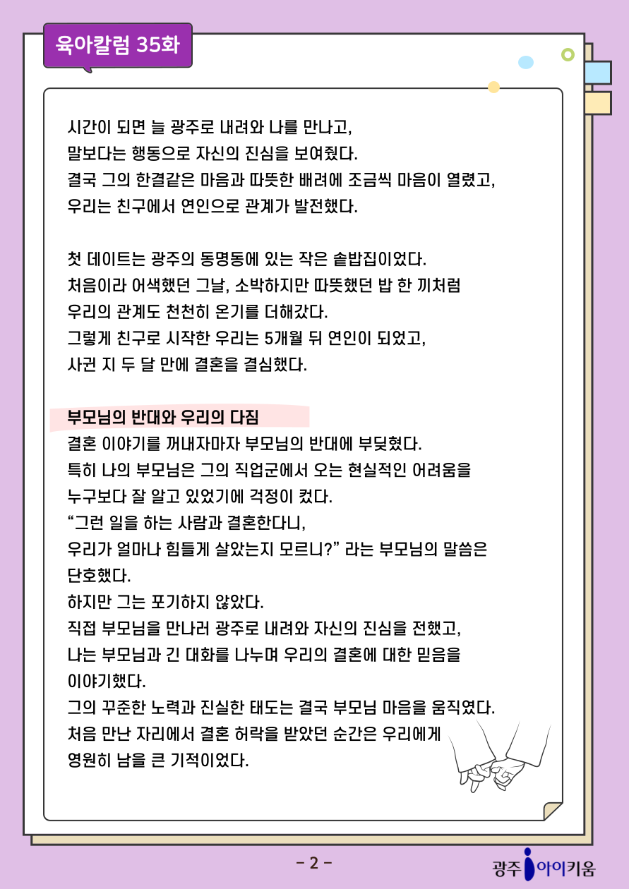 home 맘편한 내★일, 광주아이키움2.0 결혼·임신·출생 영유아 초·중·고 다양한 가족 일생활균형 커뮤니티 아동돌봄지원 소통방 나눔방 광주 아이키움 상담방 돌봄정보방 성폭력 피해 상담 및 사건지원 공지사항 이벤트소식 참여게시판 카드뉴스 동영상 아이키움 칼럼 성평등 육아웹툰 로고&캐릭터 [육아칼럼] - 35화 두 달의 연애, 평생 약속 등록일 : 2025-10-02 13:48 카테고리 : 카테고리 없음 작성자 : 운영자 조회수 : 154 첨부파일 000.png 다운로드 목록