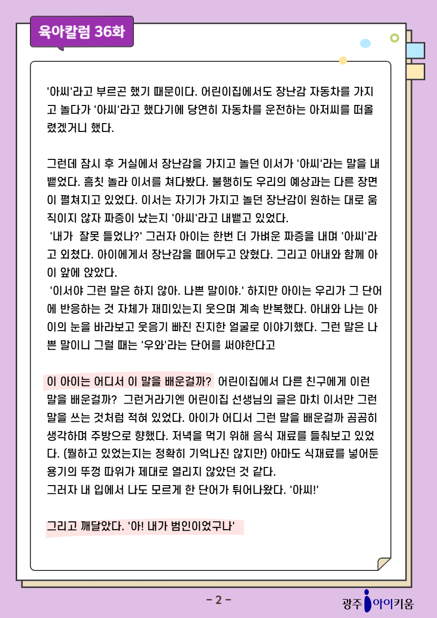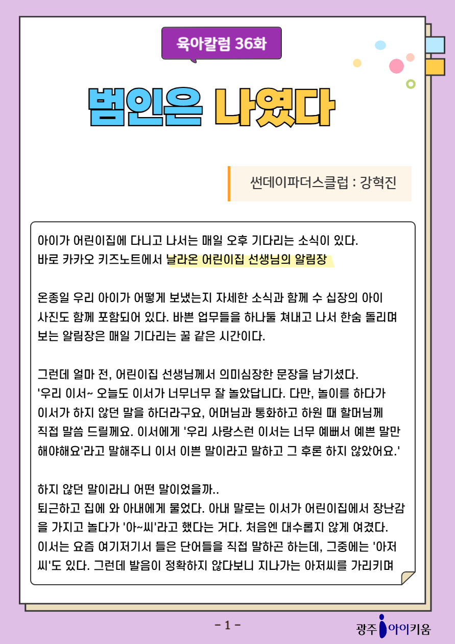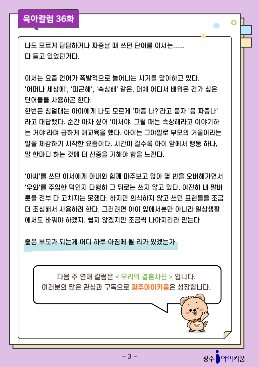 home 맘편한 내★일, 광주아이키움2.0 결혼·임신·출생 영유아 초·중·고 다양한 가족 일생활균형 커뮤니티 아동돌봄지원 소통방 나눔방 광주 아이키움 상담방 돌봄정보방 성폭력 피해 상담 및 사건지원 공지사항 이벤트소식 참여게시판 카드뉴스 동영상 아이키움 칼럼 성평등 육아웹툰 로고&캐릭터 [육아칼럼] 36화- 범인은 나였다. 등록일 : 2025-10-14 09:49 카테고리 : 카테고리 없음 작성자 : 운영자 조회수 : 175 첨부파일 111.png 다운로드 목록