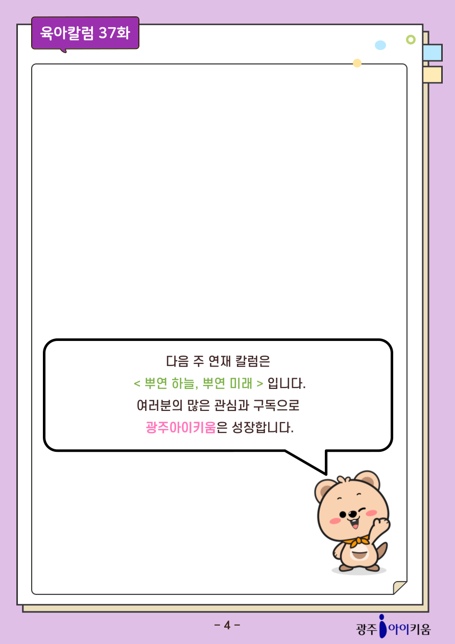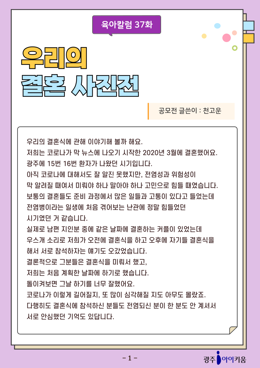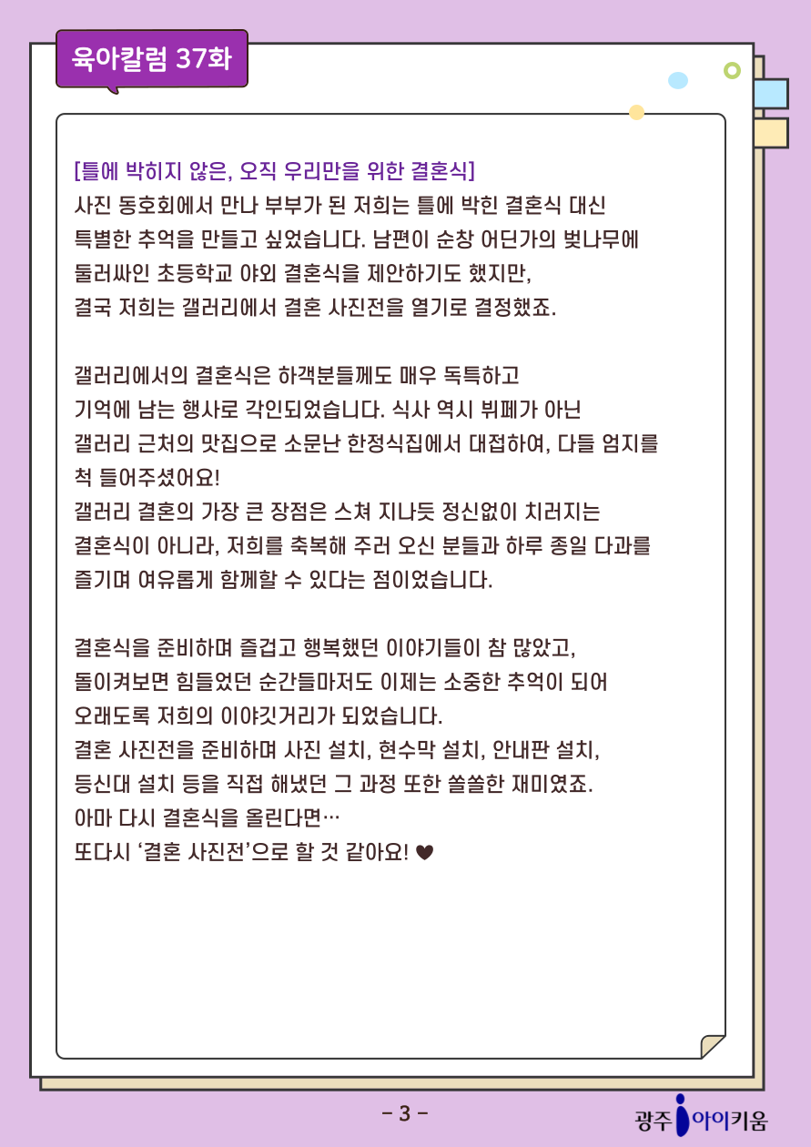 home 맘편한 내★일, 광주아이키움2.0 결혼·임신·출생 영유아 초·중·고 다양한 가족 일생활균형 커뮤니티 아동돌봄지원 소통방 나눔방 광주 아이키움 상담방 돌봄정보방 성폭력 피해 상담 및 사건지원 공지사항 이벤트소식 참여게시판 카드뉴스 동영상 아이키움 칼럼 성평등 육아웹툰 로고&캐릭터 [육아칼럼] 37화 - 우리의 결혼 사진전 등록일 : 2025-10-24 17:56 카테고리 : 카테고리 없음 작성자 : 운영자 조회수 : 161 첨부파일 000.png 다운로드 목록