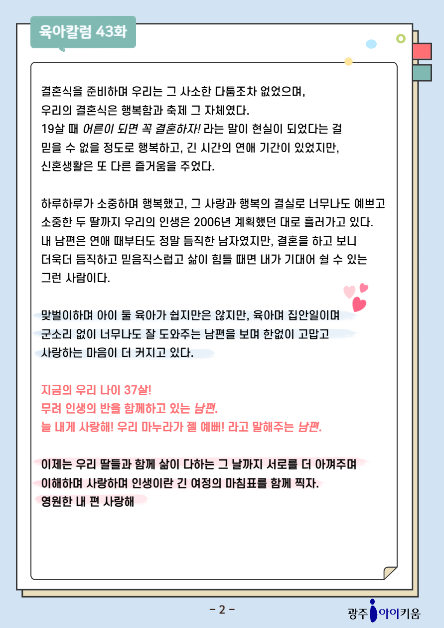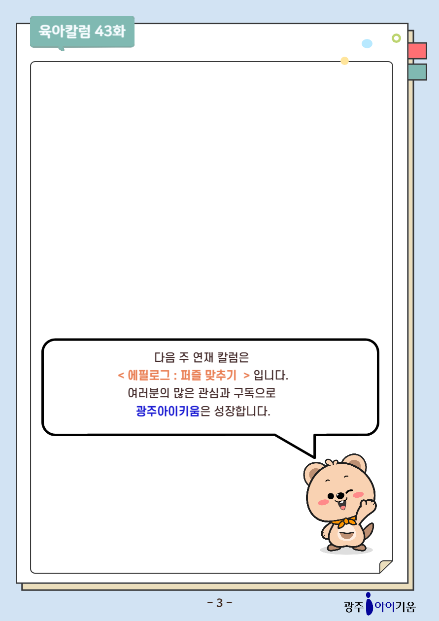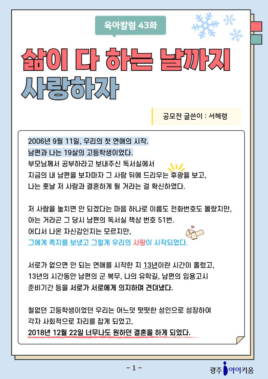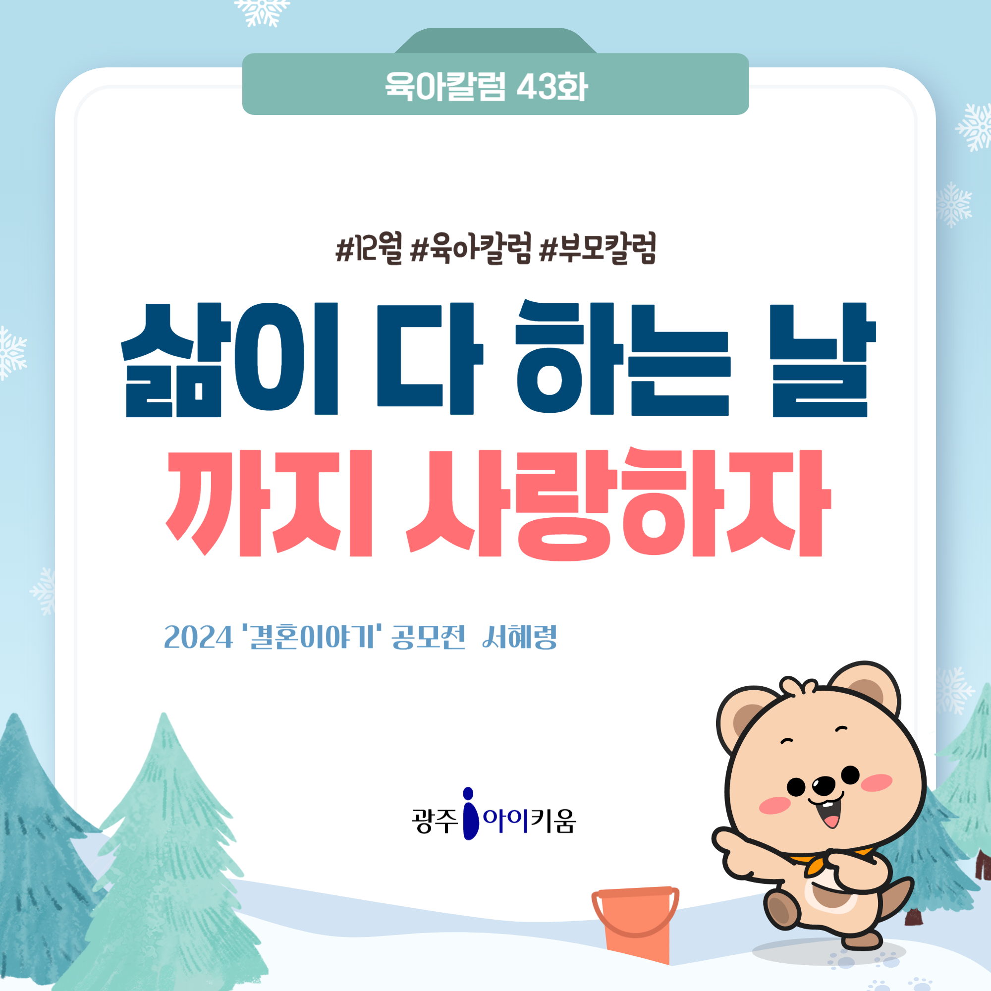 home 맘편한 내★일, 광주아이키움2.0 결혼·임신·출생 영유아 초·중·고 다양한 가족 일생활균형 커뮤니티 아동돌봄지원 소통방 나눔방 광주 아이키움 상담방 돌봄정보방 성폭력 피해 상담 및 사건지원 공지사항 이벤트소식 참여게시판 카드뉴스 동영상 아이키움 칼럼 성평등 육아웹툰 로고&캐릭터 [육아칼럼] 43화 - 삶이 다하는 날까지 사랑하자 등록일 : 2025-12-05 13:06 카테고리 : 카테고리 없음 작성자 : 운영자 조회수 : 133 첨부파일 111 (2).png 다운로드 목록