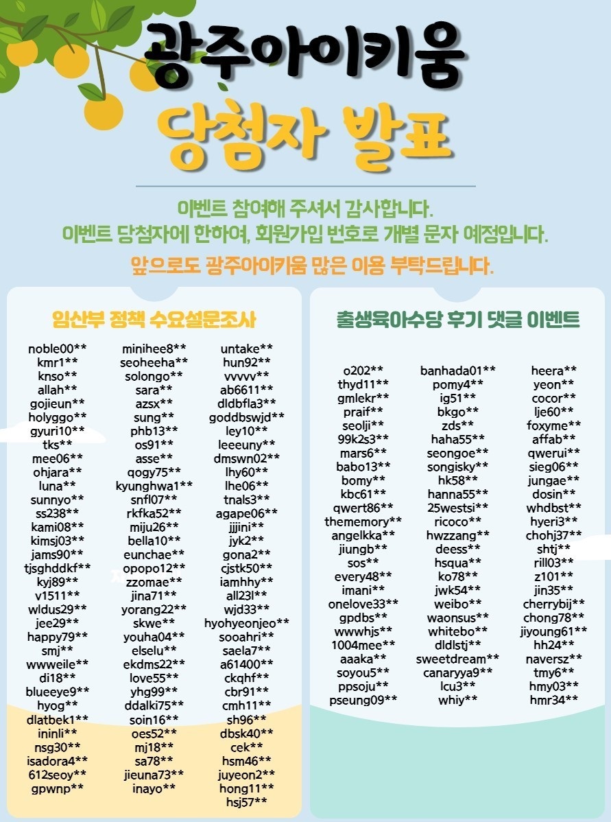 광주아이키움 광주출생육아수당, 임산부 정책 수요 설문조사 이벤트 당첨자 안내