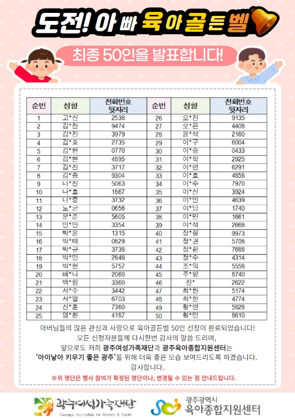 여러분들의 많은 관심과 사랑으로 도전! 아빠 육아 골든벨 참가자 50인 선정이 완료되었습니다.