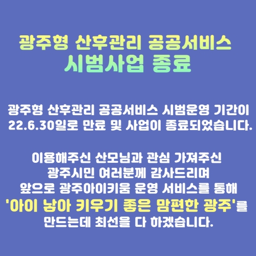 home 맘편한 내★일, 광주아이키움2.0 결혼·임신·출생 영유아 초·중·고 다양한 가족 일생활균형 커뮤니티 아동돌봄지원 소통방 나눔방 광주 아이키움 상담방 돌봄정보방 성폭력 피해 상담 및 사건지원 공지사항 광주형 산후관리 공공서비스 시범사업 종료 안내 등록일 : 2022-07-01 09:52 작성자 : 운영자 조회수 : 1083 <광주형 산후관리 공공형서비스 사업종료 안내>광주형 산후관리 공공서비스 사업기간이 22년 6월 30일로 만료 및 사업종료되었습니다. 이용해주신 산모님과 관심 가져주신 광주시민 여러분께 감사드리며아이낳아 키우기 좋은 맘편한 광주를 만드는데 최선을 다하겠습니다. 목록