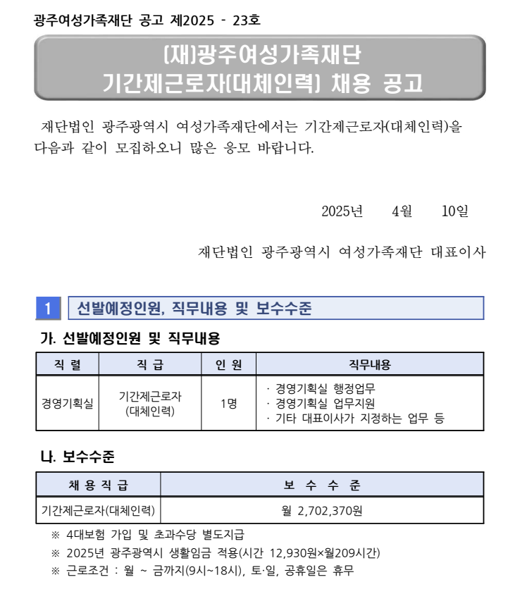home 맘편한 내★일, 광주아이키움2.0 결혼·임신·출생 영유아 초·중·고 다양한 가족 일생활균형 커뮤니티 아동돌봄지원 소통방 나눔방 광주 아이키움 상담방 돌봄정보방 성폭력 피해 상담 및 사건지원 공지사항 [마감] (재)광주여성가족재단 기간제근로자(대체인력) 채용 공고 등록일 : 2025-04-10 17:33 작성자 : 운영자 조회수 : 288 첨부파일 01-1. 공고문_기간제 근로자.pdf 다운로드 첨부파일 01-2. 응시원서 등 제출서류 일체_기간제 근로자.hwp 다운로드 목록