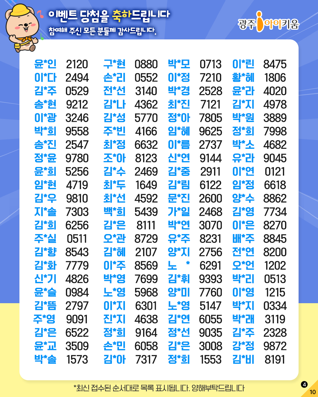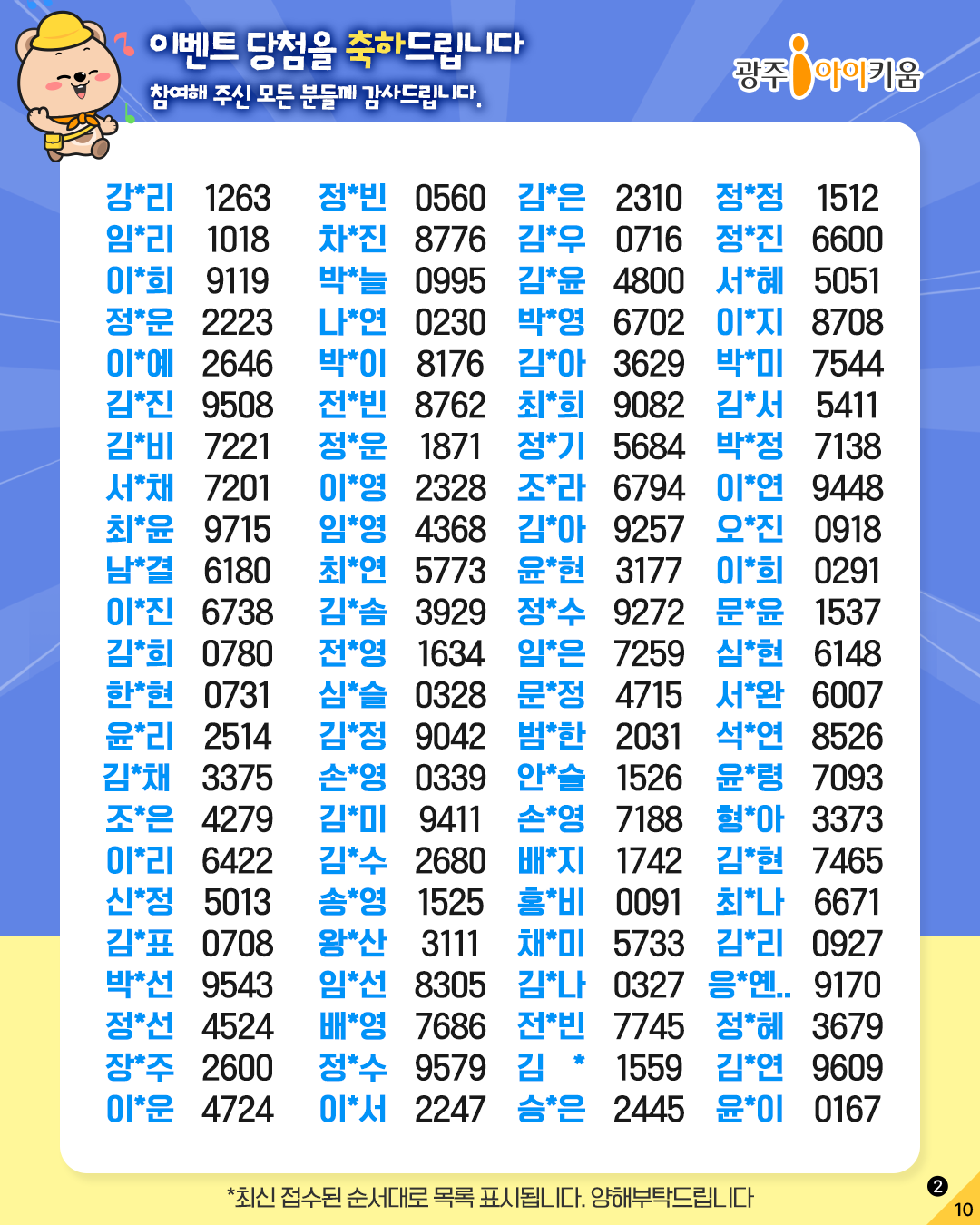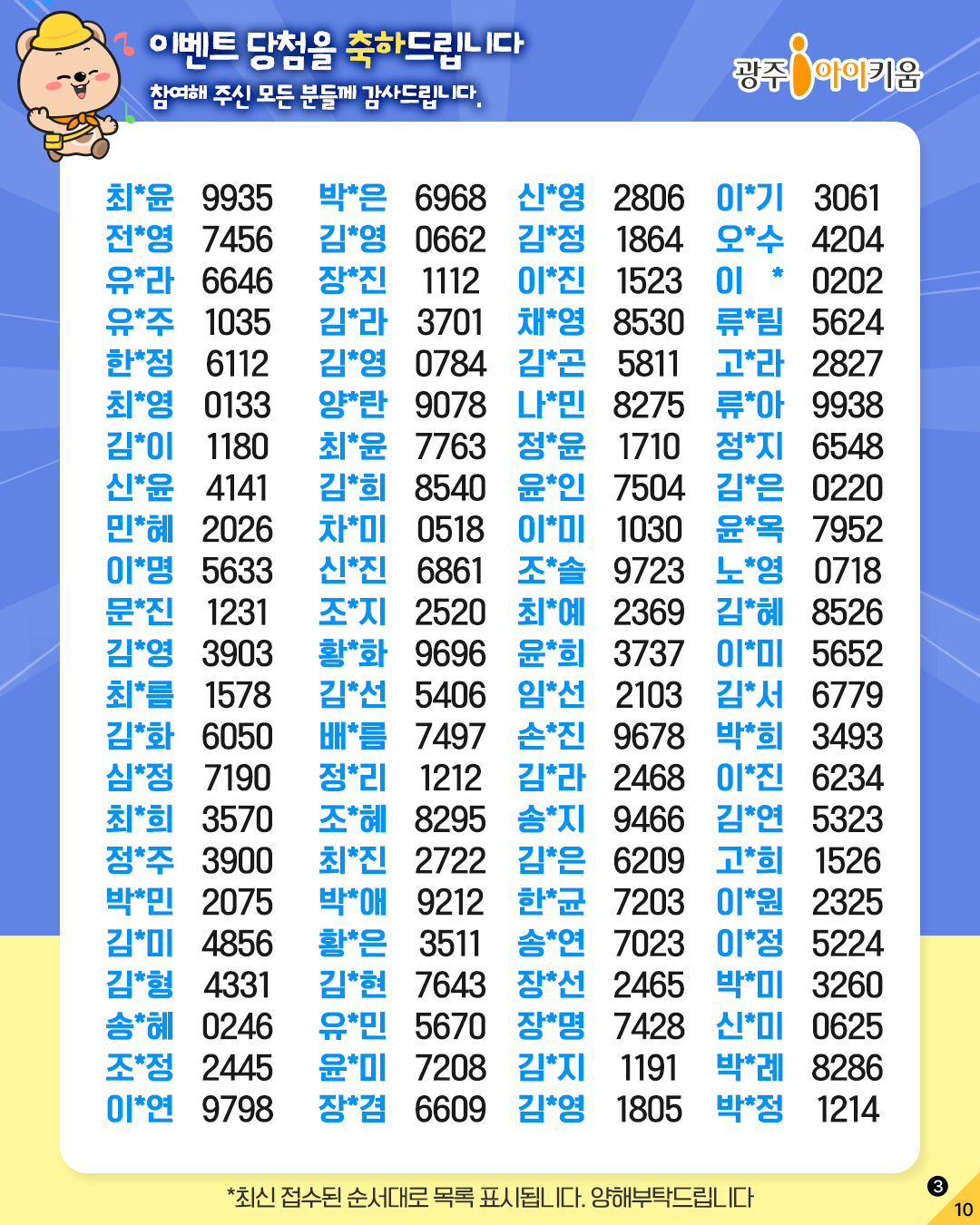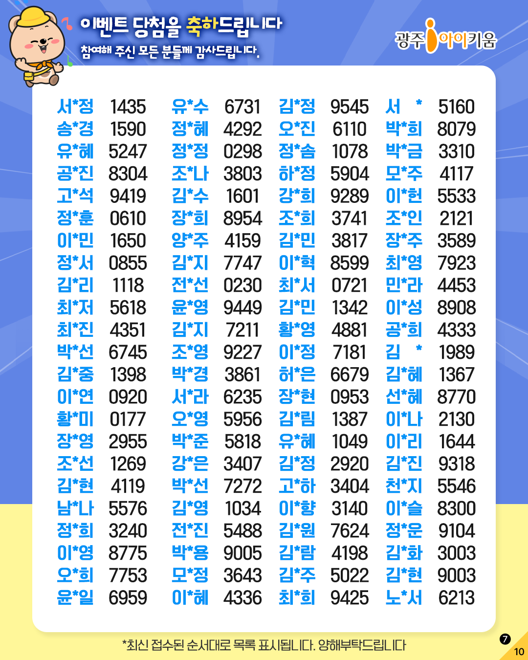 | 박*미 7544 | 박*미 3260 | 박*미 7292 | 박*민 2075 | 박*민 9867 | 박*비 1076 | 박*빈 7293 | 박*선 9543 |
