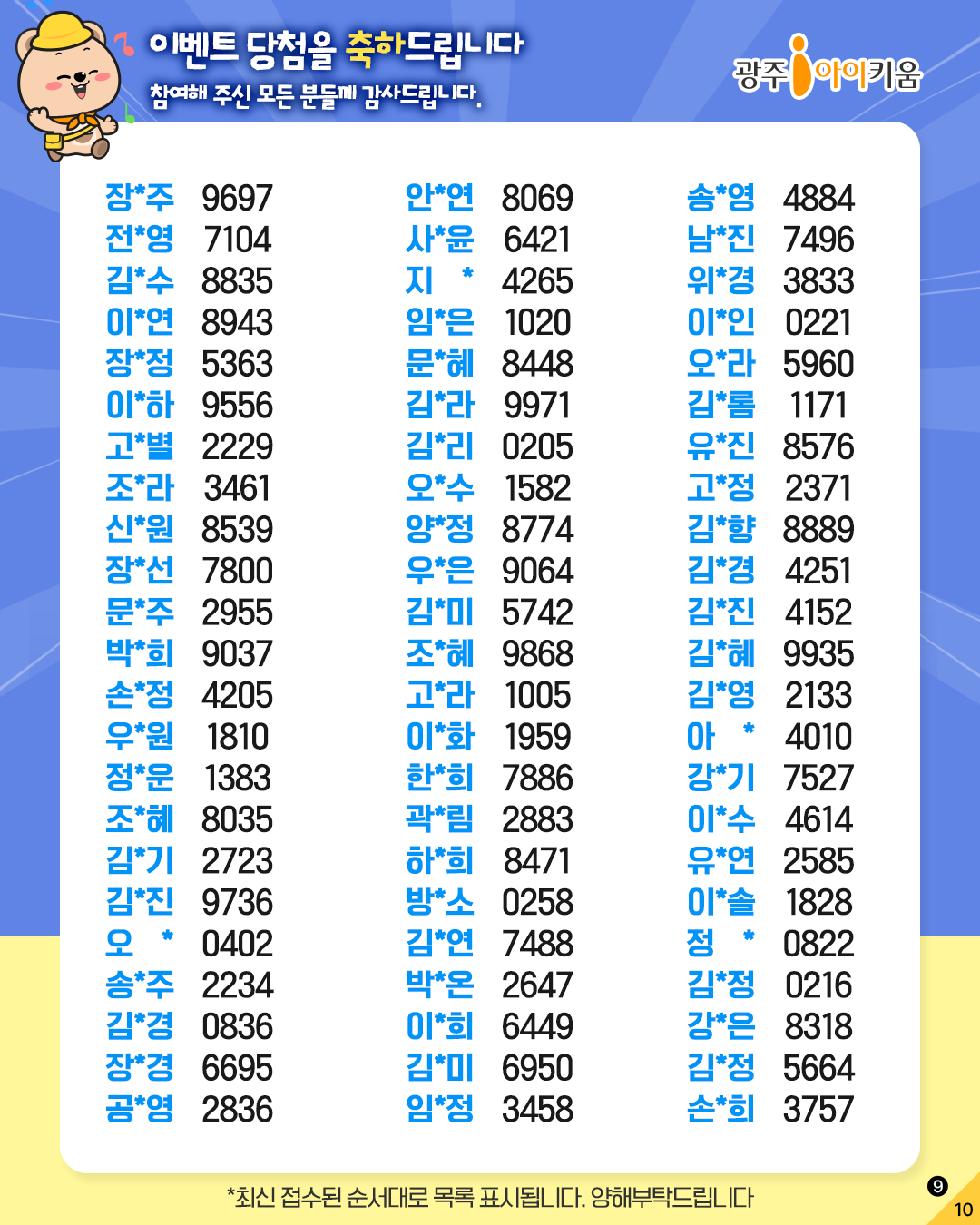 | 김*정 9545 | 김*정 2920 | 김*정 0216 | 김*정 5664 | 김*주 0529 | 김*주 2328 | 김*주 5022 | 김*주 5503 |