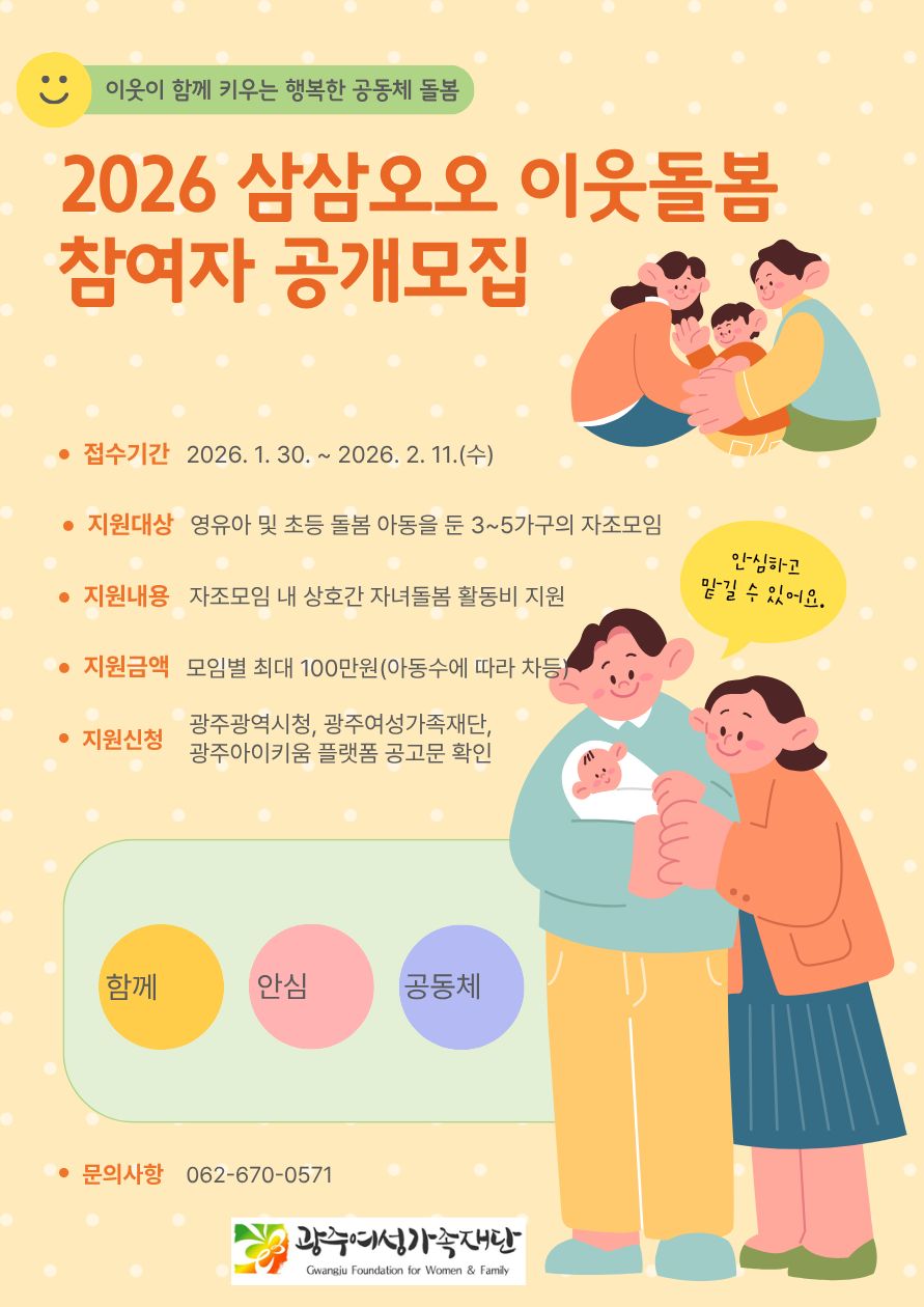 home 맘편한 내★일, 광주아이키움2.0 결혼·임신·출생 영유아 초·중·고 다양한 가족 일생활균형 커뮤니티 아동돌봄지원 소통방 나눔방 광주 아이키움 상담방 돌봄정보방 성폭력 피해 상담 및 사건지원 공지사항 [공모] 2026 삼삼오오 이웃돌봄 참여자 모집 공지기간 : 2026-01-27 11:19부터 2026-02-26 11:19까지 등록일 : 2026-01-27 11:22 작성자 : 운영자 조회수 : 471 첨부파일 2026 삼삼오오 이웃돌봄 모집 공고문.hwp 다운로드 자세한 내용은 첨부(공고문)를 확인해 주시기 바랍니다. 목록