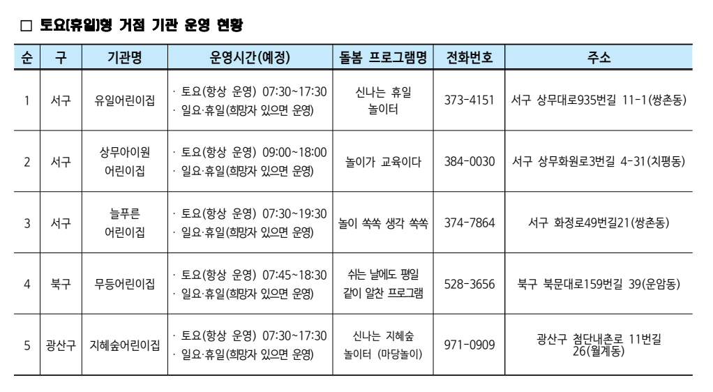(토요 휴일형) 오전 7:30 ~ 오후 19:30까지 보육지원 / 일요일 및 휴일에는 희망자 있을 시 운영