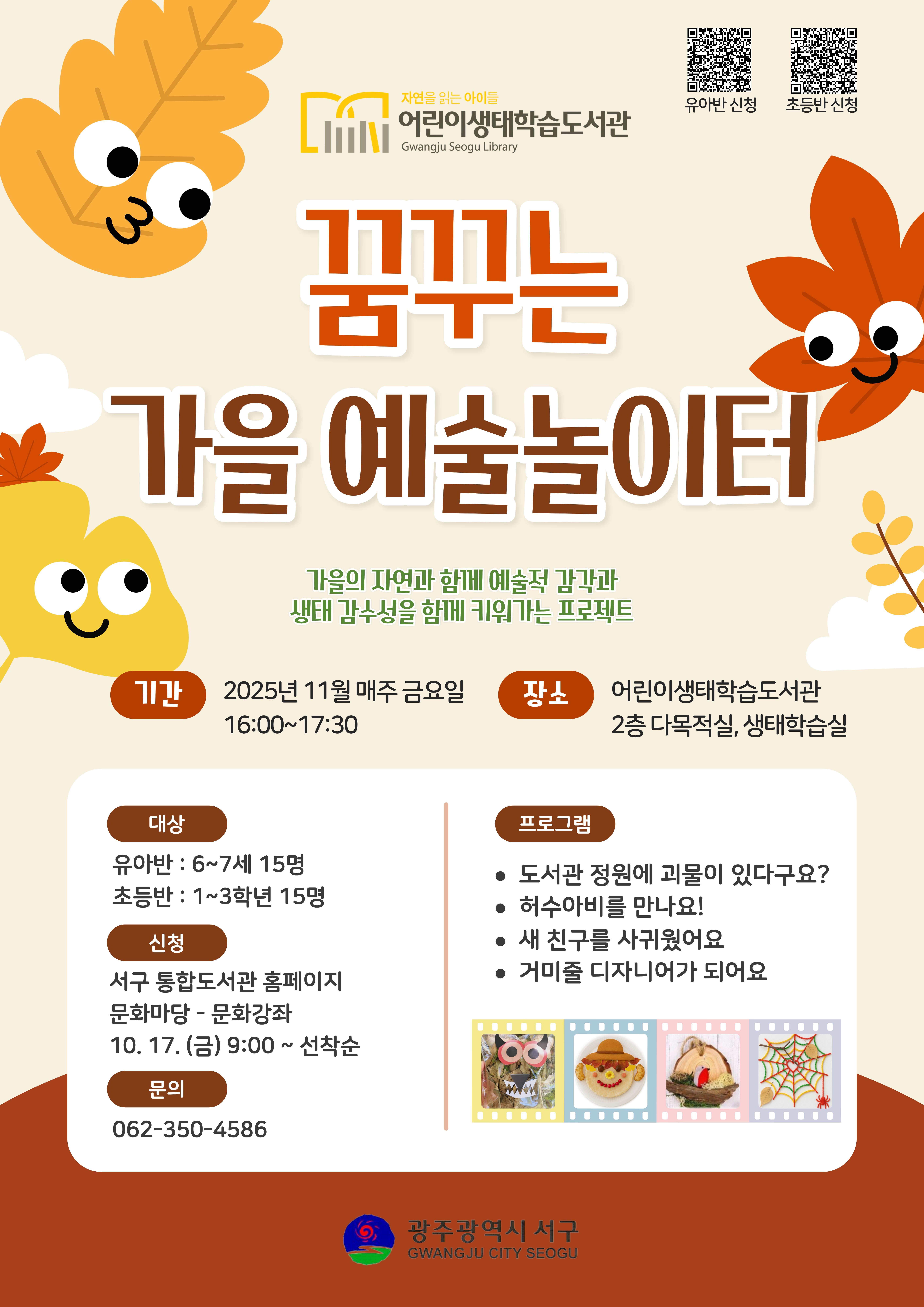home 맘편한 내★일, 광주아이키움2.0 결혼·임신·출생 영유아 초·중·고 다양한 가족 일생활균형 커뮤니티 아동돌봄지원 소통방 나눔방 광주 아이키움 상담방 돌봄정보방 성폭력 피해 상담 및 사건지원 공지사항 우리동네 돌봄정보 기관별 공지사항 [어린이생태학습도서관]꿈꾸는 가을 예술놀이터 등록일 : 2025-11-06 13:35 카테고리 : 카테고리 없음 작성자 : 운영자 조회수 : 69 ○ 강좌명 : 꿈꾸는 가을예술 놀이터(초등반)○ 기간 : 11/7 ~ 11/28 매주(금) 16:00~17:30○ 장소 : 어린이생태학습도서관 2층 다목적실○ 대상 : 초등학생 1~3학년 15명○ 내용 : 늦가을의 계절변화를 느끼고 자연물을 활용한 작품활동으로 예술적 감각과 생태감수성을 함께 키워가기○ 문의 : 062-350-4586출처: 서구통합도서관 목록