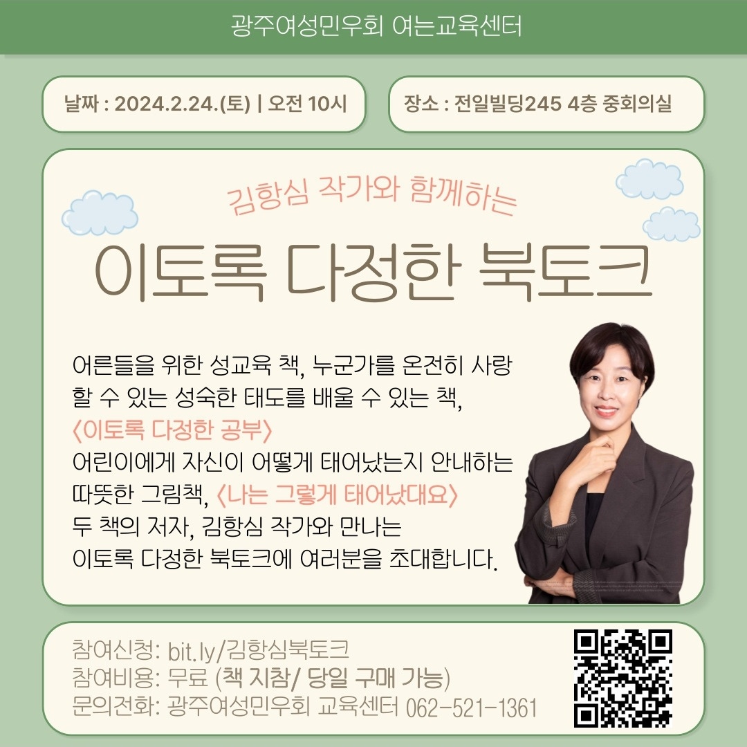 home 맘편한 내★일, 광주아이키움2.0 결혼·임신·출생 영유아 초·중·고 다양한 가족 일생활균형 커뮤니티 아동돌봄지원 소통방 나눔방 광주 아이키움 상담방 돌봄정보방 성폭력 피해 상담 및 사건지원 공지사항 우리동네 돌봄정보 기관별 공지사항 김항심 작가와 함께하는 이토록 다정한 북토크 등록일 : 2024-02-07 09:23 카테고리 : 카테고리 없음 작성자 : 운영자 조회수 : 268 < 김항심 작가와 함께하는 '이토록 다정한 북토크'>○행사기간 : 2024년 02월 24일 토요일 10시○행사장소 : 동구 전일빙딩 245, 4층 중회의실○참가비 : 무료(책 지참 / 당일 현장 구매 가능)○문의처 : 광주여성민우회 교육센터 (☎062-521-1361) 목록