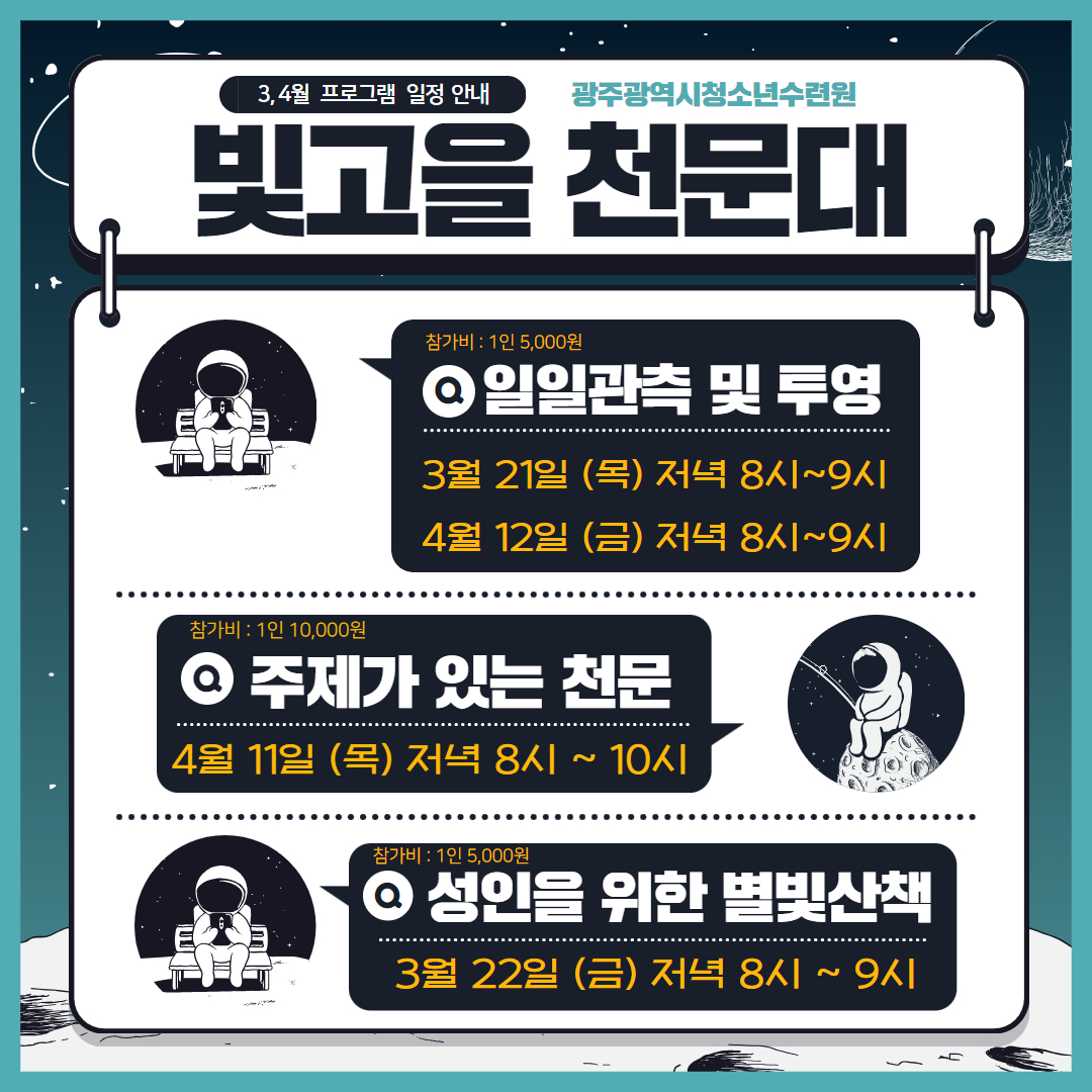 ○ 일 시 *일일관측 및 투영(1인 5,000원) : 3. 21 (목) / 4. 12 (금) *주제가 있는 천문활동(1인 10,000원) : 4. 11 (목) -내용 : 별자리/달/행성 관련 투영 및 관측, 강의 , 만들기 등 ○ 신 청 기 간 : 2024. 3. 12 (화) ~ 선착순 마감 ○ 문 의 : 062) 373 - 0942 ○ 안 내 : -강의 및 만들기는 주제천문활동에만 해당됩니다. -날씨상황으로 연기/취소 될 수 있습니다. -프로그램 3일 전 취소 시 전액 환불 이후 취소 시 환불 불가 -초등학교 2학년 이하의 아동은 보호자 동반해주셔야 합니다. <출처> 광주청소년수련원