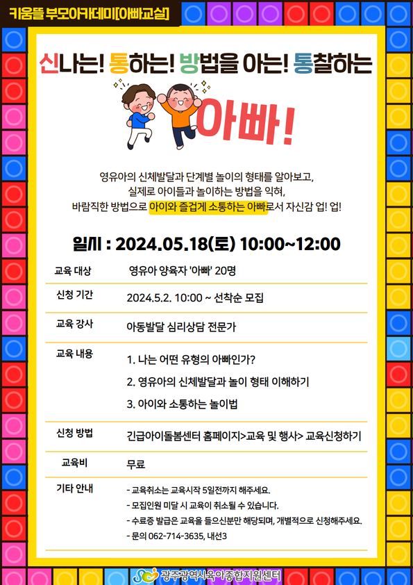 home 맘편한 내★일, 광주아이키움2.0 결혼·임신·출생 영유아 초·중·고 다양한 가족 일생활균형 커뮤니티 아동돌봄지원 소통방 나눔방 광주 아이키움 상담방 돌봄정보방 성폭력 피해 상담 및 사건지원 공지사항 우리동네 돌봄정보 기관별 공지사항 [광주육아종합지원센터] 신통방통! 아빠교실 등록일 : 2024-05-07 15:25 카테고리 : 카테고리 없음 작성자 : 운영자 조회수 : 230 <신나는! 통하는! 방법을 아는! 통찰하는 아빠!>🔸신청 기간2024. 5. 2 10:00 ~ 선착순🔸신청 방법긴급아이돌봄센터 홈페이지 > 교육 및 행사 > 교육신청하기[출처] 광주광역시육아종합지원센터 목록