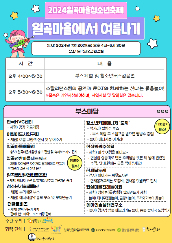 home 맘편한 내★일, 광주아이키움2.0 결혼·임신·출생 영유아 초·중·고 다양한 가족 일생활균형 커뮤니티 아동돌봄지원 소통방 나눔방 광주 아이키움 상담방 돌봄정보방 성폭력 피해 상담 및 사건지원 공지사항 우리동네 돌봄정보 기관별 공지사항 2024 일곡마을청소년축제 - 일곡마을에서 여름나기 등록일 : 2024-07-16 08:59 카테고리 : 카테고리 없음 작성자 : 운영자 조회수 : 220 <출처> 일곡청소년문화의집 목록