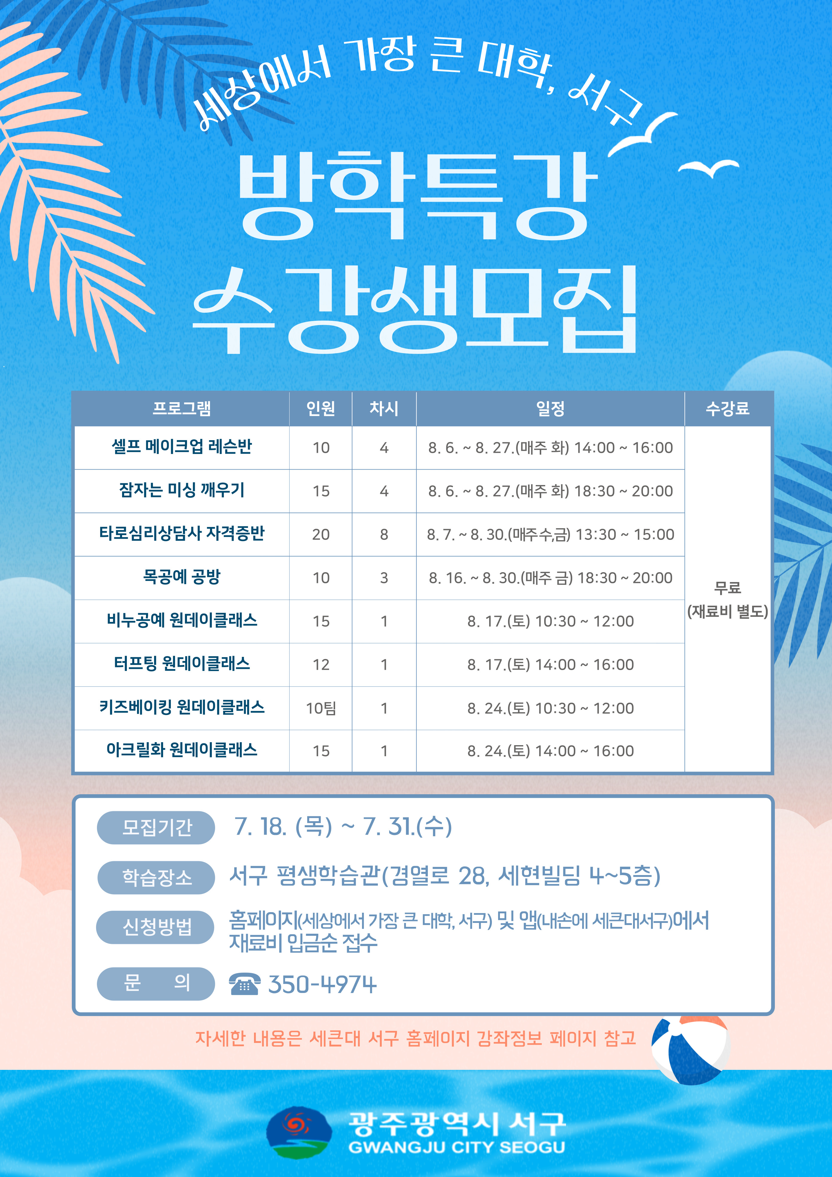 home 맘편한 내★일, 광주아이키움2.0 결혼·임신·출생 영유아 초·중·고 다양한 가족 일생활균형 커뮤니티 아동돌봄지원 소통방 나눔방 광주 아이키움 상담방 돌봄정보방 성폭력 피해 상담 및 사건지원 공지사항 우리동네 돌봄정보 기관별 공지사항 「세·큰·대」 서구, 하반기 방학특강 수강생 모집 등록일 : 2024-07-17 00:00 카테고리 : 카테고리 없음 작성자 : 운영자 조회수 : 198 목록