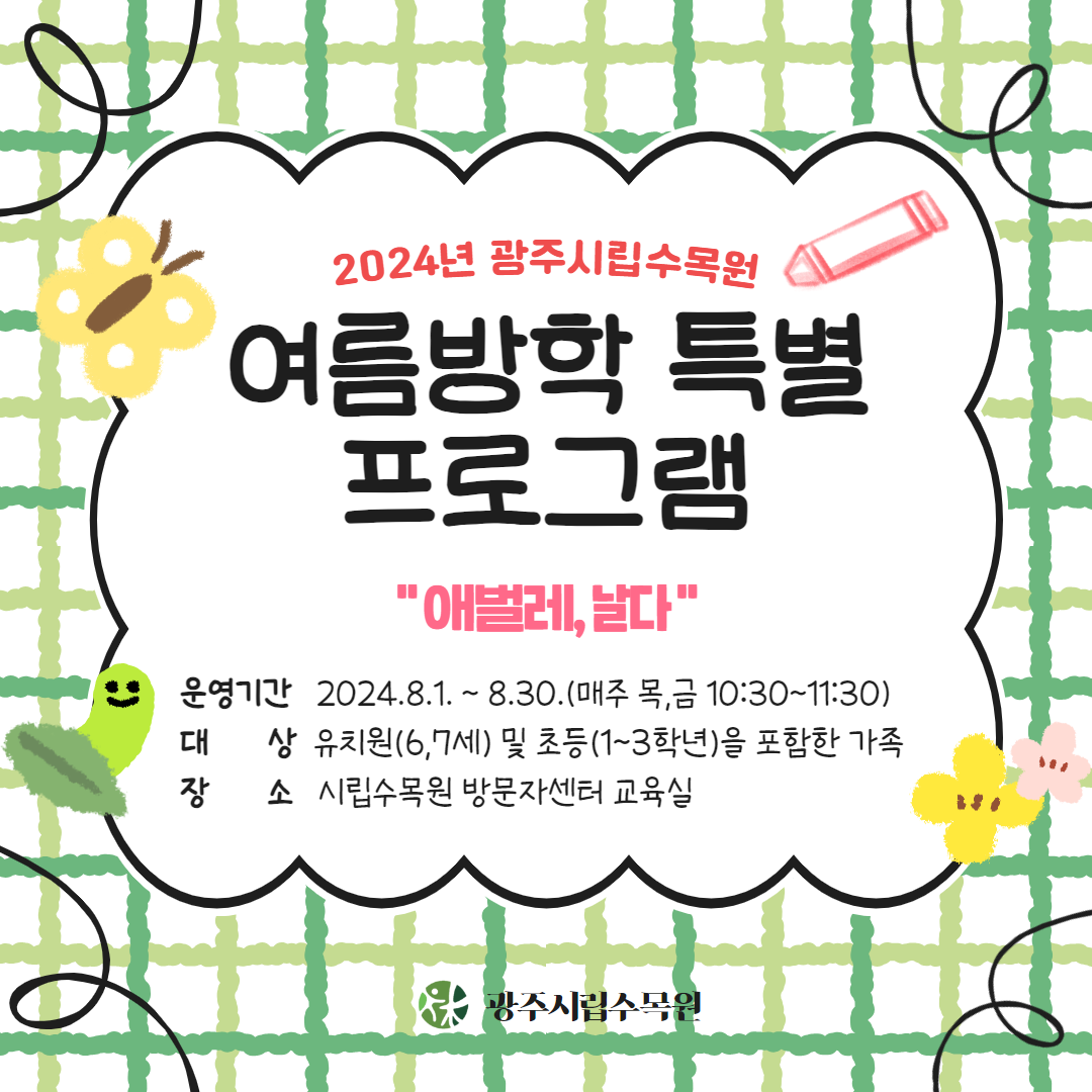 광주광역시립수목원은 여름방학을 맞아 6~10세 어린이를 대상으로 8월 한 달간 특별체험 프로그램 ‘애벌레, 날다’를 운영한다.