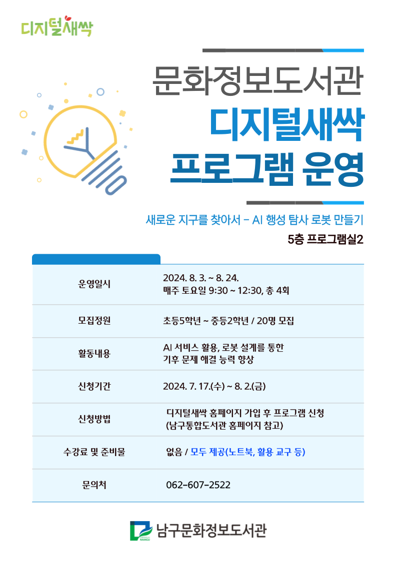 home 맘편한 내★일, 광주아이키움2.0 결혼·임신·출생 영유아 초·중·고 다양한 가족 일생활균형 커뮤니티 아동돌봄지원 소통방 나눔방 광주 아이키움 상담방 돌봄정보방 성폭력 피해 상담 및 사건지원 공지사항 우리동네 돌봄정보 기관별 공지사항 [남구문화정보도서관] 디지털새싹 프로그램 운영 등록일 : 2024-07-25 11:11 카테고리 : 카테고리 없음 작성자 : 운영자 조회수 : 201 [출처 : 남구통합도서관] 목록
