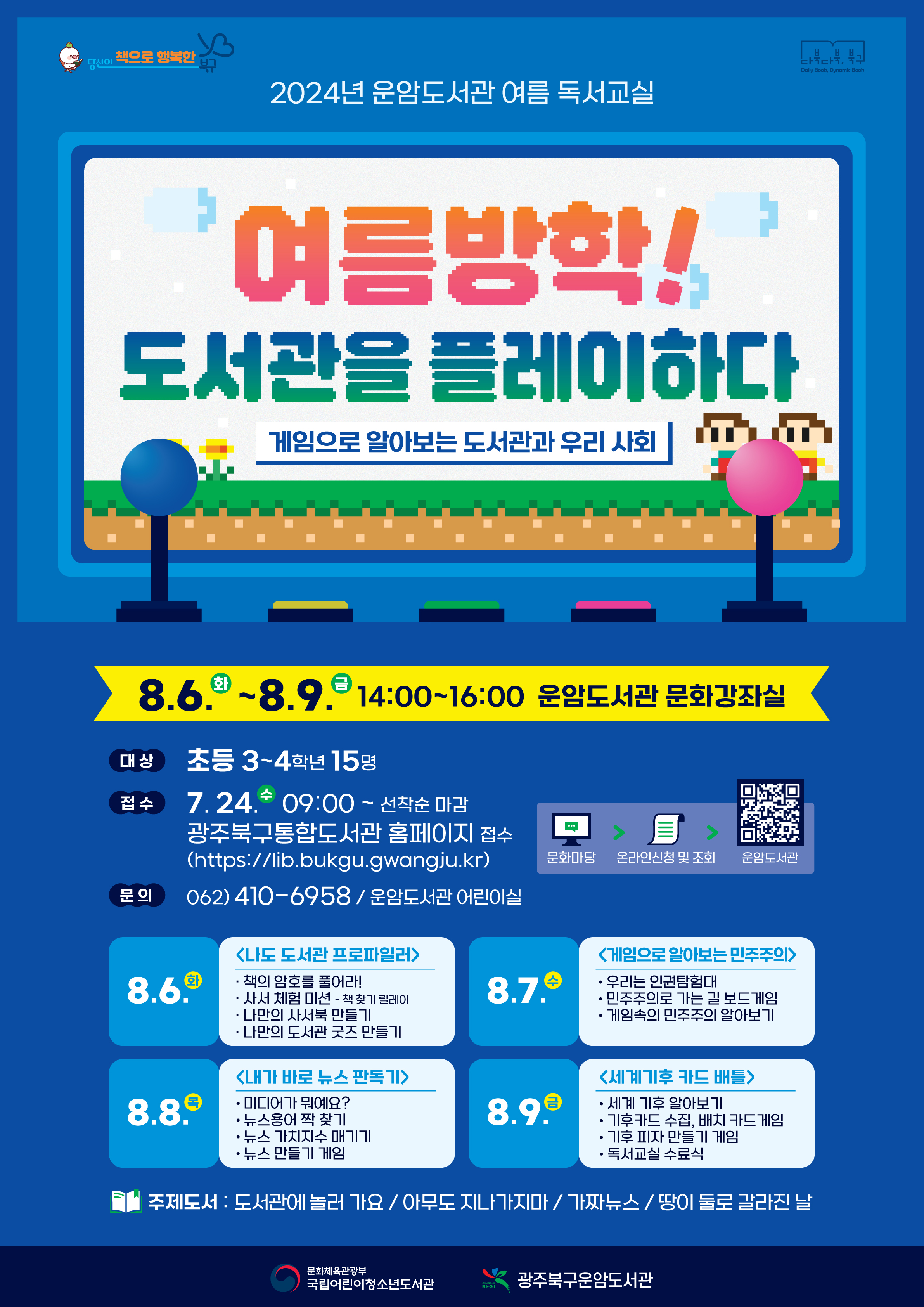 home 맘편한 내★일, 광주아이키움2.0 결혼·임신·출생 영유아 초·중·고 다양한 가족 일생활균형 커뮤니티 아동돌봄지원 소통방 나눔방 광주 아이키움 상담방 돌봄정보방 성폭력 피해 상담 및 사건지원 공지사항 우리동네 돌봄정보 기관별 공지사항 [운암도서관] 여름 독서교실! 등록일 : 2024-07-31 09:32 카테고리 : 카테고리 없음 작성자 : 운영자 조회수 : 199 [프로그램 안내]🔸기간08.06.(화) ~ 08.09.(금)14:00 ~ 16:00🔸장소운암도서관 문화강좌실🔸대상초등 3~4학년 15명🔸접수07.24.(수) 9:00 ~ 선착순 마감광주북구통합도서관 홈페이지 접수🔸문의운암도서관 어린이실 (062-410-6958) 목록