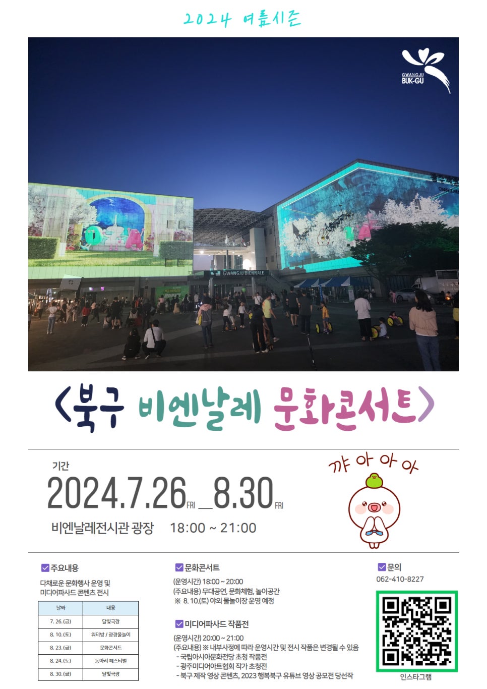 home 맘편한 내★일, 광주아이키움2.0 결혼·임신·출생 영유아 초·중·고 다양한 가족 일생활균형 커뮤니티 아동돌봄지원 소통방 나눔방 광주 아이키움 상담방 돌봄정보방 성폭력 피해 상담 및 사건지원 공지사항 우리동네 돌봄정보 기관별 공지사항 [북구] 비엔날레 문화콘서트 7월~8월 등록일 : 2024-07-31 09:58 카테고리 : 카테고리 없음 작성자 : 운영자 조회수 : 191 여름 맞이 '북구 비엔날레 문화콘서트'7월 26일(금) ~ 8월 30일(금) 비엔날레전시관 광장 _ 18:00 ~ 21:00 [출처 : 광주광역시 북구] 목록