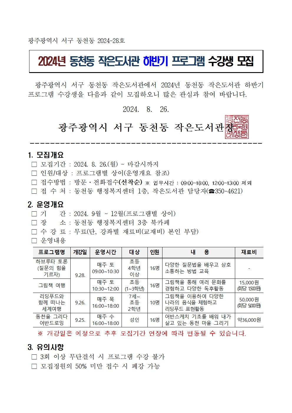 home 맘편한 내★일, 광주아이키움2.0 결혼·임신·출생 영유아 초·중·고 다양한 가족 일생활균형 커뮤니티 아동돌봄지원 소통방 나눔방 광주 아이키움 상담방 돌봄정보방 성폭력 피해 상담 및 사건지원 공지사항 우리동네 돌봄정보 기관별 공지사항 2024년 동천동 작은도서관 하반기 프로그램 수강생 모집 등록일 : 2024-08-28 00:00 카테고리 : 카테고리 없음 작성자 : 운영자 조회수 : 242 다운로드 목록