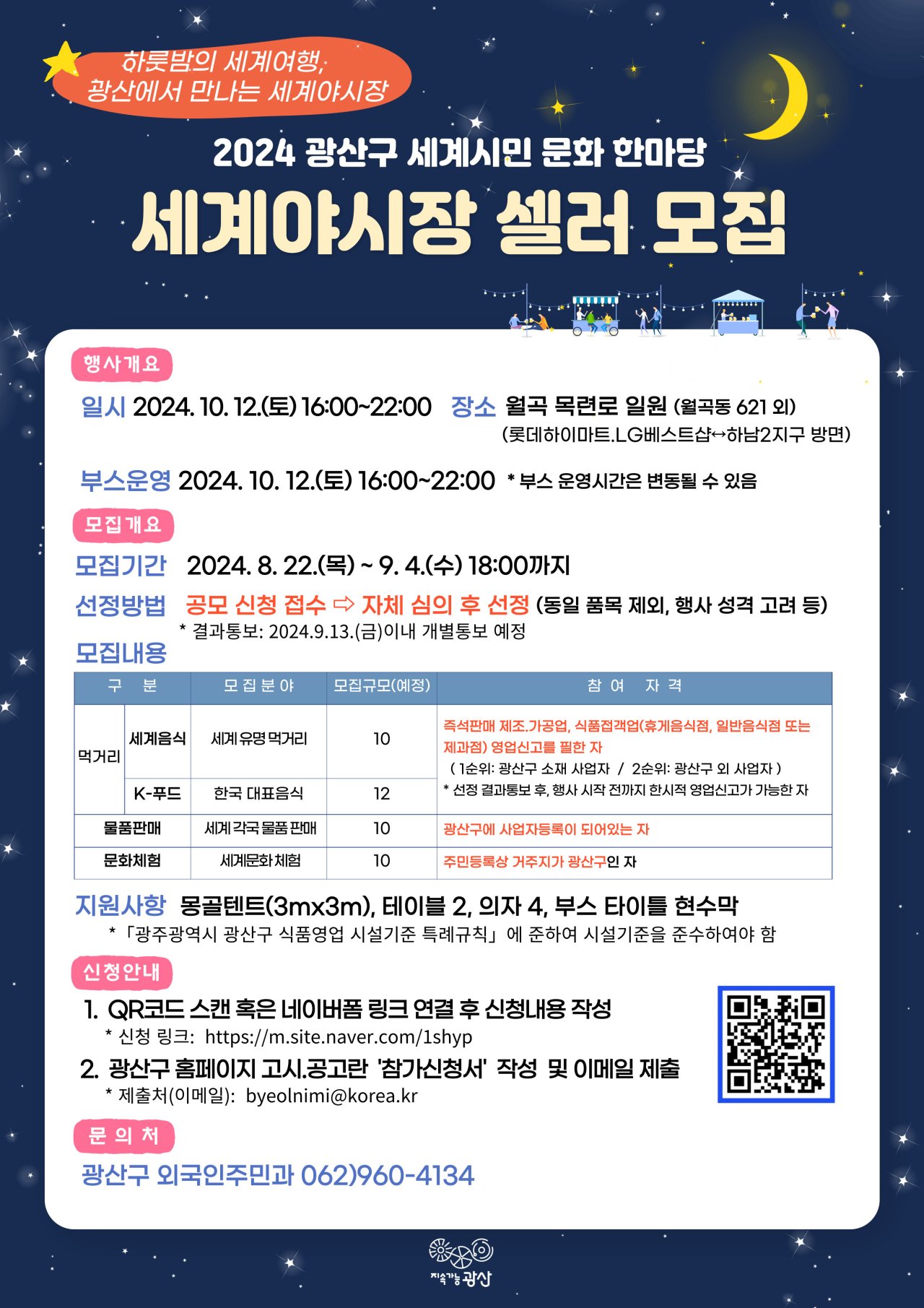 home 맘편한 내★일, 광주아이키움2.0 결혼·임신·출생 영유아 초·중·고 다양한 가족 일생활균형 커뮤니티 아동돌봄지원 소통방 나눔방 광주 아이키움 상담방 돌봄정보방 성폭력 피해 상담 및 사건지원 공지사항 우리동네 돌봄정보 기관별 공지사항 2024 광산 세계야시장🍱 등록일 : 2024-09-26 08:31 카테고리 : 카테고리 없음 작성자 : 운영자 조회수 : 269 글로벌 푸드와 함께하는 맛있는 모험광산 세계야시장! [출처 : 광주광역시] 목록