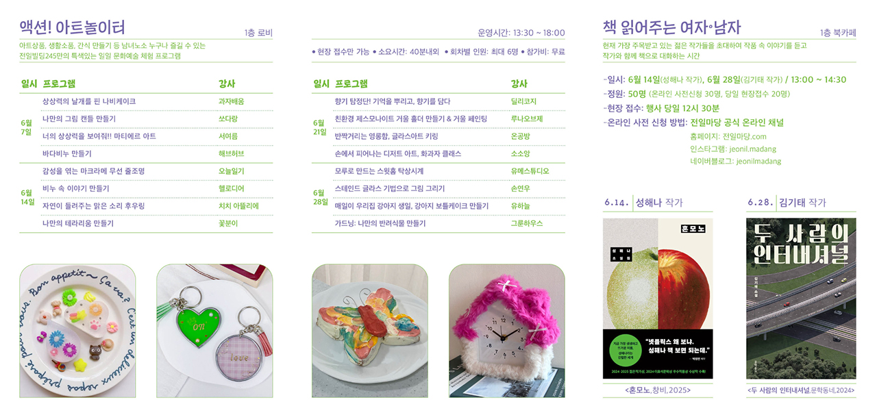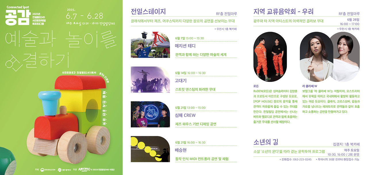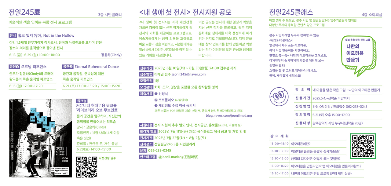 home 맘편한 내★일, 광주아이키움2.0 결혼·임신·출생 영유아 초·중·고 다양한 가족 일생활균형 커뮤니티 아동돌봄지원 소통방 나눔방 광주 아이키움 상담방 돌봄정보방 성폭력 피해 상담 및 사건지원 공지사항 우리동네 돌봄정보 기관별 공지사항 [동구] 전일빌딩 245 시민문화체험 특화 프로그램 "공감" 등록일 : 2025-06-12 11:37 카테고리 : 카테고리 없음 작성자 : 운영자 조회수 : 209 첨부파일 예술과 놀이를 공감.jpg 다운로드 📌기간 : 6.7.(토) ~ 6.28.(토) *매주운영📌시간 : 13:30 ~ 18:00 [출처: 광주광역시청] 목록