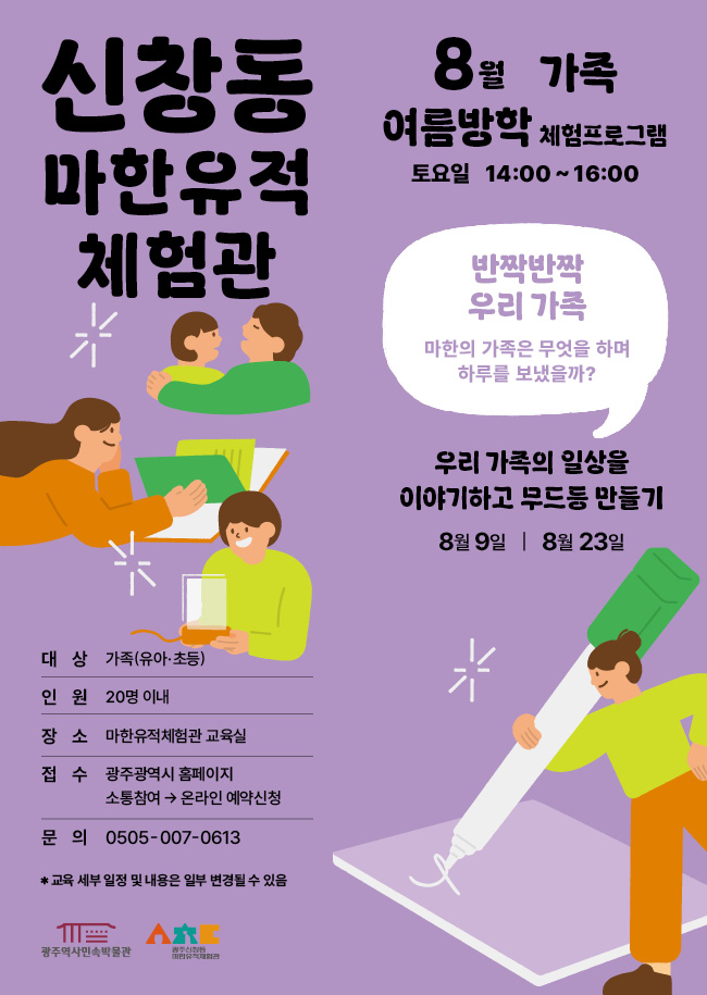 home 맘편한 내★일, 광주아이키움2.0 결혼·임신·출생 영유아 초·중·고 다양한 가족 일생활균형 커뮤니티 아동돌봄지원 소통방 나눔방 광주 아이키움 상담방 돌봄정보방 성폭력 피해 상담 및 사건지원 공지사항 우리동네 돌봄정보 기관별 공지사항 [광주역사민속박물관] 8월 가족 여름방학 체험프로그램 등록일 : 2025-08-07 14:29 카테고리 : 카테고리 없음 작성자 : 운영자 조회수 : 87 [출처 : 국립역사민속박물관]8월 9일 / 8월 23일○ 대상 : 가족(유아,초등)○ 장소 : 마한유적체험관 교육실○ 접수 : 광주광역시 홈페이지 소통참여 → 온라인 예약신청○ 문의 : 0505 - 007 - 0613 목록