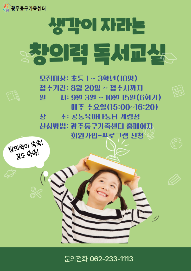 home 맘편한 내★일, 광주아이키움2.0 결혼·임신·출생 영유아 초·중·고 다양한 가족 일생활균형 커뮤니티 아동돌봄지원 소통방 나눔방 광주 아이키움 상담방 돌봄정보방 성폭력 피해 상담 및 사건지원 공지사항 우리동네 돌봄정보 기관별 공지사항 [광주광역시 동구가족센터] 생각이 자라나는 창의력 독서교실 등록일 : 2025-08-21 14:40 카테고리 : 카테고리 없음 작성자 : 운영자 조회수 : 76 [출처 : 광주동구가족센터] 목록