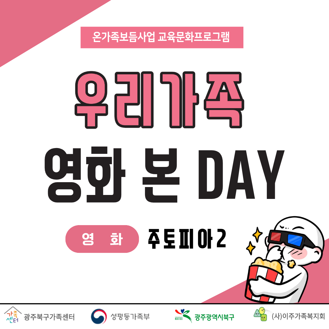 home 맘편한 내★일, 광주아이키움2.0 결혼·임신·출생 영유아 초·중·고 다양한 가족 일생활균형 커뮤니티 아동돌봄지원 소통방 나눔방 광주 아이키움 상담방 돌봄정보방 성폭력 피해 상담 및 사건지원 공지사항 우리동네 돌봄정보 기관별 공지사항 [북구가족센터] 우리가족 영화 본 DAY 등록일 : 2025-11-19 10:19 카테고리 : 카테고리 없음 작성자 : 운영자 조회수 : 71 행사기간2025-11-29 접수기간2025-11-17 09:00 ~ 2025-11-28 15:00참여대상정원150명행사내용우리가족 영화 본 DAY진행장소광주광역시 광산구 임방울대로826번길 29-31 (쌍암동) CGV광주출처:가족센터 목록