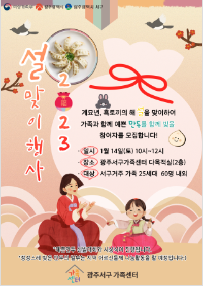 광주서구 가족센터에서는 2023 설명절을 맞아 가족과 함께 할 수 있는 무료체험활동을 준비했습니다