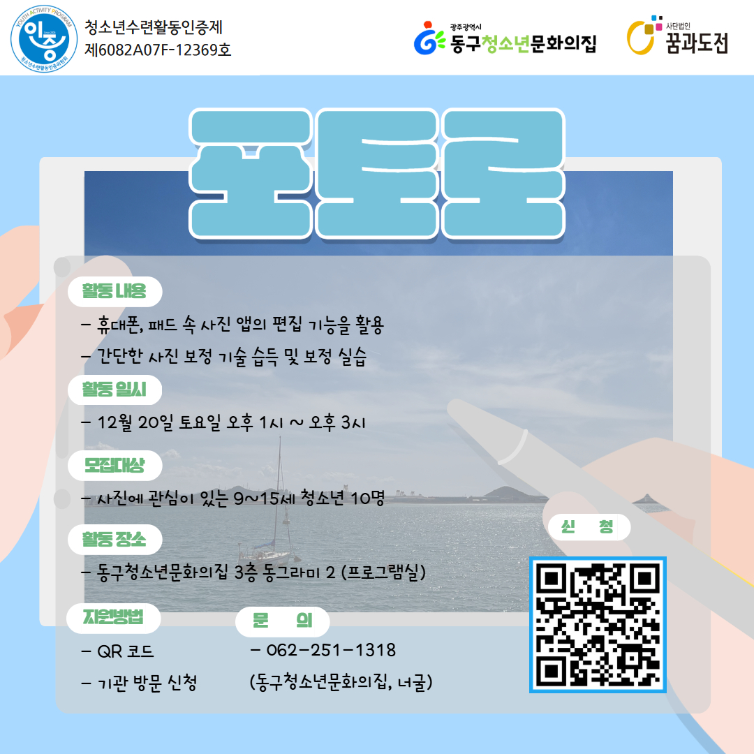 간단하게 사진 편집 용어를 알아보고 인생샷을 만들어 볼 수 있는 청소년수련활동인증제 프로그램 '포토로'의 참여자를 모집합니다!