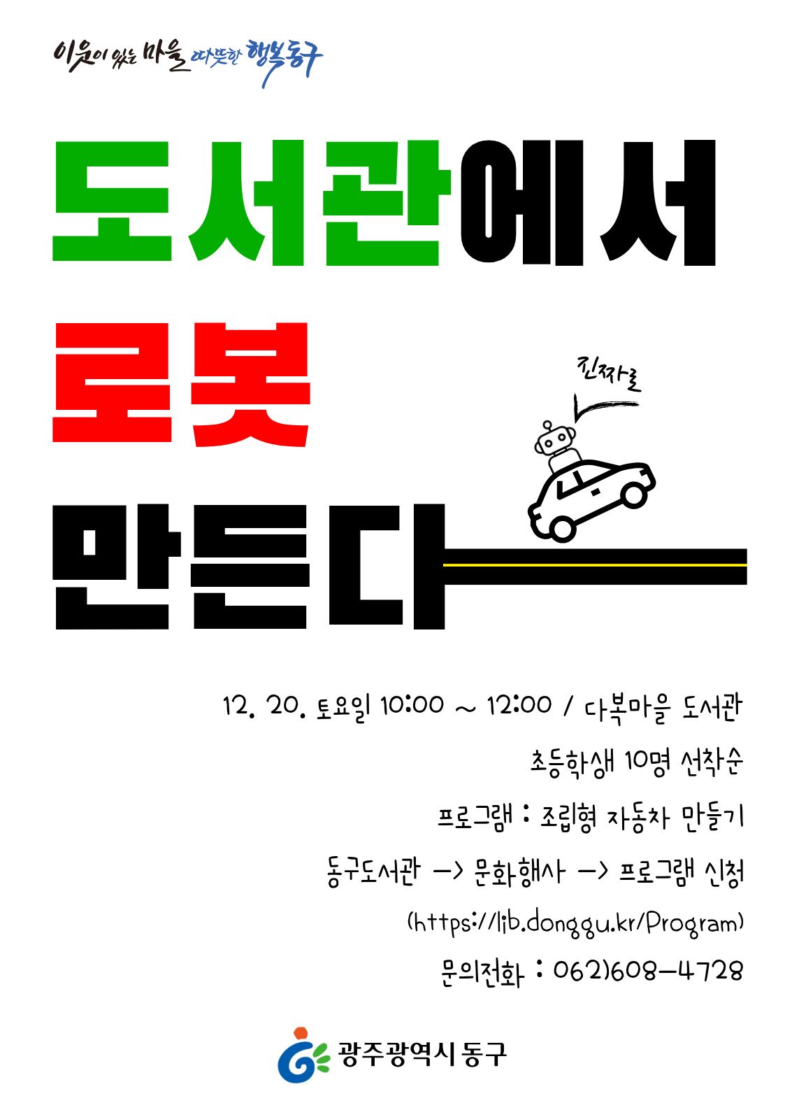 home 맘편한 내★일, 광주아이키움2.0 결혼·임신·출생 영유아 초·중·고 다양한 가족 일생활균형 커뮤니티 아동돌봄지원 소통방 나눔방 광주 아이키움 상담방 돌봄정보방 성폭력 피해 상담 및 사건지원 공지사항 우리동네 돌봄정보 기관별 공지사항 [다복마을도서관]도서관에서 로봇만든다 등록일 : 2025-12-09 14:05 카테고리 : 카테고리 없음 작성자 : 운영자 조회수 : 80 ※ 12월 9일 09시부터 모집 시작합니다. ※ 1회차 프로그램임을 감안하여, 노소 관련해서는 책정원 규정을 따를 예정입니다. ※ 많은 참여 바랍니다. 출처:광주동구도서관 목록