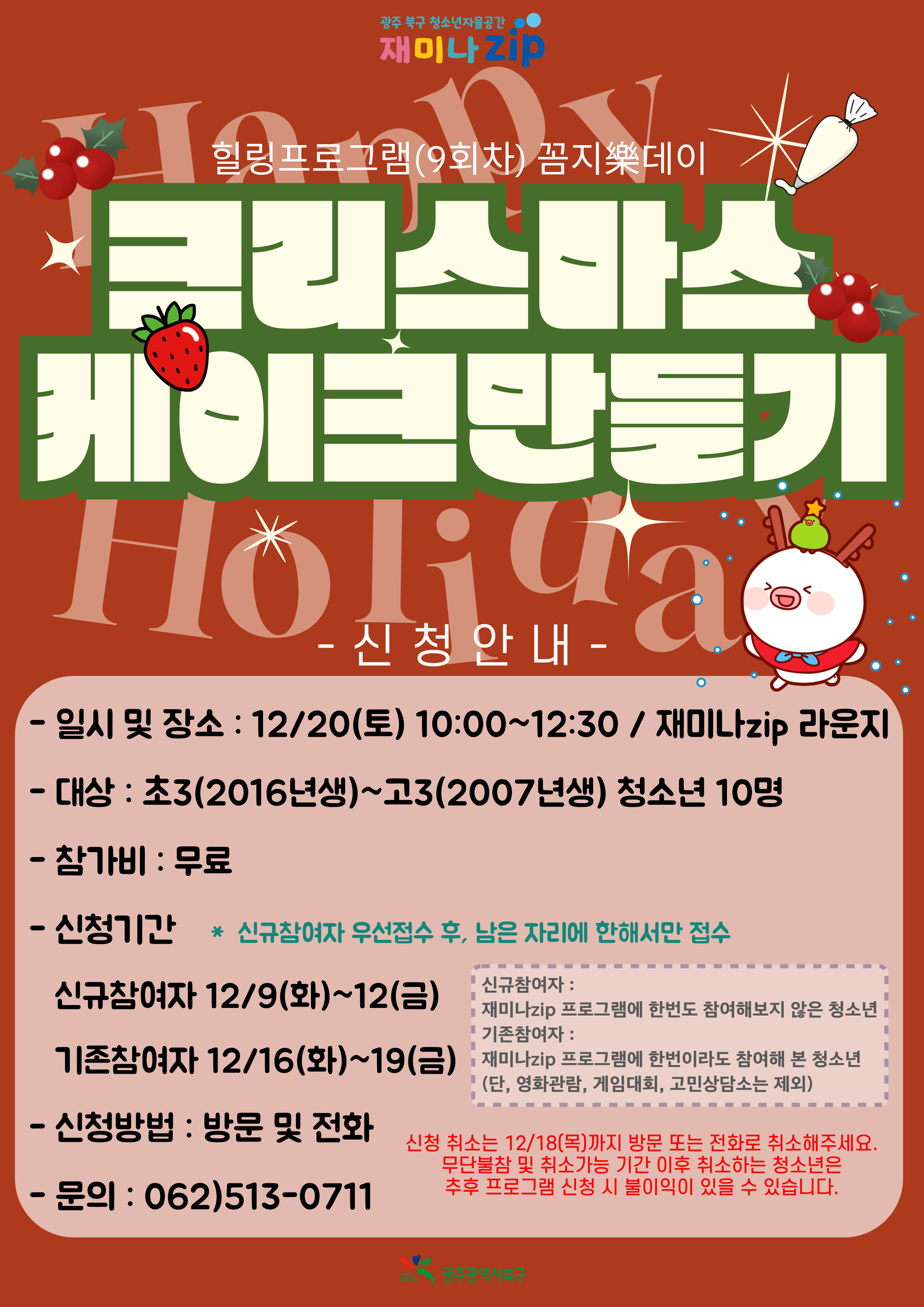 home 맘편한 내★일, 광주아이키움2.0 결혼·임신·출생 영유아 초·중·고 다양한 가족 일생활균형 커뮤니티 아동돌봄지원 소통방 나눔방 광주 아이키움 상담방 돌봄정보방 성폭력 피해 상담 및 사건지원 공지사항 우리동네 돌봄정보 기관별 공지사항 [북구청소년자율공간]크리스마스 케이크 만들기 등록일 : 2025-12-10 11:01 카테고리 : 카테고리 없음 작성자 : 운영자 조회수 : 83 출처:북구청소년자율공간 목록