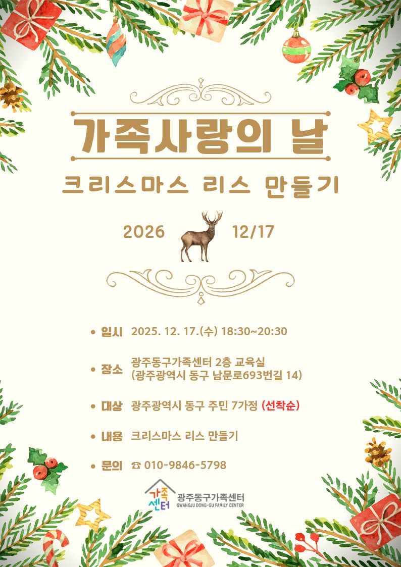 home 맘편한 내★일, 광주아이키움2.0 결혼·임신·출생 영유아 초·중·고 다양한 가족 일생활균형 커뮤니티 아동돌봄지원 소통방 나눔방 광주 아이키움 상담방 돌봄정보방 성폭력 피해 상담 및 사건지원 공지사항 우리동네 돌봄정보 기관별 공지사항 [동구가족센터]크리스마스 리스 만들기 등록일 : 2025-12-15 13:34 카테고리 : 카테고리 없음 작성자 : 운영자 조회수 : 65 행사기간 2025-12-17 ~ 2025-12-17 접수기간 2025-12-12 10:40 ~ 2025-12-15 13:00 참여대상 광주 동구 주민 행사내용 가족과 함께 크리스마스 리스 만들기 진행장소 광주광역시 동구 남문로693번길 14 (학동) 광주동구가족센터 출처:가족센터 목록
